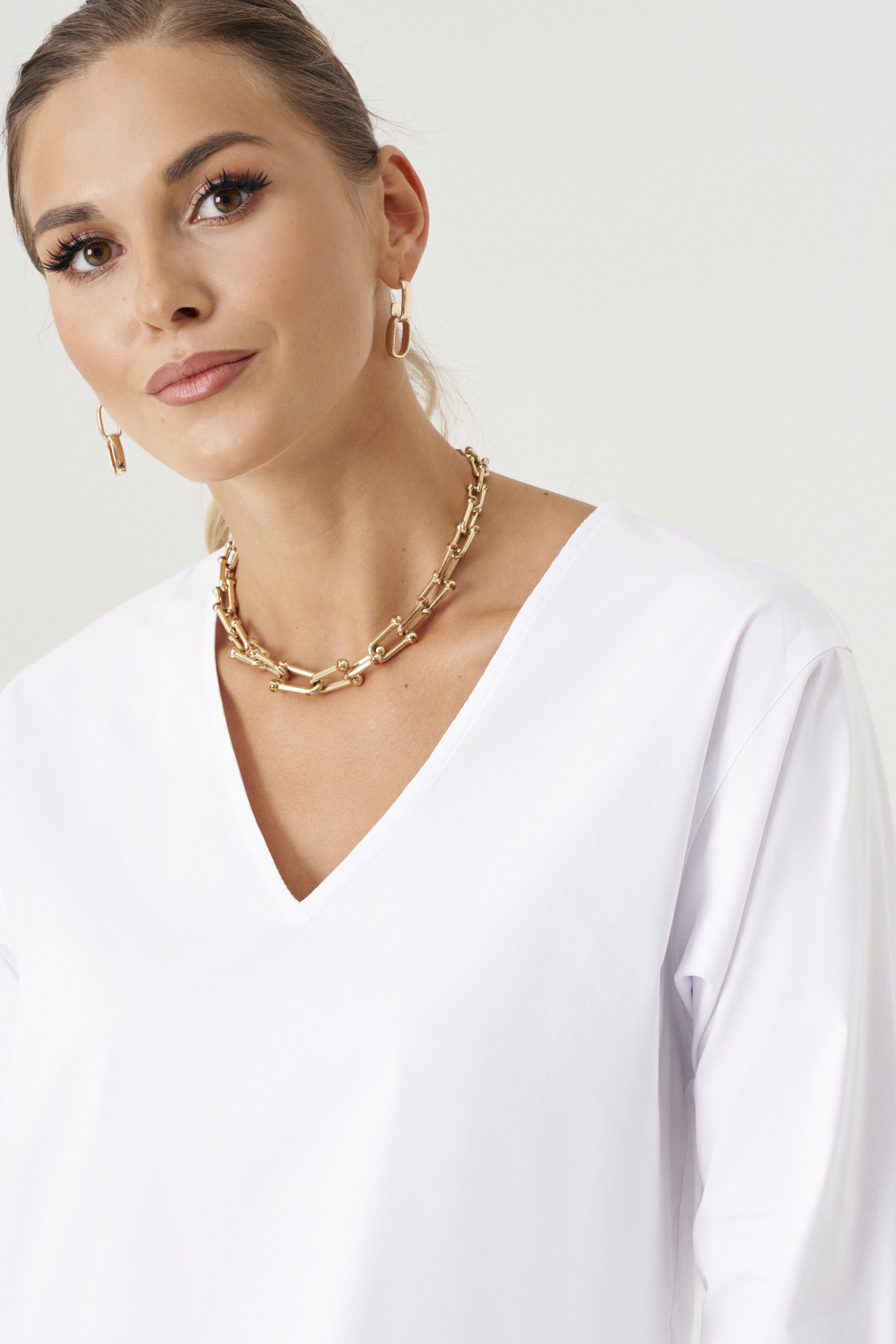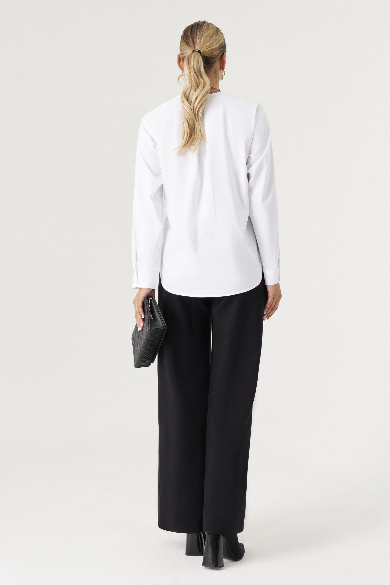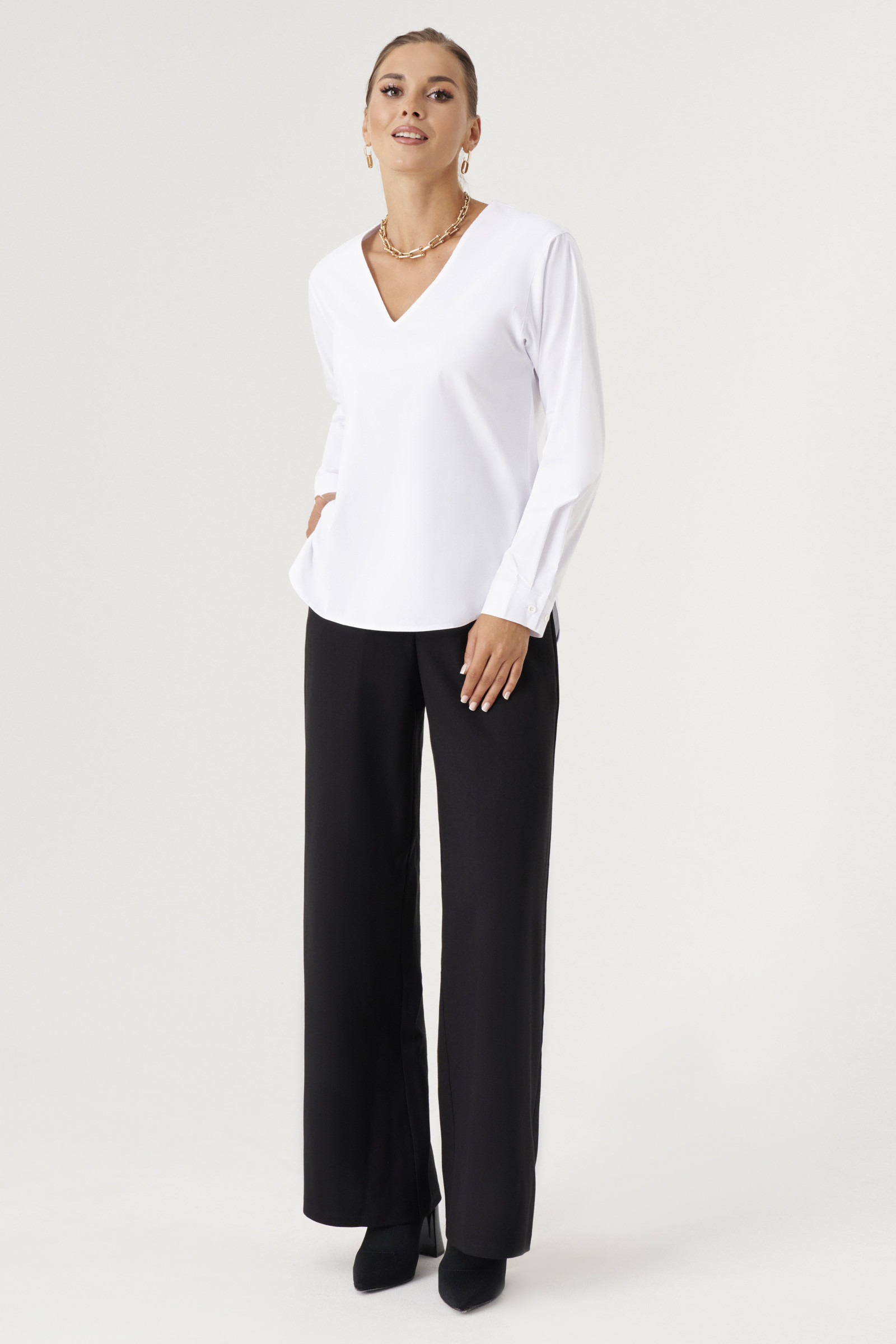 Блуза женская из хлопковой ткани для повседневной носки. Блуза свободная с длинным рукавом. Горловина V- образная. Рукава оформлены манжетой. Низ закругленный. По спинке изделия встречная складка.