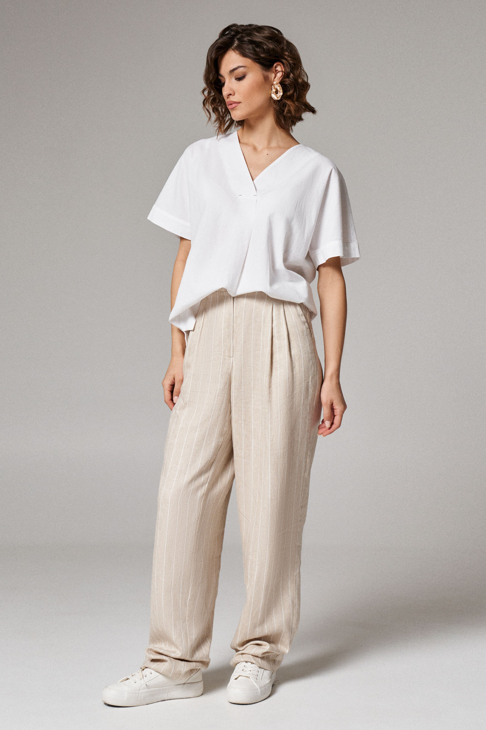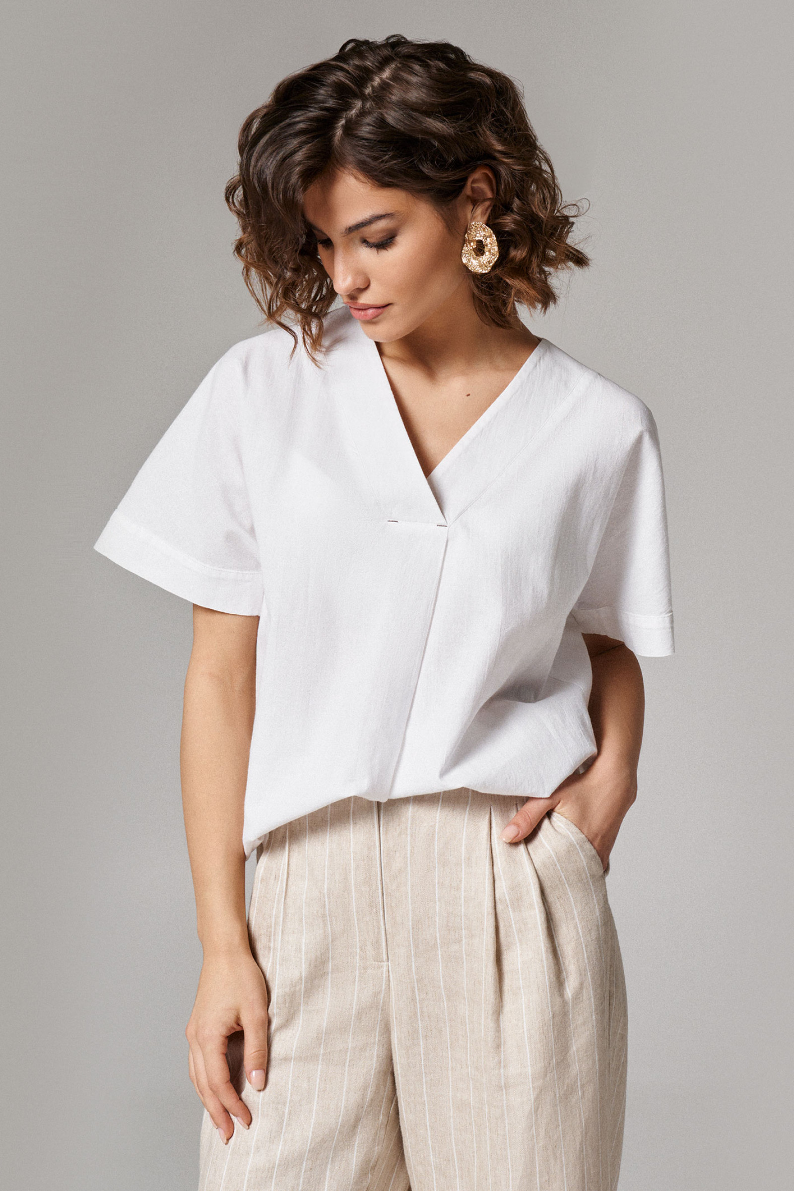 Блуза женская из хлопчатобумажной ткани для повседневной носки. Блуза прямого силуэта. Перед со складкой от горловины. Спинка со средним швом. В боковом шве имеются небольшие разрезы. Горловина V-образная с нахлестом. Рукав цельнокроеные, короткие. Низ рукава оформлен притачной манжетой. Стильная и легкая блузка, которая безусловно произведет на вас приятное впечатление, а также отлично будет седеть на любой фигуре.