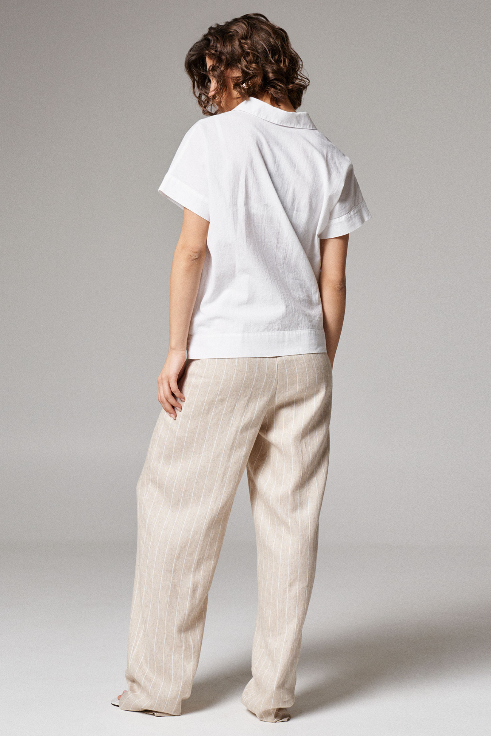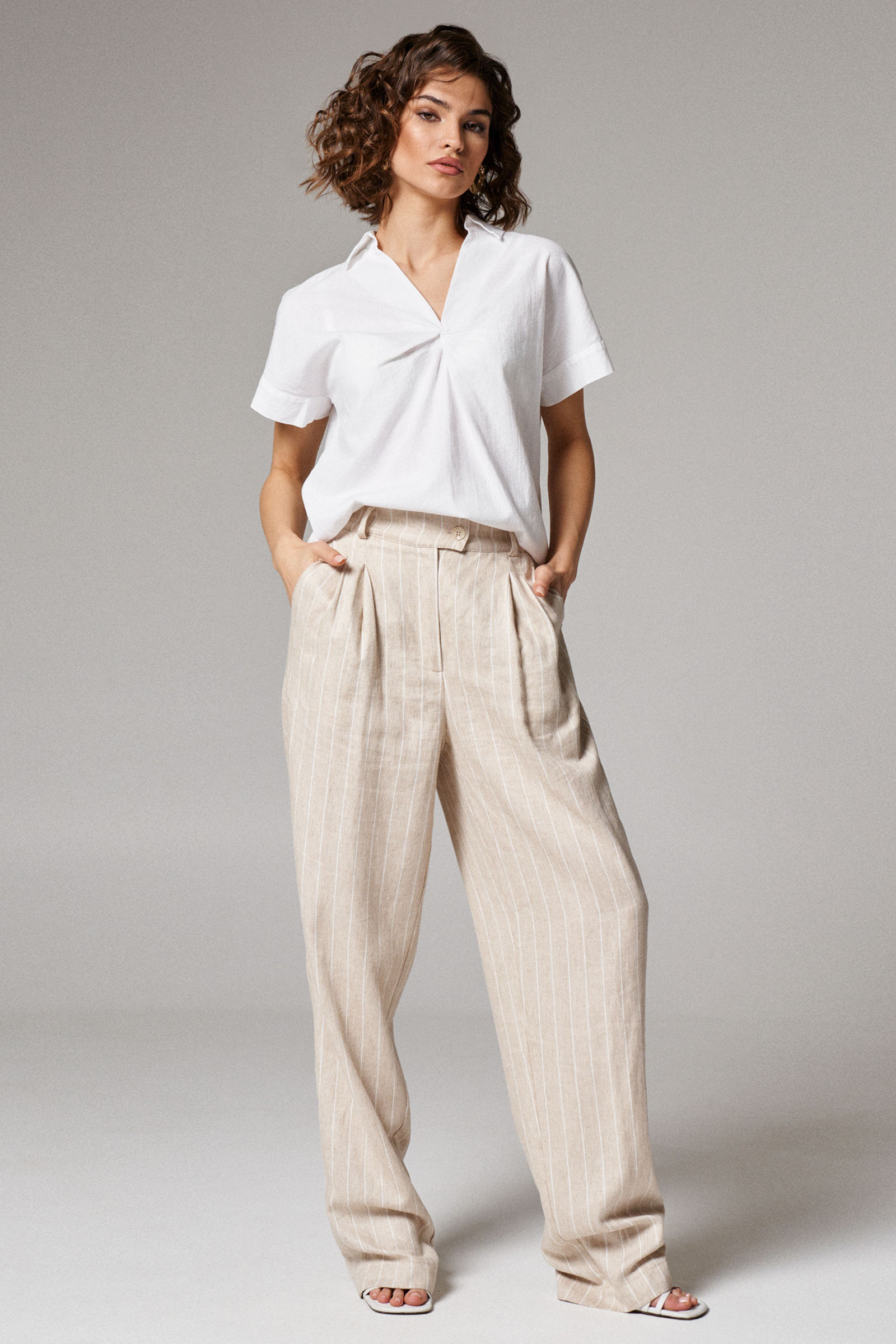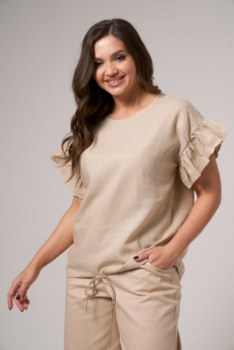 Блуза женская из хлопковой ткани для повседневной носки. Блуза свободная прямого кроя с коротким рукавом. Рукав оформлен притачной манжетой. На передней части изделия дизайнерский элемент. В боковых швах изделия разрезы.