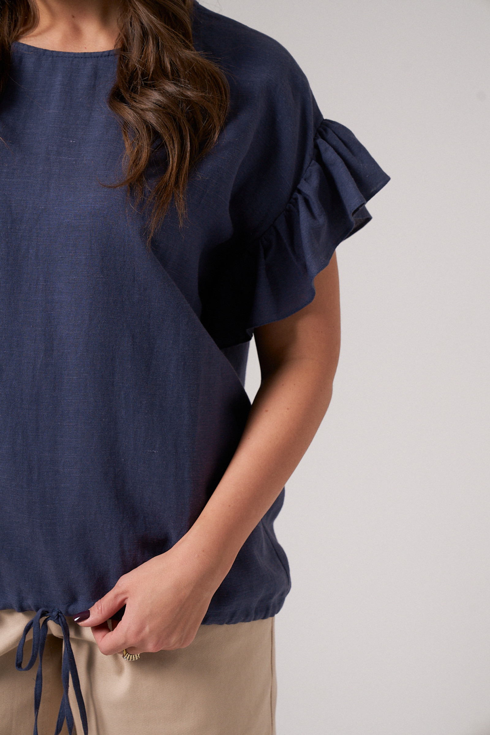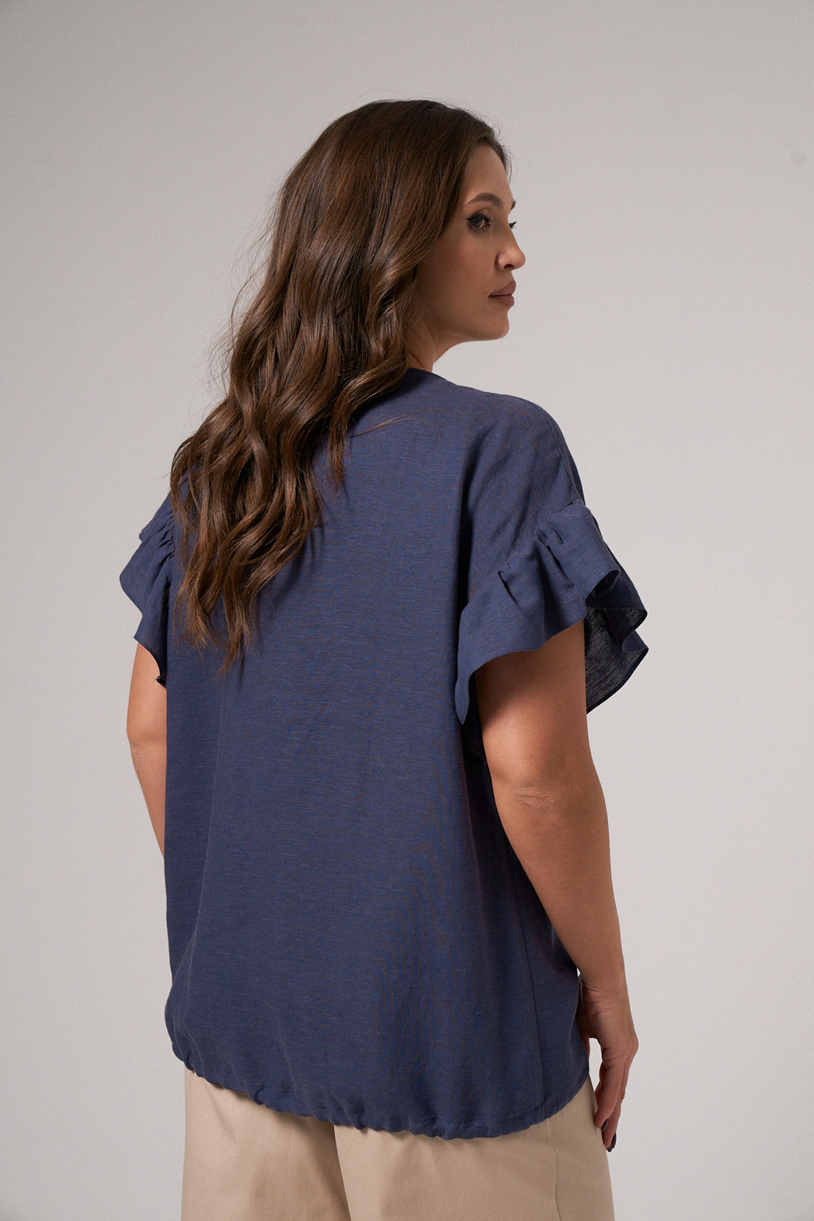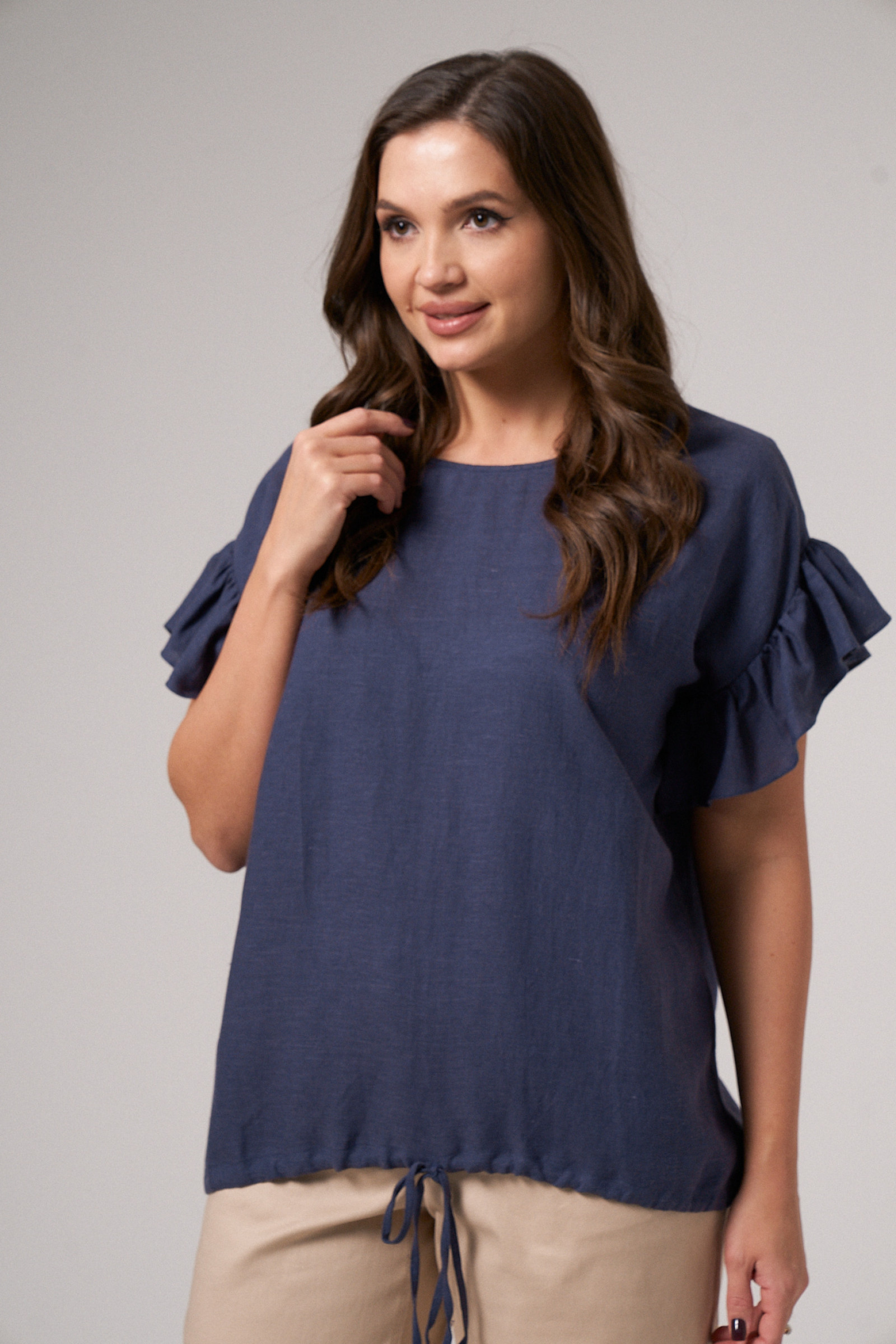 Блуза женская из льняной ткани для повседневной носки. Горловина круглая, пройма оформлена сборкой. По низу изделия кулиса.