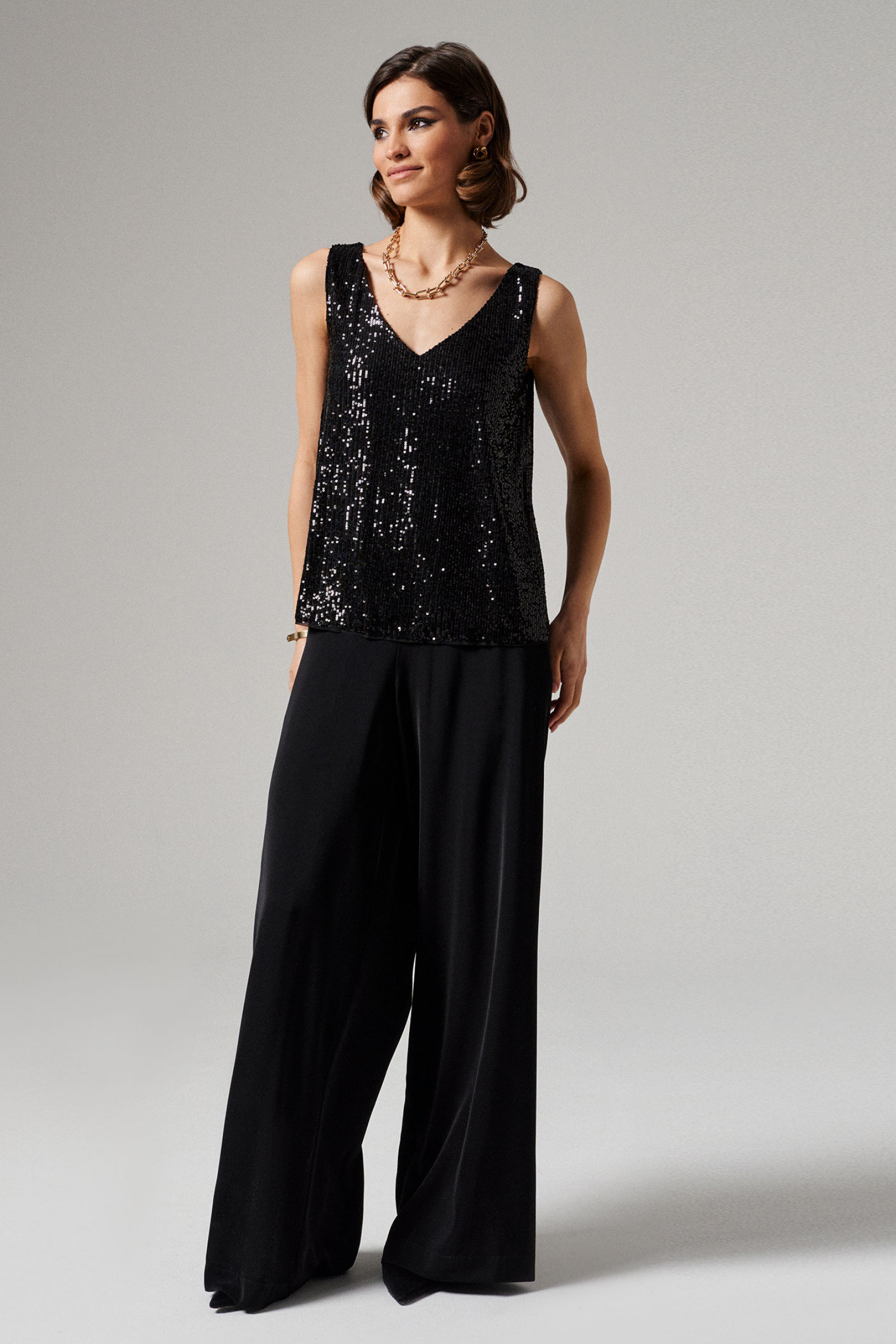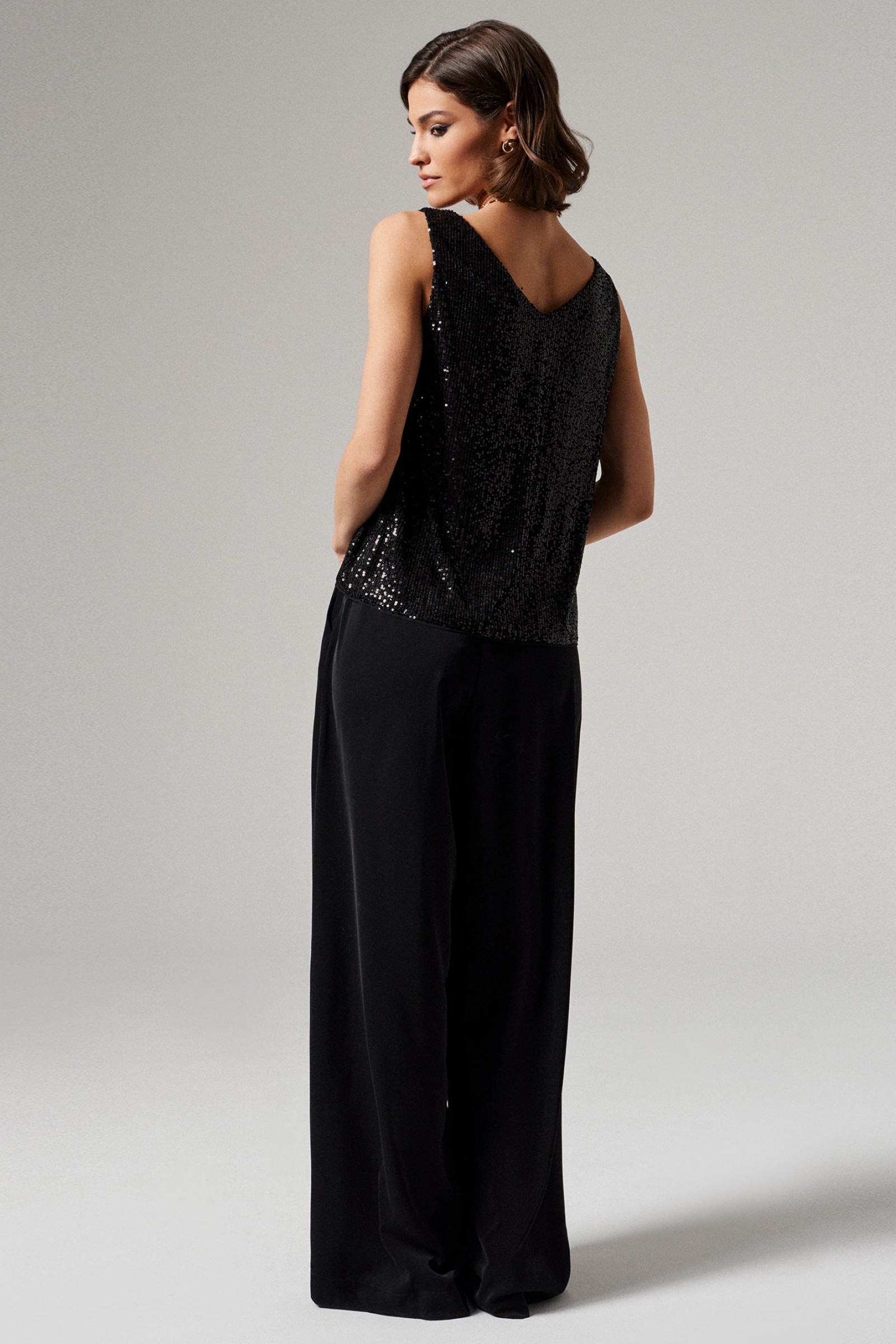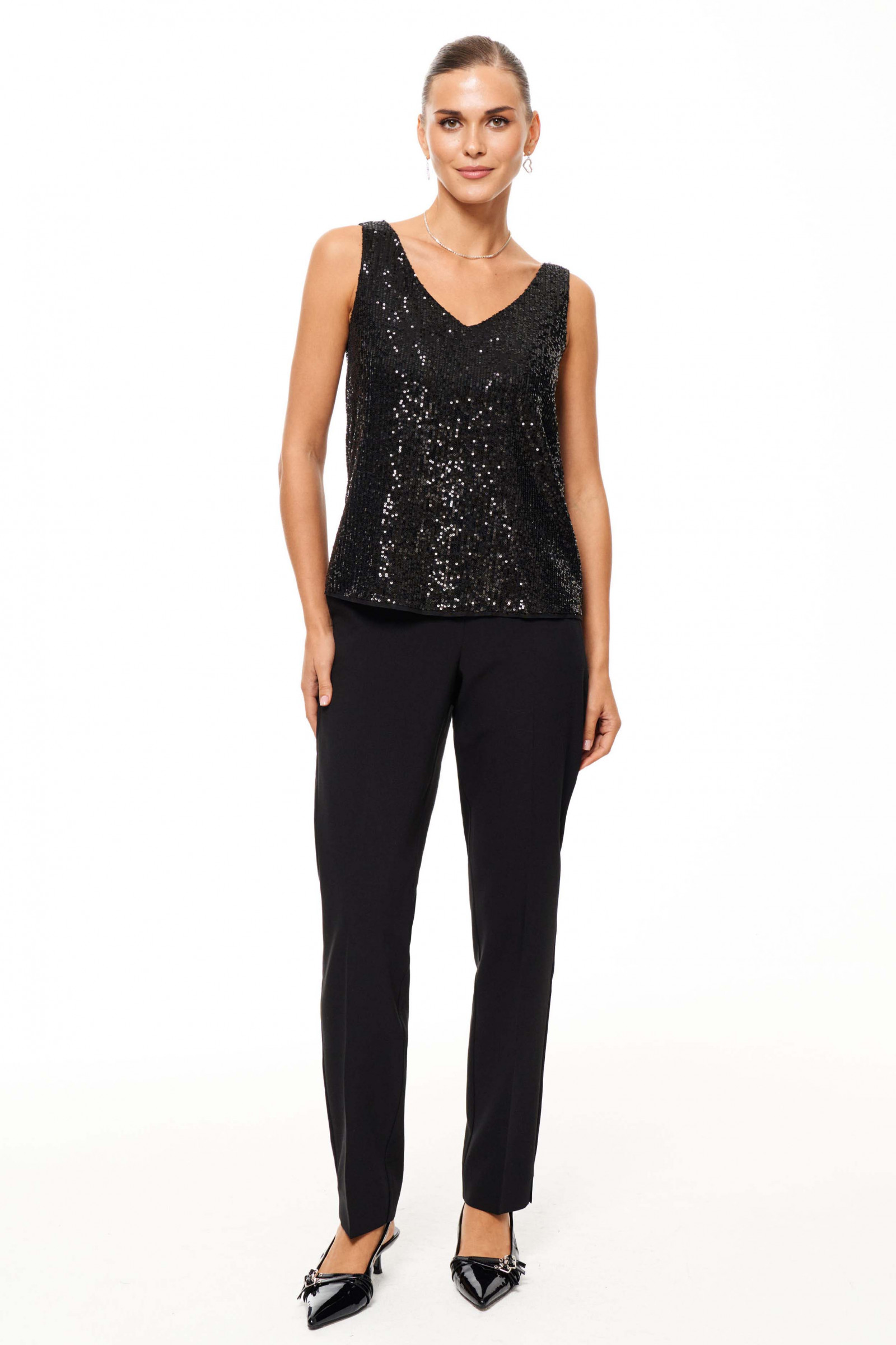 Блузка женская из струящейся ткани с пайетками на подкладке. Подкладка из смесовой ткани. Подходит как для повседневной носки, так и для особых случаев. Блузка с V- образной горловиной. Блузка не имеет рукавов. Очень красивая и элегантная блузка, в которой вы всегда будете в центре внимания.