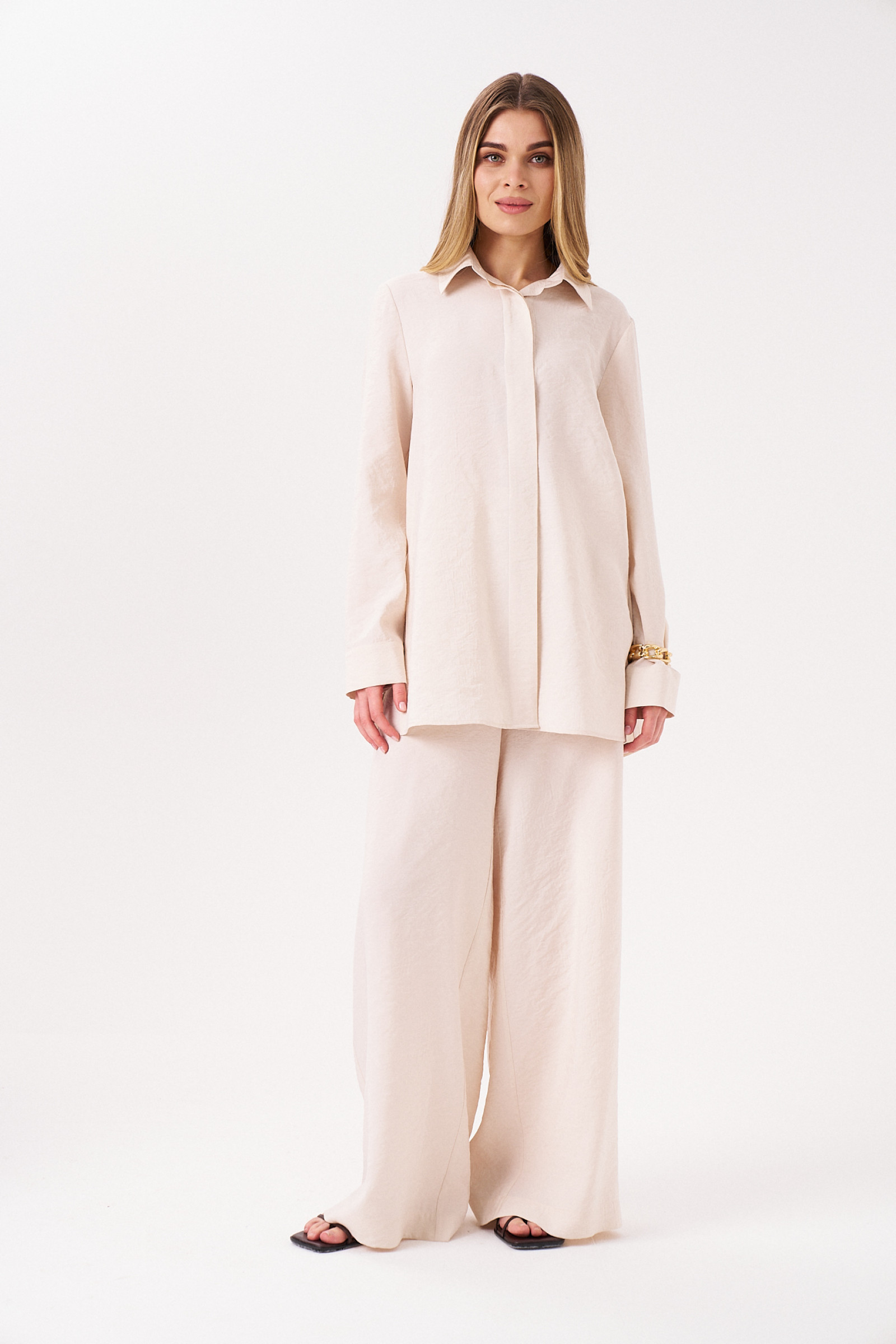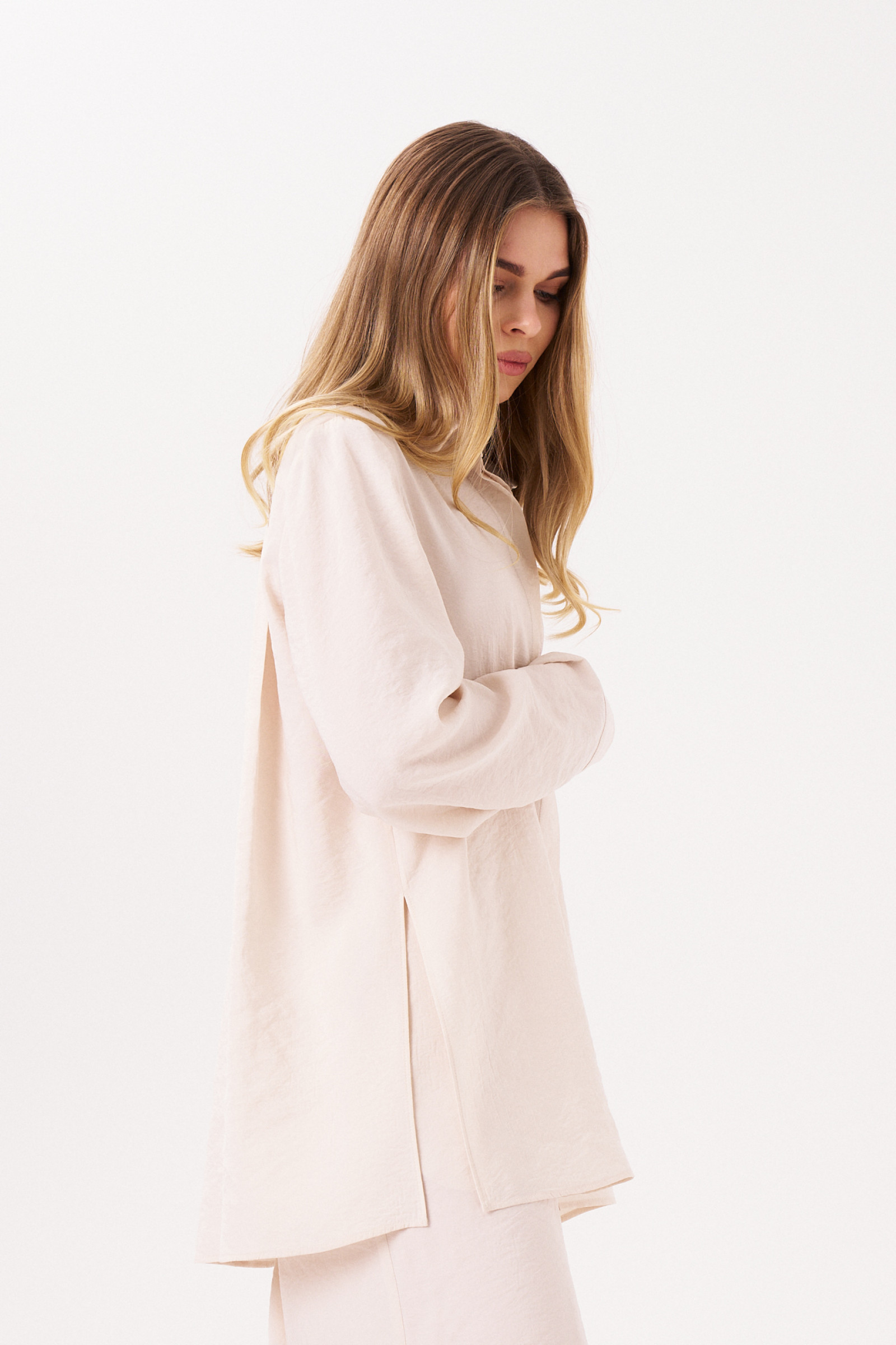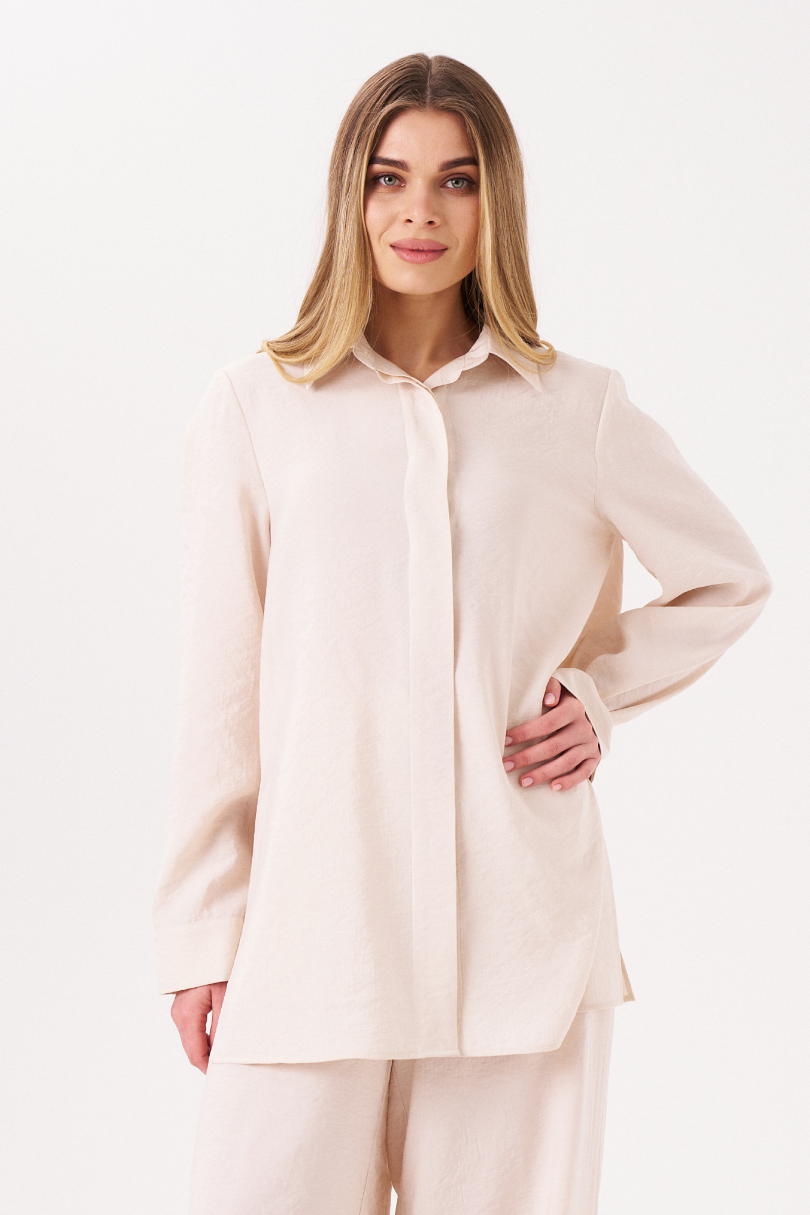Женская классическая блузка из смесовой ткани — это универсальный элемент гардероба, который идеально подходит для создания как повседневного, так и офисного образа. Блузка выполнена в классическом стиле с прямым силуэтом, обеспечивающим свободный комфорт в течение всего дня. Элегантный рубашечный воротник с отрезной стойкой придаёт модели деловой акцент, а застёжка на пуговицы и аккуратные обметанные петли подчеркивают утончённость изделия. Спинка с кокеткой и двумя мягкими складками добавляет лёгкости и свободы движения, а боковые разрезы обеспечивают дополнительный комфорт. Длинные втачные рукава завершены манжетами на пуговицах, что делает модель нарядной и завершённой. Блузка представлена в стильном бежевом цвете, который легко сочетается с другими базовыми вещами гардероба. Она отлично подойдёт для весеннего и летнего сезона, позволяя чувствовать себя уверенно в любой ситуации — будь то деловая встреча, праздничное мероприятие или повседневная прогулка. Благодаря своему универсальному дизайну, блузка может стать как основой классического офисного комплекта, так и нарядным вариантом для вечернего выхода. Актуальна для женщин, ценящих комфорт, стиль и функциональность. Эта женская блузка — базовое решение для тех, кто хочет выглядеть стильно каждый день.