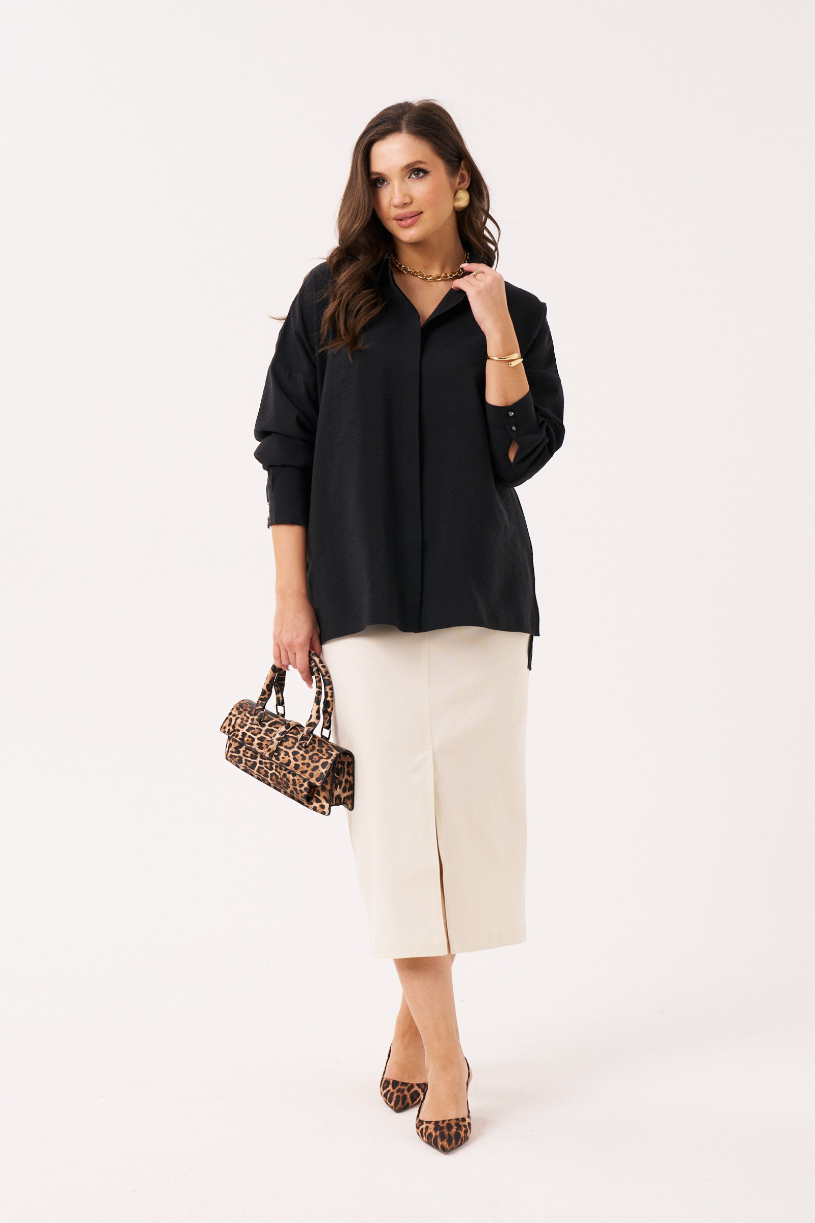 Стильная женская блуза с длинным рукавом идеально дополнит ваш повседневный и деловой образ. Она одновременно строгая, но женственная. В ней можно отправиться в офис, на деловую встречу, торжественное мероприятие. Блузка рубашка отлично дополнит джинсы и брюки различного кроя. Правая сторона блузы украшена принтом в виде текста. Он привносит в дизайн изделия модную ноту и делает изделие не таким официальным. Блузка изготовлена из хлопковой ткани, в ней комфортно, она не парит и отлично пропускает воздух к коже. Вы можете купить хлопковую женскую рубашку больших размеров 50-56.