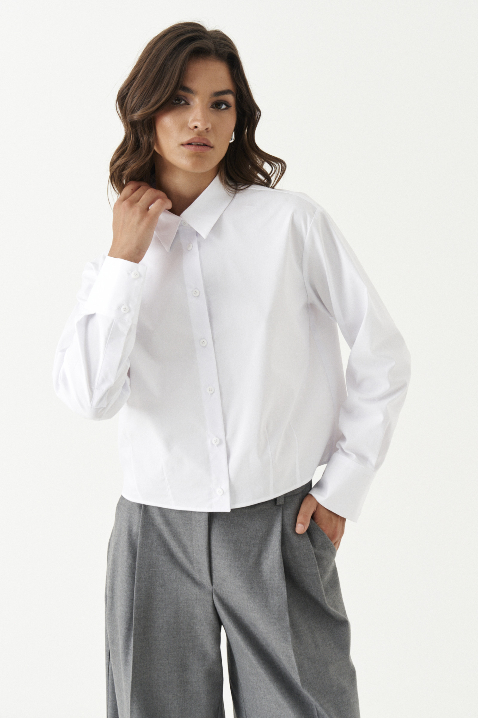 Блузка женская из смесовой ткани для повседневной носки. Блузка полуприлегающего силуэта. По переду располагаются четыре талиевых вытачки, застежка на семь обметанных петель и семь пуговиц. По спинке имеются две талиевые вытачки. Горловина обработана рубашечным воротником с отрезной стойкой. Низ рукава обработана притачной манжетой, застежка на одну обметанную петлю и одну пуговицу. По низу изделия, по краю вытачек и по верхнему шву манжеты проложены отделочные строчки. Блузка станет идеальным вариантом для любой прогулки, а также разнообразит ваш образ стильным фасоном.