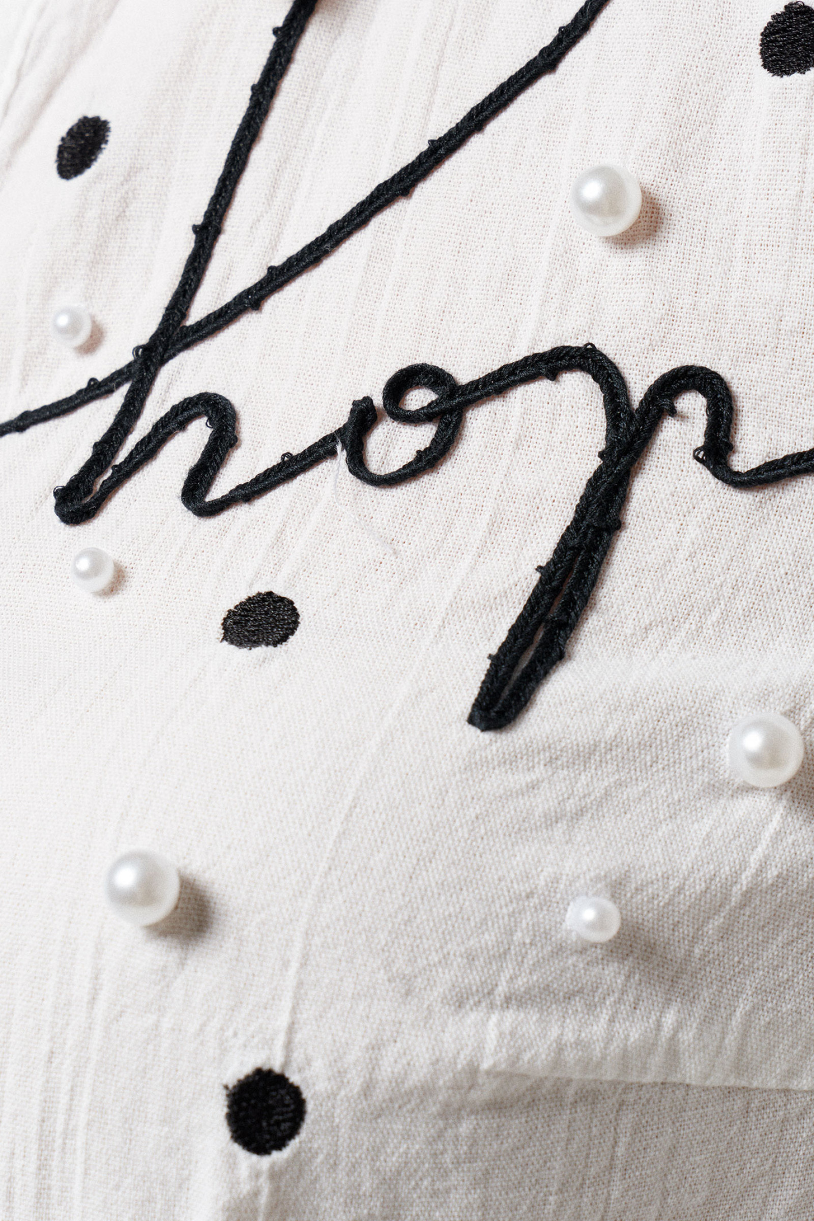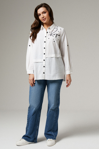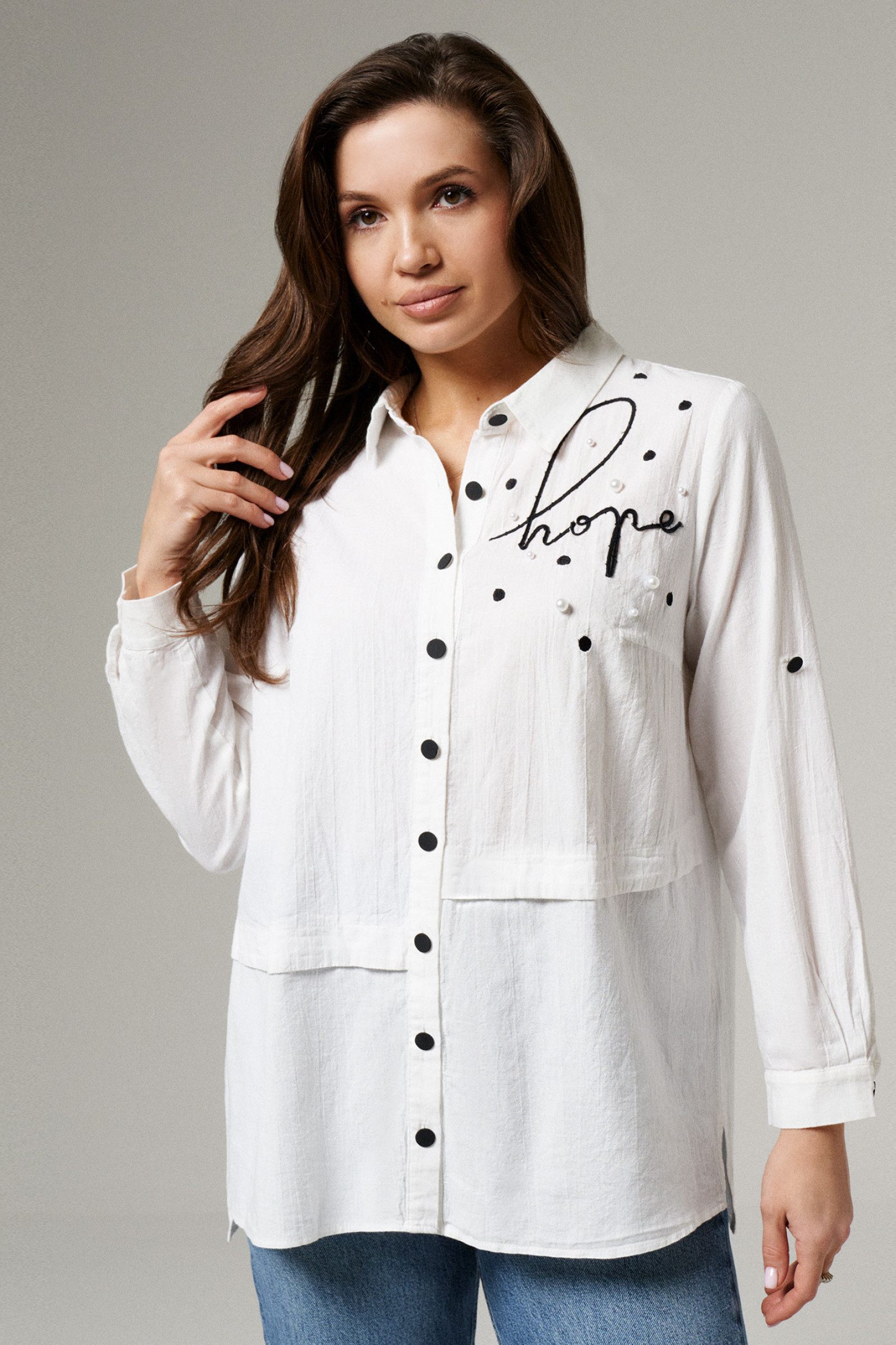 Лёгкая блузка из хлопковой ткани. Блузка свободная, с длинными рукавами. На рукавах имеются паты. Застежка центральная сквозная на петли и пуговицы, воротник сорочечный. По переду имеется декоративные подрезы. На левой детали переда расположен декор. Отличный вариант как в офис, так и для повседневных дней.