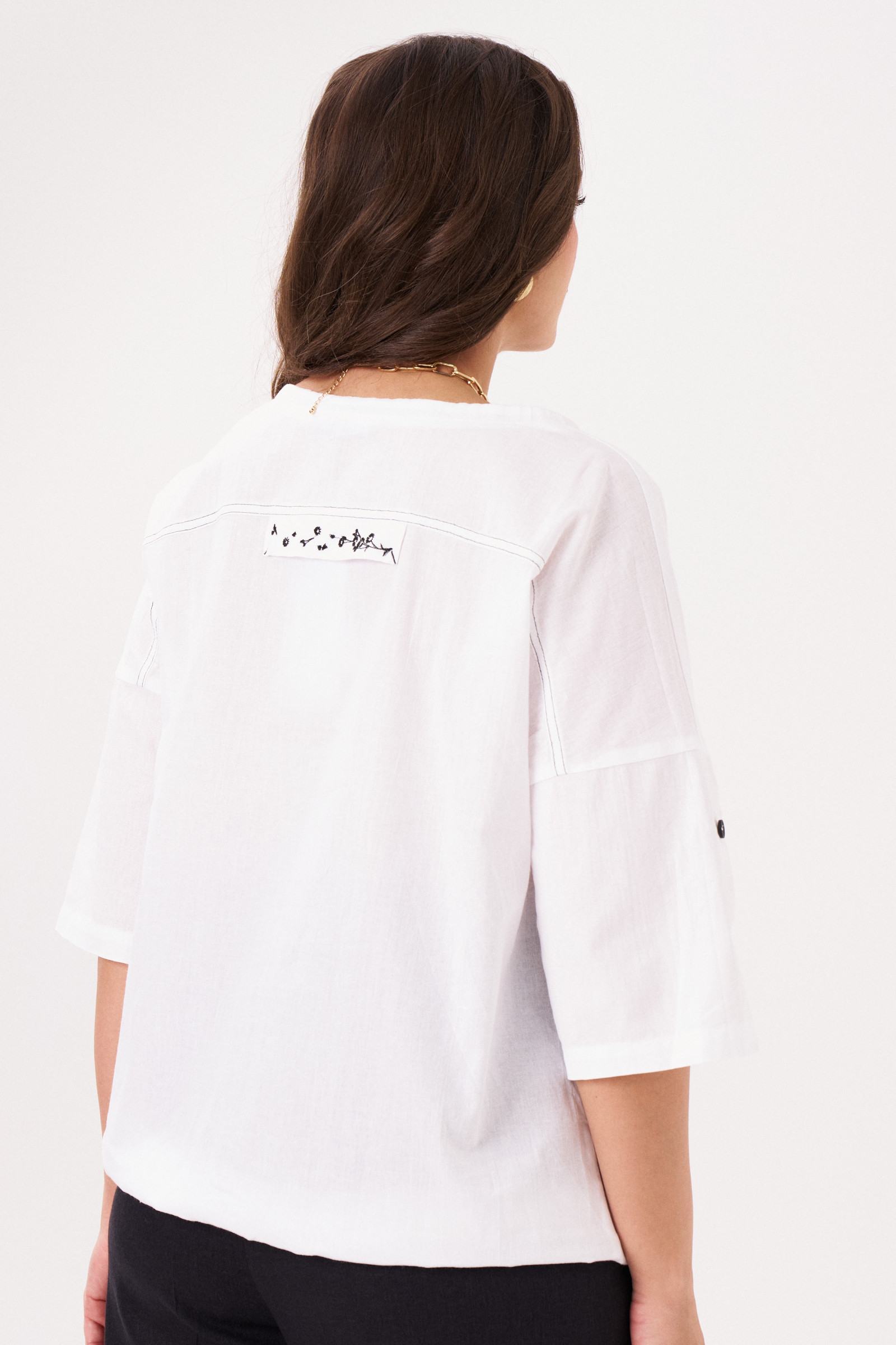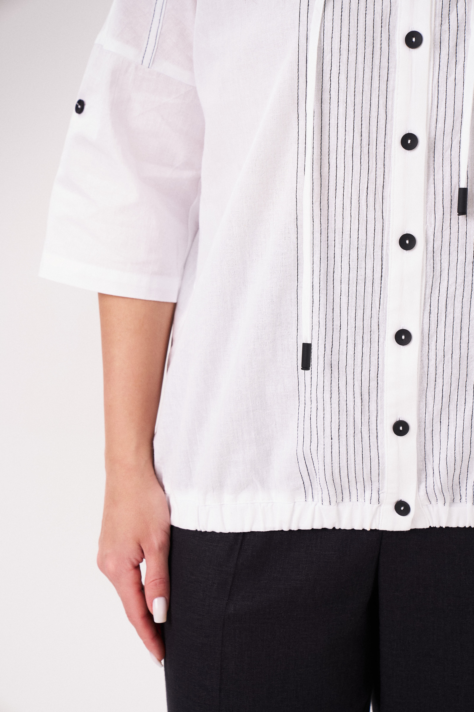Оригинальная блузка из хлопка. Прямого силуэта, со спущенной линией плеча, с кокетками, горловина оформлена планкой и шнурком из основной ткани с металлическими черными наконечниками, центральная застежка на петли пуговицы, вертикальная декоративная отстрочка черными нитками, линия низа на резинке. Рукава 3/4, с патами на петлю пуговицу. Спинка с кокеткой и планкой от нее,с дизайнерской черной вышивкой. Хороший вариант для работы и отдыха.