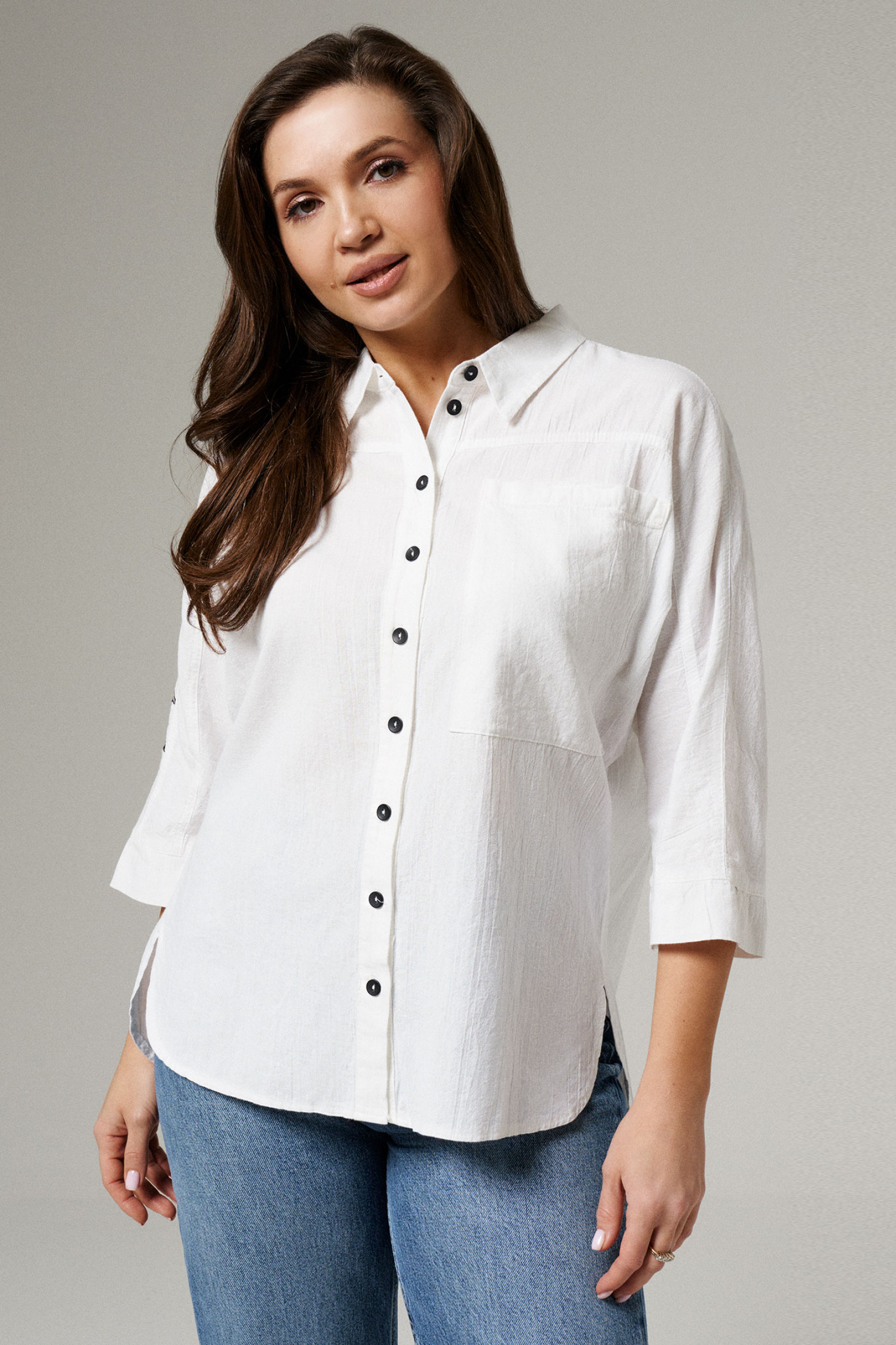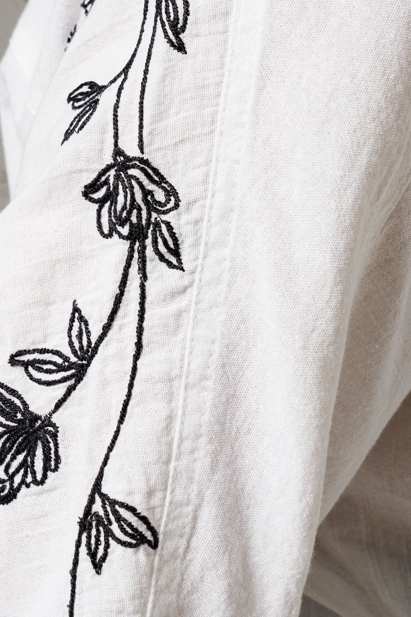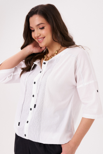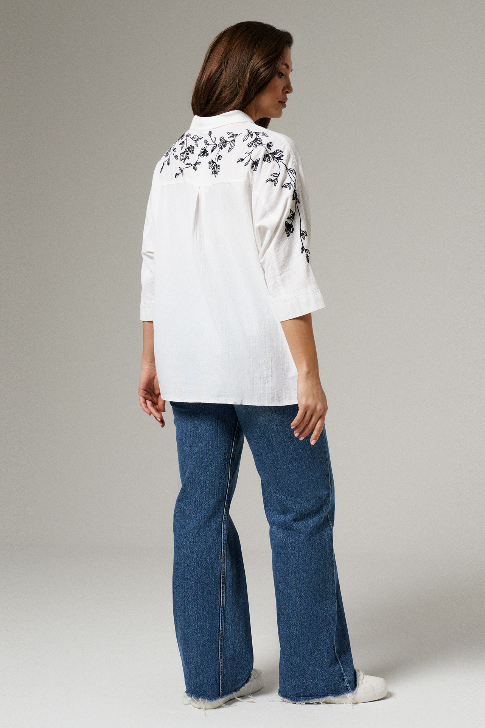 Эффектная блузка из хлопковой ткани, свободного силуэта, акцент сделан на дизайнерскую вышивку , с центральной застежкой на петли пуговицы, линия плеча спущенная, рукава цельнокроеные с притачной манжетой, с кокеткой и нагрудным карманом, линия низа фигурной формы, боковые швы смещены на деталь переда. Спинка с кокеткой и дизайнерской вышивкой, со встречной складкой от кокетки , линия низа фигурной формы. Все эксперименты с блузкой априори будет выглядеть стильно и непревзойденно, благодаря оригинальному крою создаст потрясающий образ для уверенной в себе девушке.