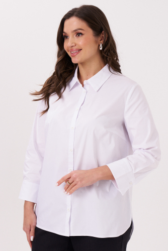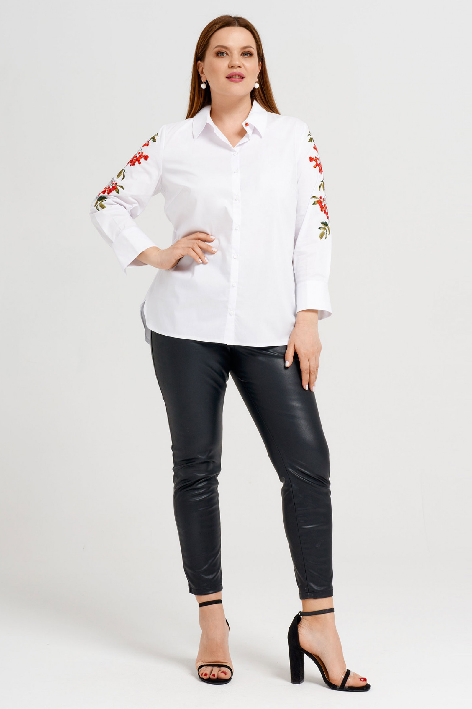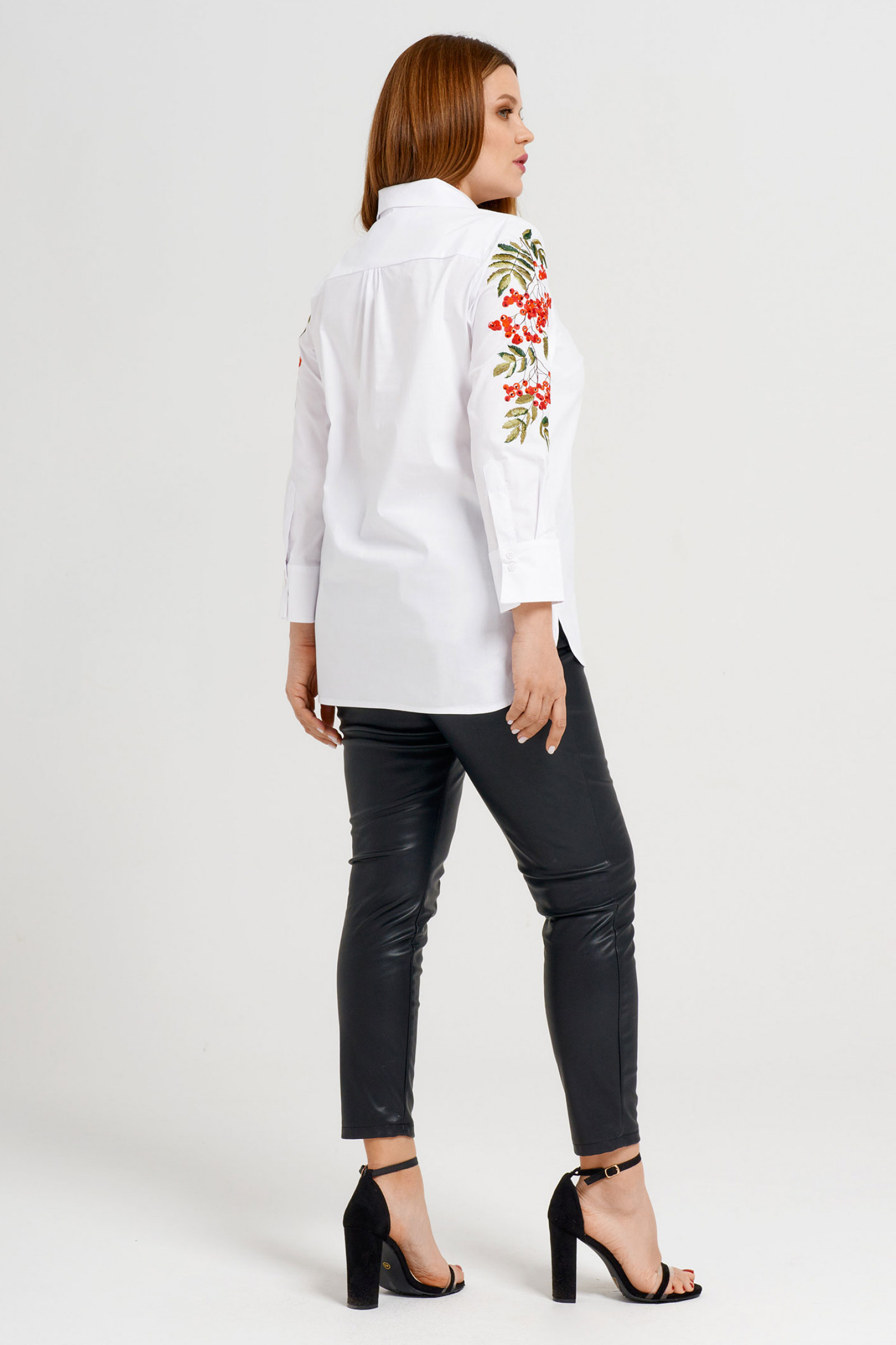 Стильная блузка из хлопковой ткани. В блузке сделан акцент на офисный стиль с нотками роскоши, этого удалось достичь благодаря декору "вышивка рябина". Блузка полуприлегающего силуэта, с застежкой на потайную планку, с нагрудными вытачками по переду, на спинке кокетка, рукава удлиненные на манжете, на рукавах яркая вышивка "рябина".