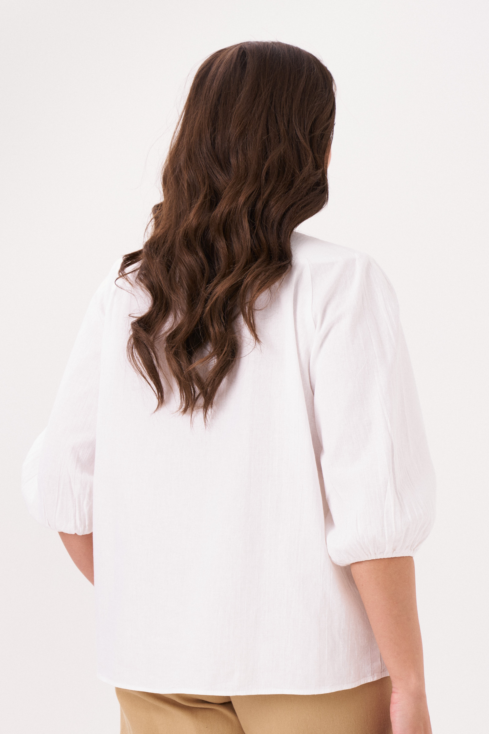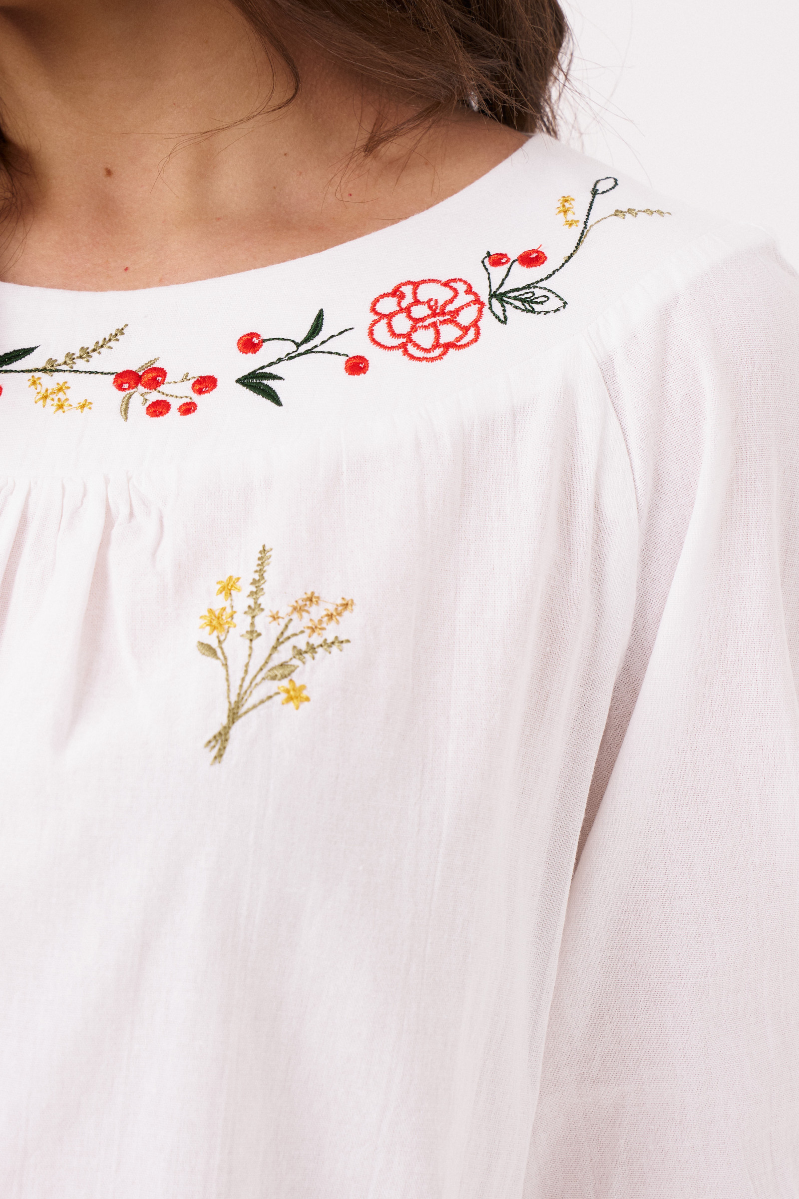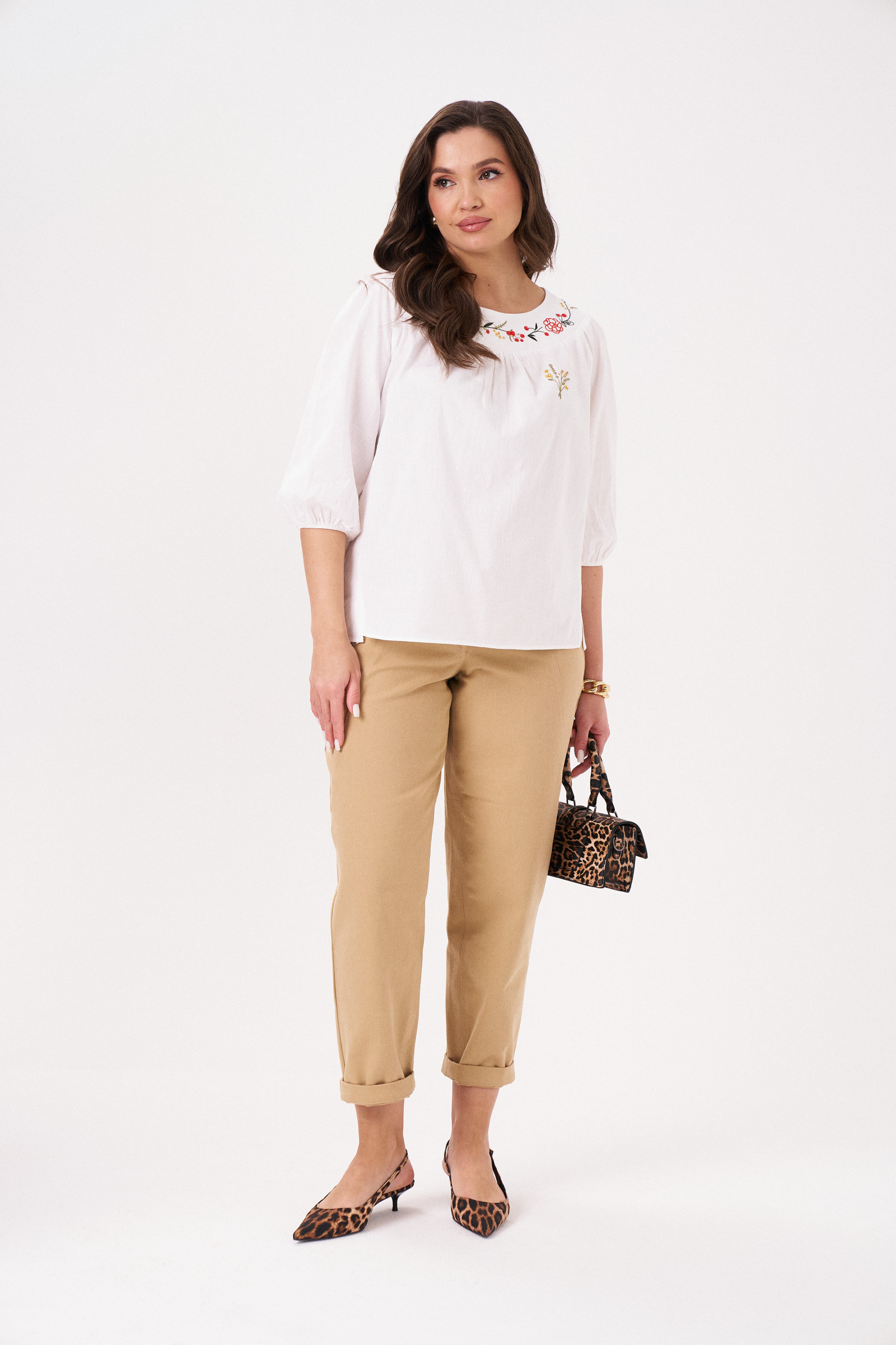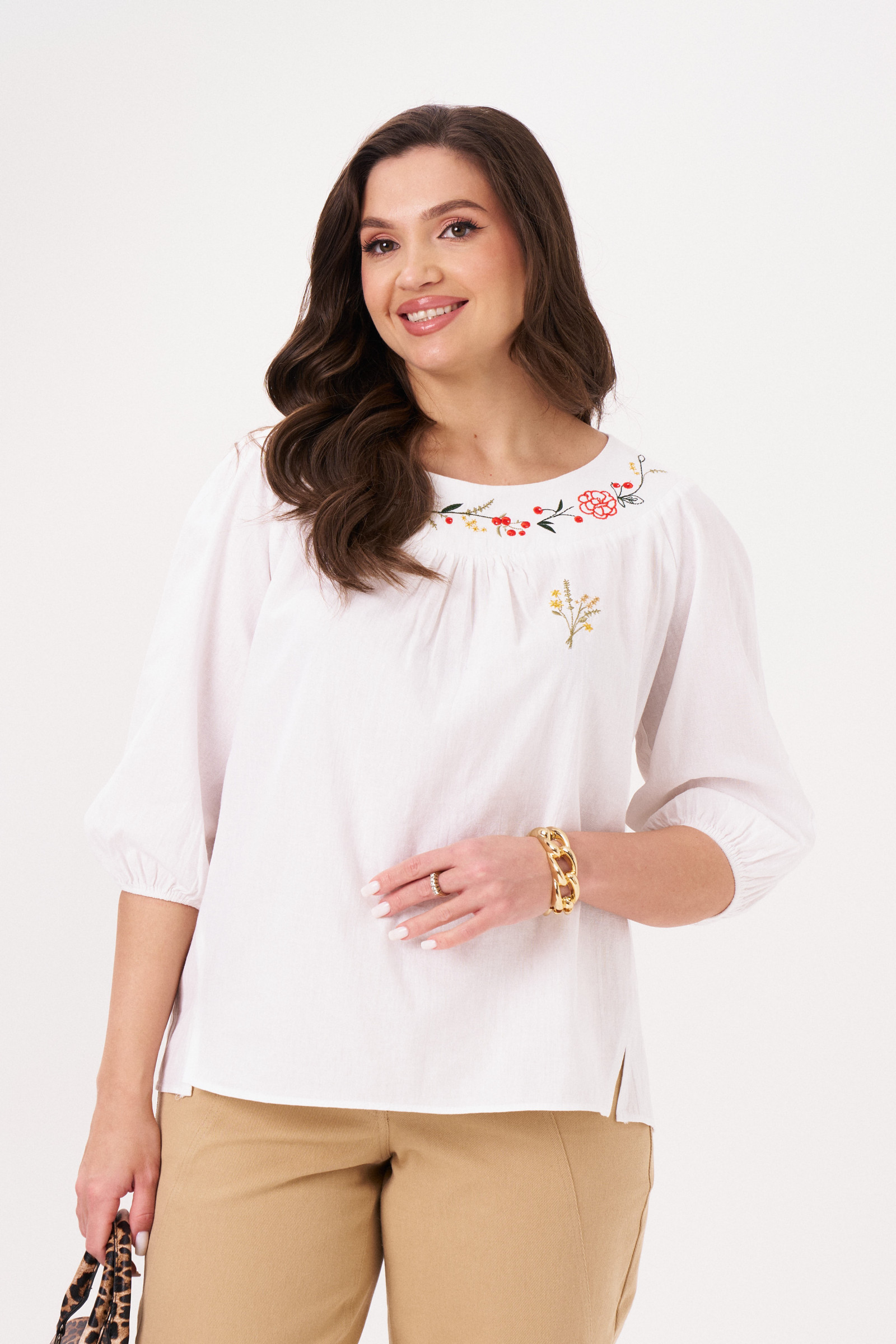 Блузка прямого силуэта, из хлопковой ткани. Блузка с круглым вырезом горловины и широкой планкой на которой расположена, авторская вышивка, в блузке боковые швы перехоят на деталь переда и заканчиваются разрезами, с не большим перепадом длины, перед короче, спинка длиннее. Спинка на широкой обтачке. Рукава полуреглан, расширенные, линия низа на резинке, длина 3/4. Блузка- это тренд на все время, она относится к базовой части гардероба. С помощю блузки можно создавать интересные образы на каждый день, можно носить, с джинсами, шортами, хлопковыми брюками.