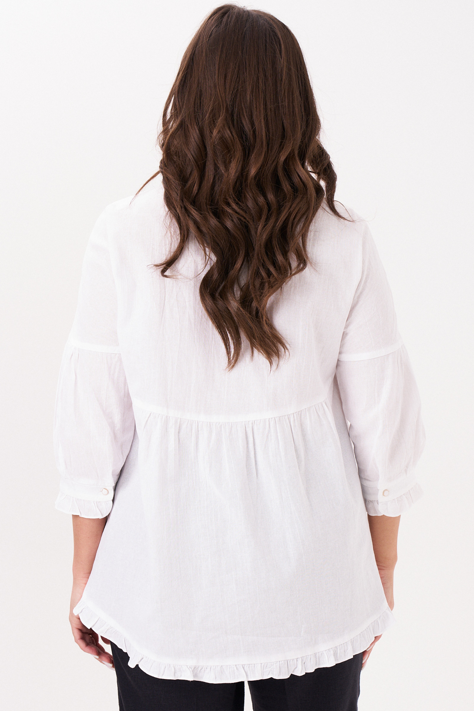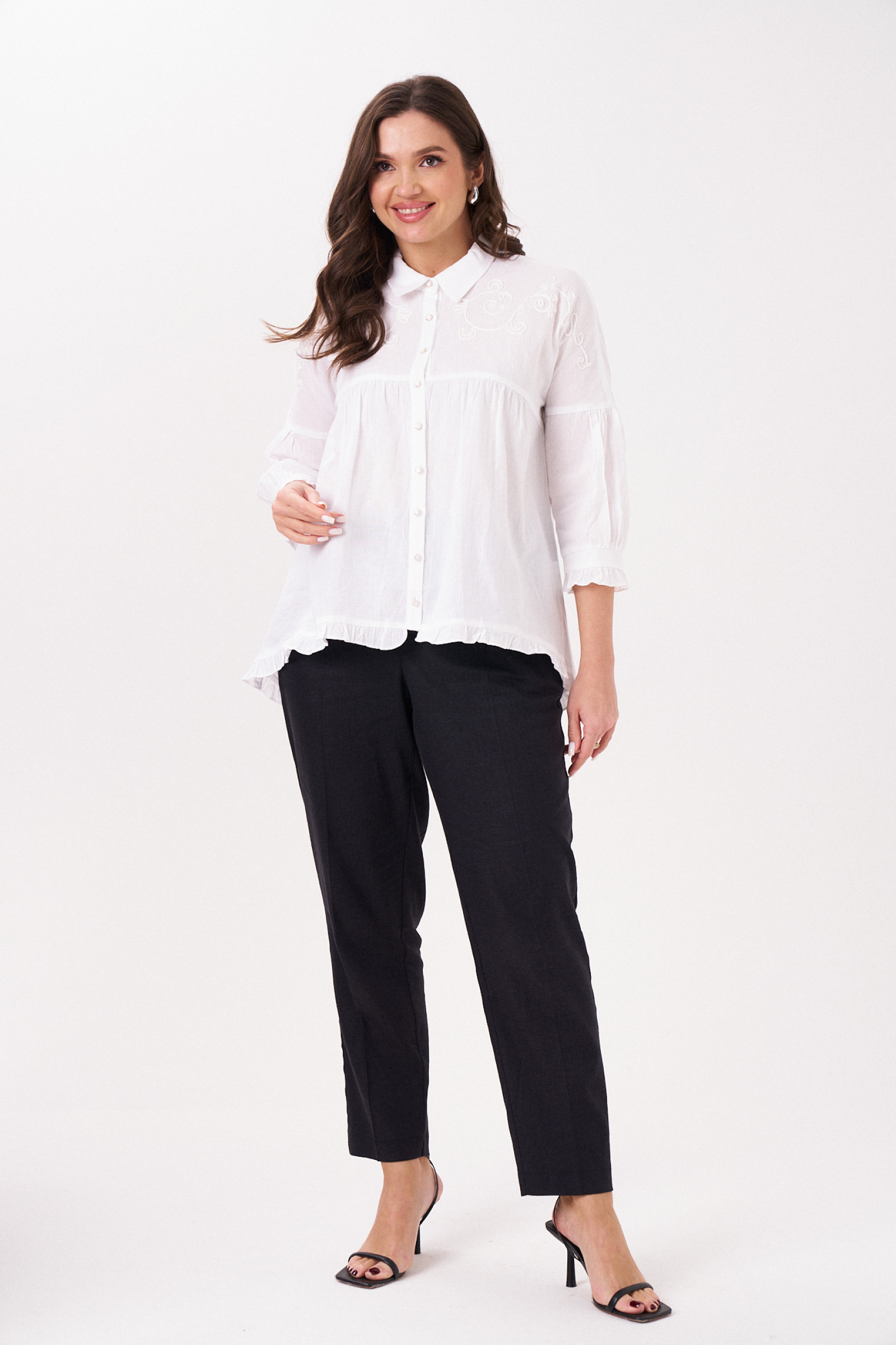 Летняя белая женская блузкас романтичным дизайном разнообразит ваш повседневный гардероб. Декоративные рюши и вышитые витиеватые вензеля придают ей нежный вид. Она удобна в носке благодаря легкой ткани и свободному силуэту.Нарядная женская блузка из "дышащей" бязи изготовлена для жаркой погоды. Она создает элегантный образ, защищая от палящего солнца. Ее расцветка отражает солнечные лучи, позволяя вам комфортно себя чувствовать даже при +40о. Женская блузка оверсайз не облегает тело, пропуская больше воздуха.Благодаря изящному дизайну праздничная женская блузка универсальна в носке. Ее можно надеть на отдых и работу, торжественное мероприятие и вечеринку. Она сочетает в себе строгий рубашечный воротник на стойке и женственные рюши, пришитые к асимметричному низу и притачным манжетам спущенных расширенных рукавов.Хлопковая женская блузказастегивается на планку с пуговицами. Белая блузка - женская классическая одежда, которую можно купить для создания множества стильных образов.
