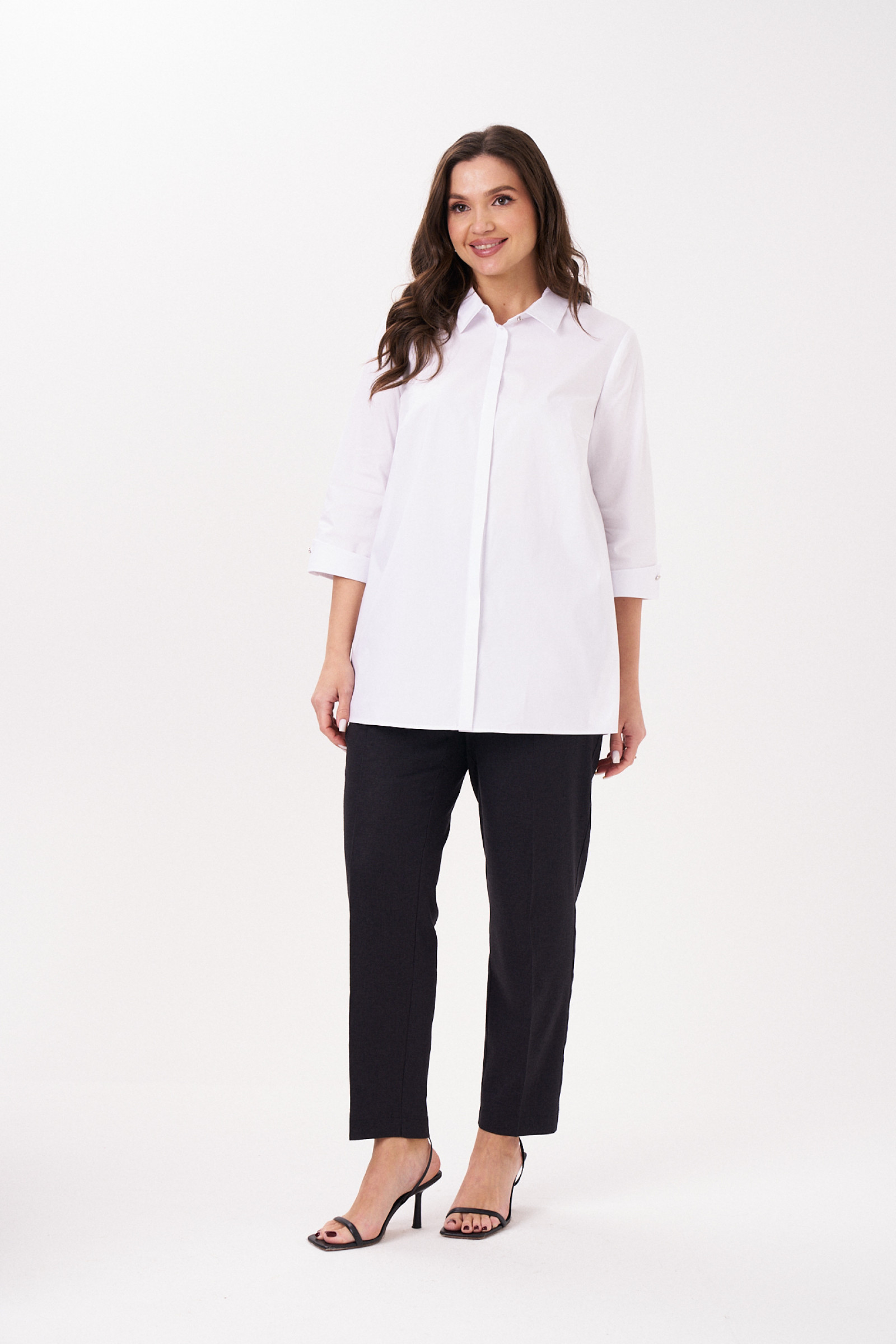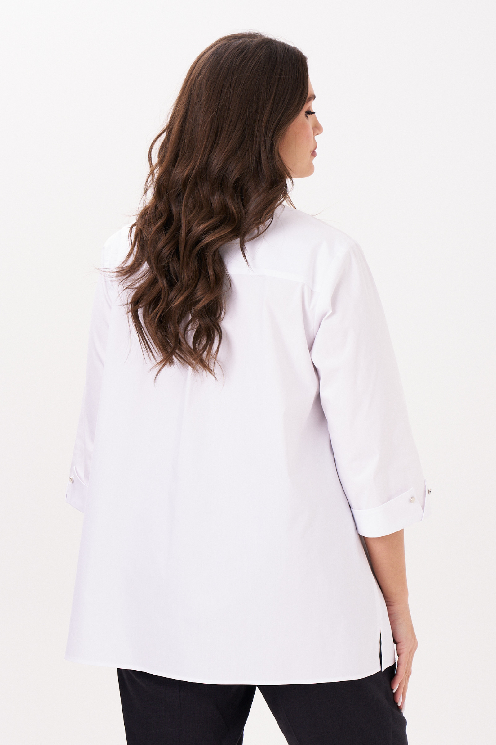 Неизменная классика - блузка белая женская рубашечного кроя, универсальная в носке. Ее можно надеть не только на работу в офис или на учебу, но и на официальные мероприятия. Лаконичный дизайн придаст повседневным образам более строгий вид.Блузка женская с длинным рукавом больших размеров изготовлена из хлопковой ткани с полиэстером и эластаном. Рукав 7/8 с отложными манжетами украшен декоративными пуговицами и петлями. Рубашка женская белая дополнена отложным воротником сорочечного типа. Застегивается на потайные пуговицы и петли, скрытые под центральной планкой.Блузка-рубашка женская с притачной к спинке кокеткой, которая позволяет добиться идеальной посадки. В центре спинки несколько вытачек, благодаря чему ткань не топорщится. Полуприлегающий фасон формирует изящный силуэт, скрывая недостатки. Благодаря большому содержанию хлопка, рубашка хорошо пропускает воздух. Женская блузка нарядная пригодится для повседневной носки, ее можно купить для любого сезона.
