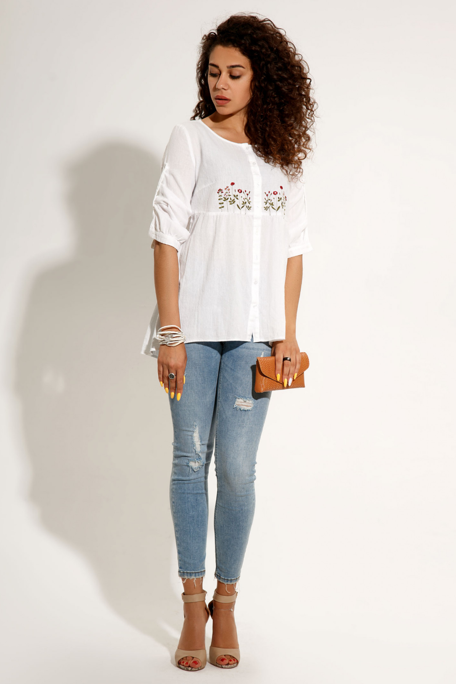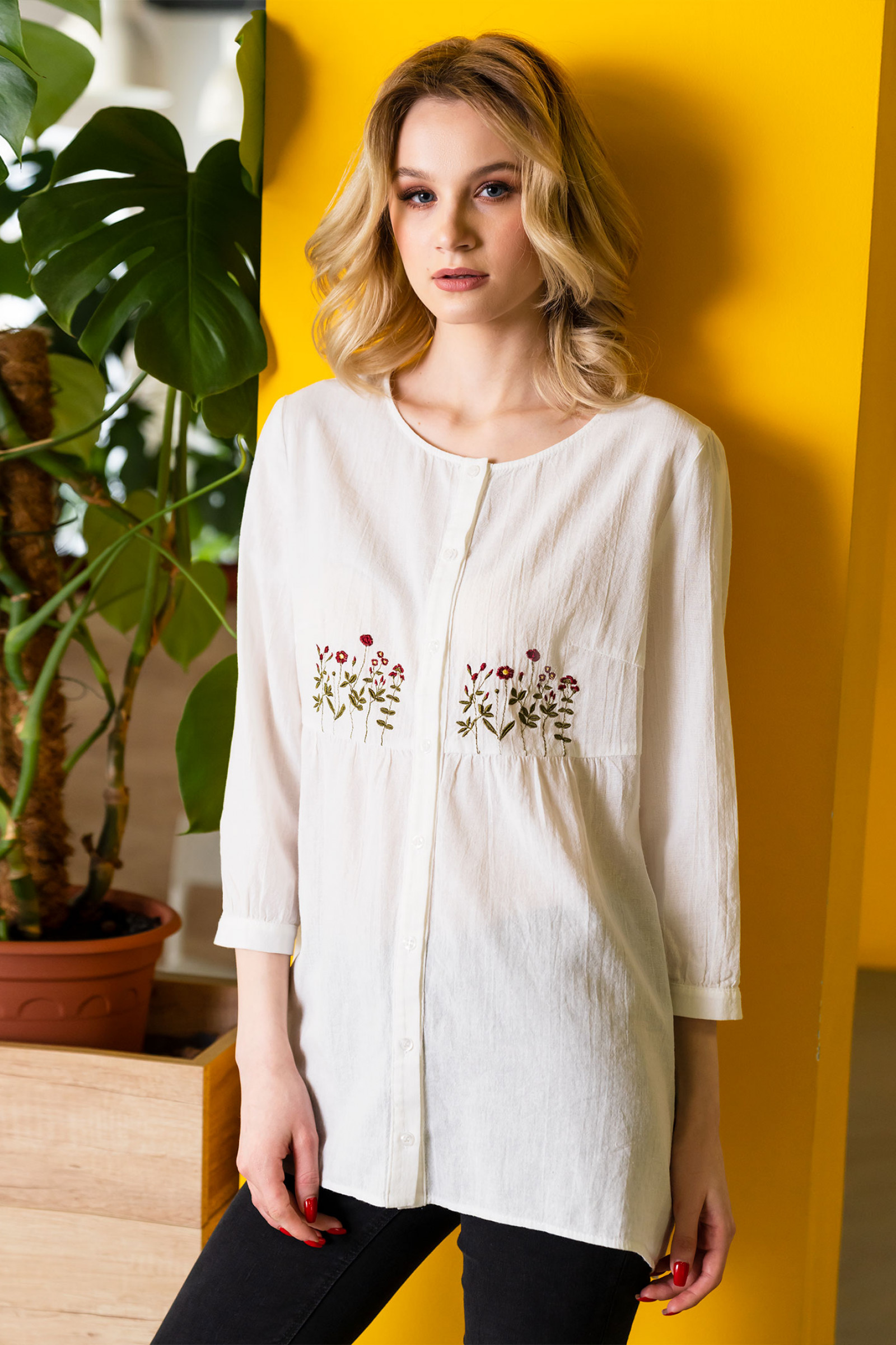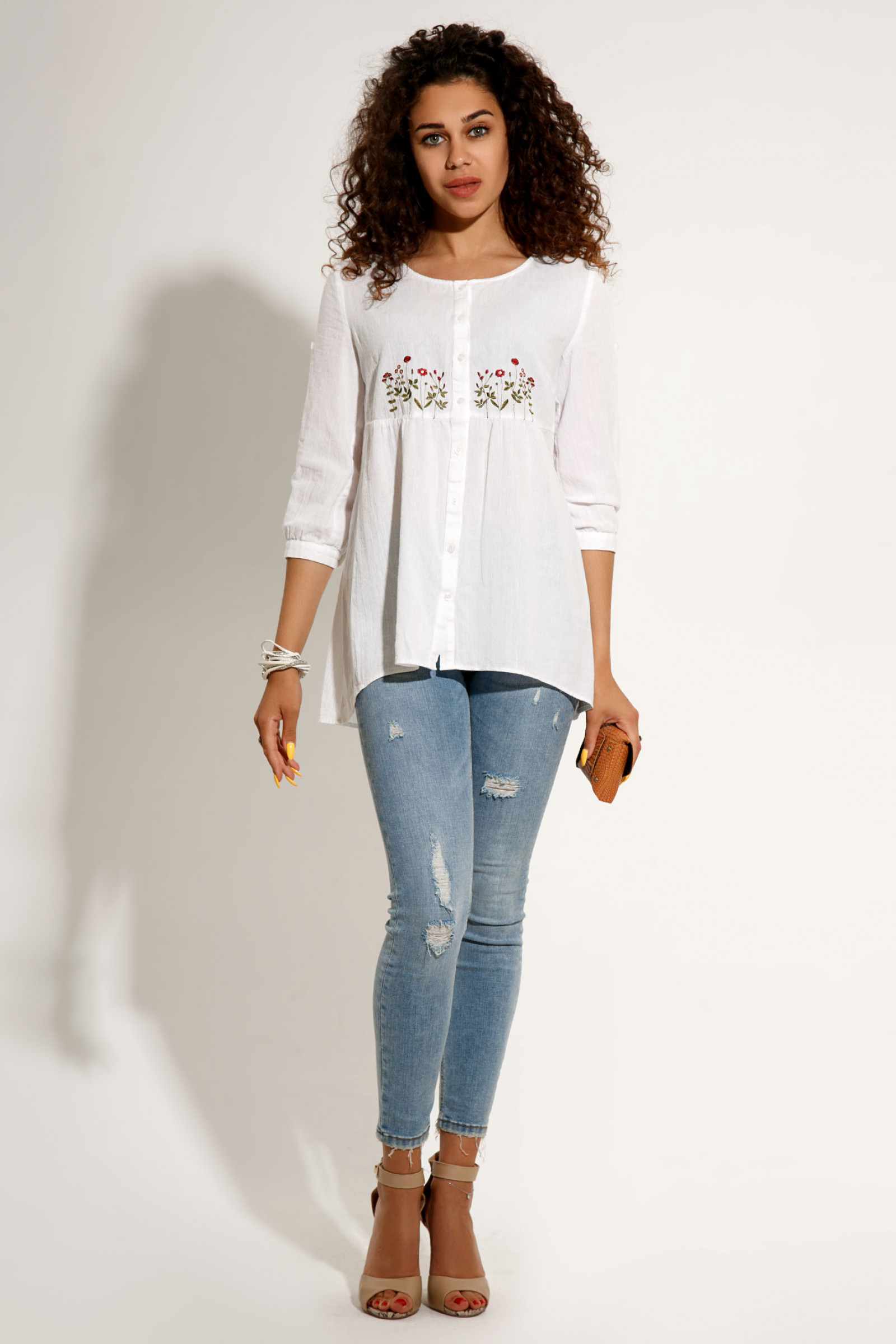 Нежнейшая удлинённая блузка современного свободного кроя выполнена из невесомого хлопкового полотна.Чудесный вариант для стильной девушки на каждый день тёплого лета. Спереди блузка декорирована изысканной вышивкой с цветочными мотивами.Рукав длиной 3/4 снизу присборен и застёгивается на притачную манжету.По переду лиф отрезной.По спинке также выполнен горизонтальный рез.Нижние детали переда и спинки присборены по вержнему срезу.Вырез горловины круглый.Застёжка на планке на петли и пуговицы.