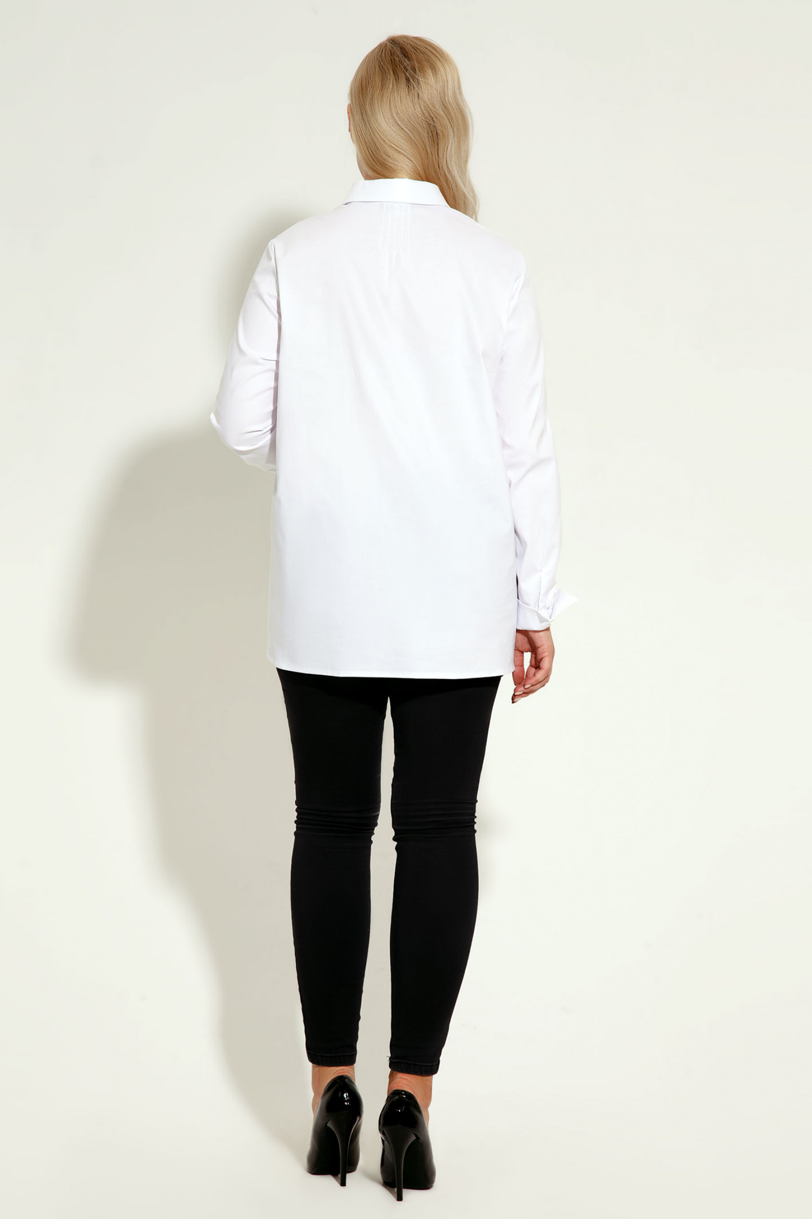 Практичная и элегантная блузка в классическом стиле выполнена из качественной хлопковой ткани с эластаном. Рукав длинный с отложным манжетом с заостренными уголками. Манжет застёгивается на одну петлю-пуговицу. Воротник рубашечный,отложной, на стойке. Застёжка спереди на отрезную планку и петли-пуговицы. По переду блузка декортрована вертикальными защипами. По спинке также выполнены короткие защипы от среза горловины. Нагрудные вытачки обеспечивают идеальную посадку на фигуру. Прекрасный вариант блузки на каждый день для стильной и энергичной девушки.