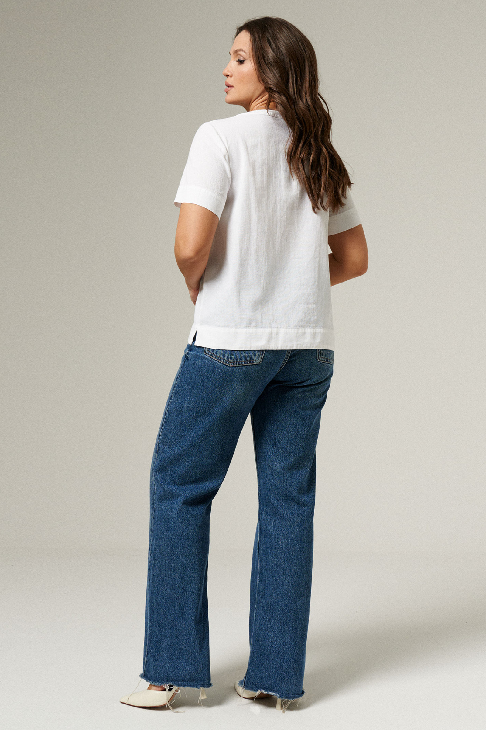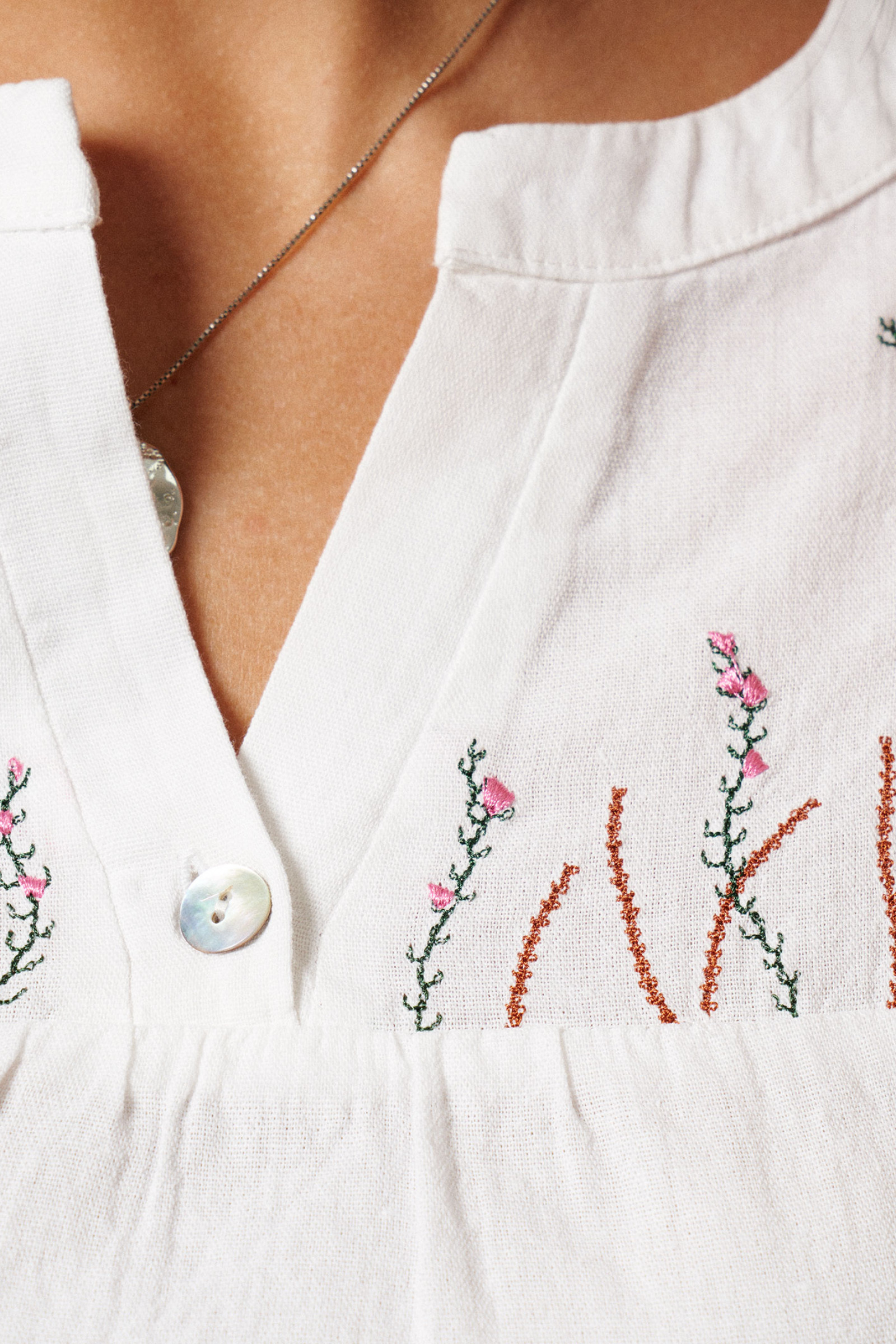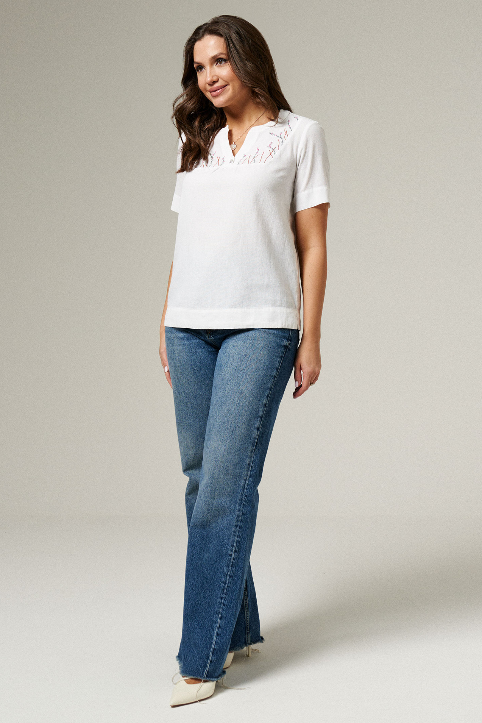 Блуза женская с коротким рукавом – незаменимая одежда для жарких дней. Летняя блуза из натурального хлопкового полотна поможет вам создавать интересные повседневные образы. Модель скроена в чуть приталенном фасоне, который подчеркнет достоинства вашей фигуры. Белая блуза украшена изящной вышивкой по передней полочке. Нарядная женская блузка привлекает внимание оригинальной формой выреза горловины.