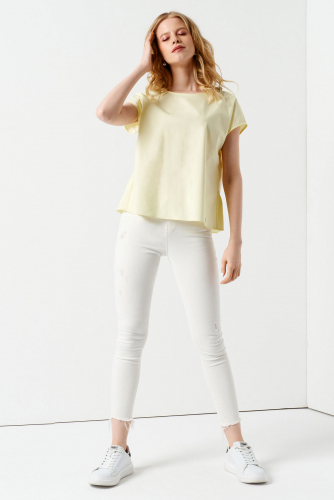 Легкая летняя блузка из хлопковой ткани. Блузка прямая, слегка удлинённая. Горловина оформленна воротником-стойкой, с застежкой на потойную планку. По переду в подрезе есть карман, а также рельефы. Рукава с притачными манжетами. Длина рукава 7/8. Отличный вариант для жарких летних дней.