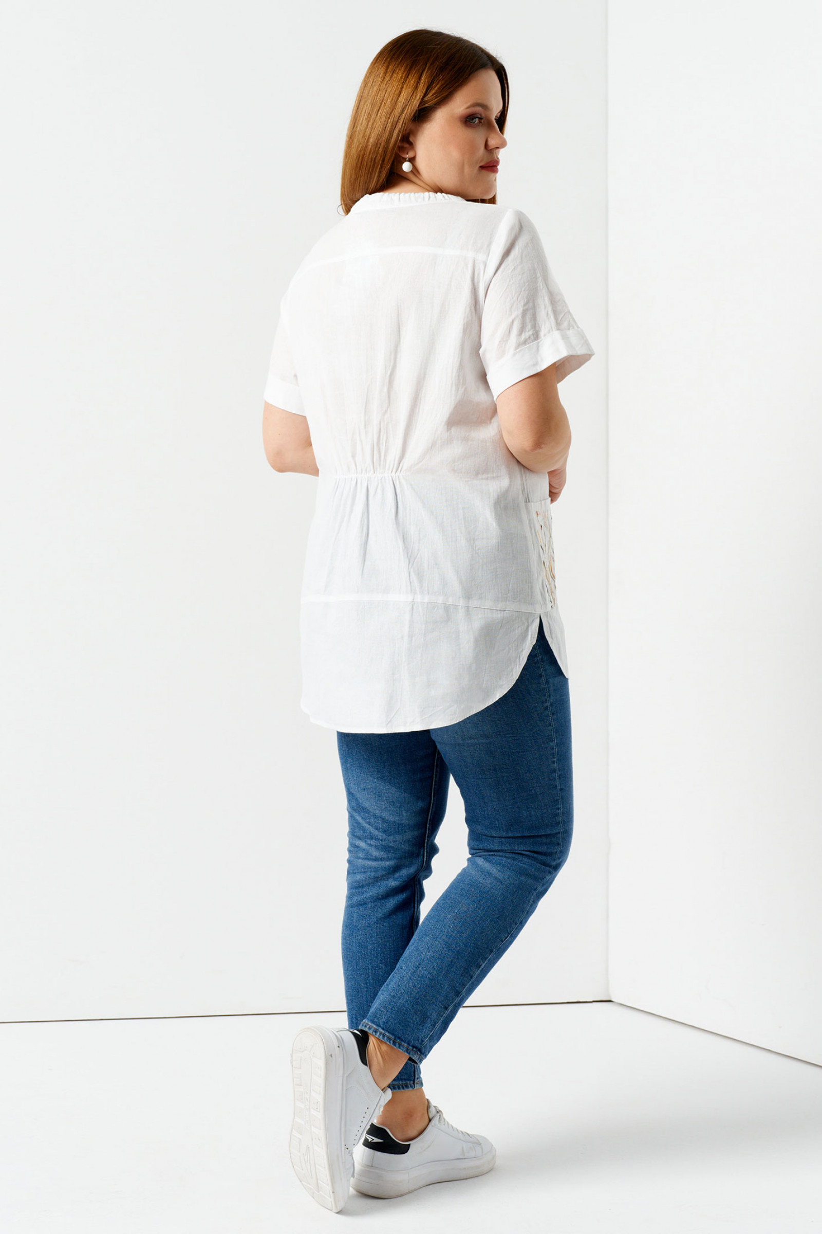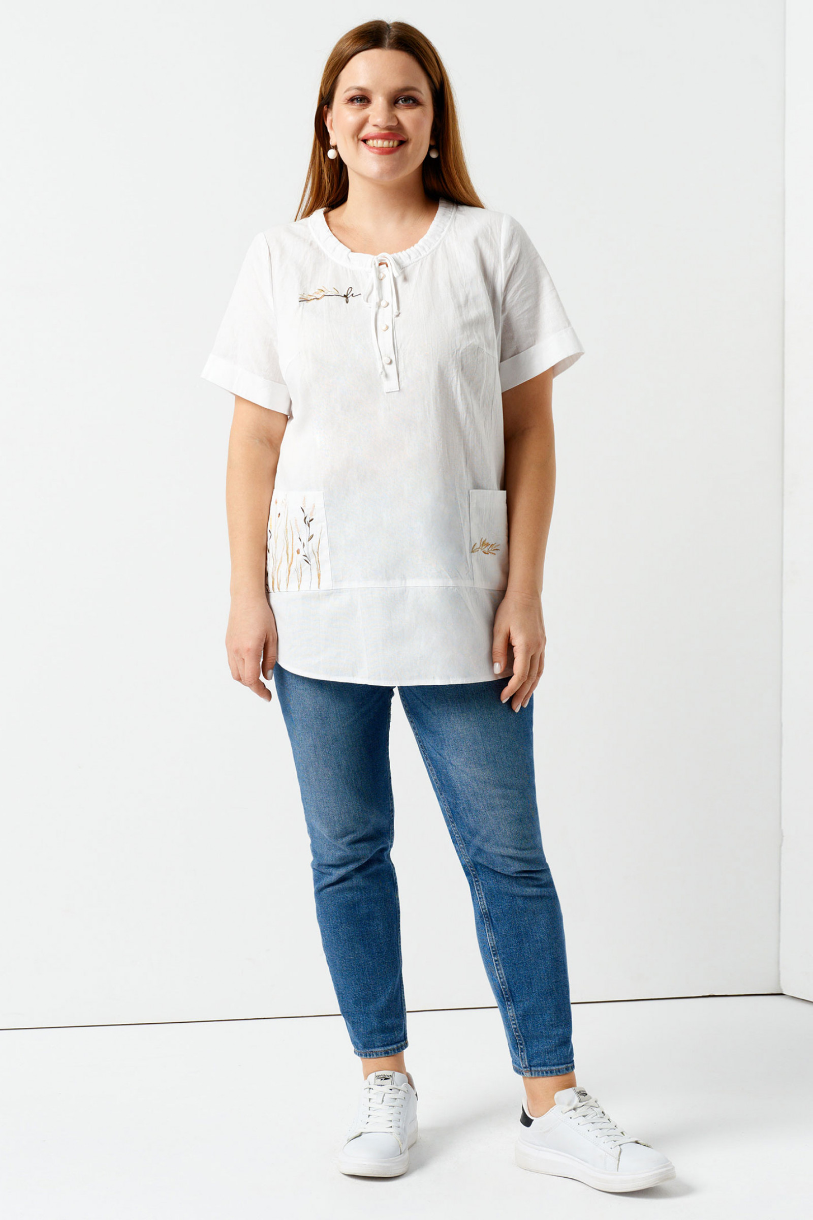 Нарядная летняя блузка из хлопка - идеальный выбор для вас. Незаменима для офисной работы, деловых встреч, посещения семинаров, прогулок с друзьями. Горловина оформлена кулисой, в которую протянут шнурок, который завязывается на бантик. Застёжка на планку-пуговицы. На переде имеются накладные карманы. Дизайнерская вышивка по переду и карманам украшает блузку. Рукав спущенный, который не стесняет движения, имеется отложная манжета. Длина до середины бедра.Такая женская блузка подойдет для полных девушек и женщин. Благодаря прямому крою короткая блузка на пуговицах скроет следы лишнего веса, визуально уравновесив плечи, бюст и бедро. Хорошо сочетается с джинсами и брюками с высокой посадкой. Вы можете заказать хлопковую блузку в размерах 48-58. хлопковая блузка, укороченная блузка, летняя блузка из хлопка, летние хлопковые блузки, летние блузки с рукавом, женская блузка для полных, летние блузки для женщин, летние блузки