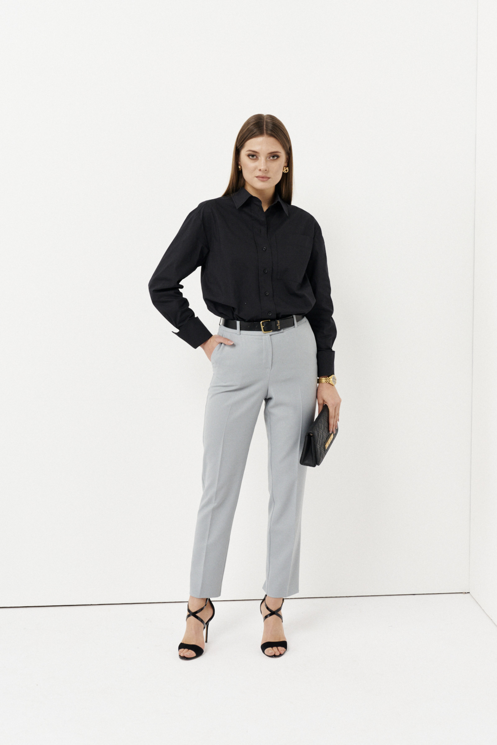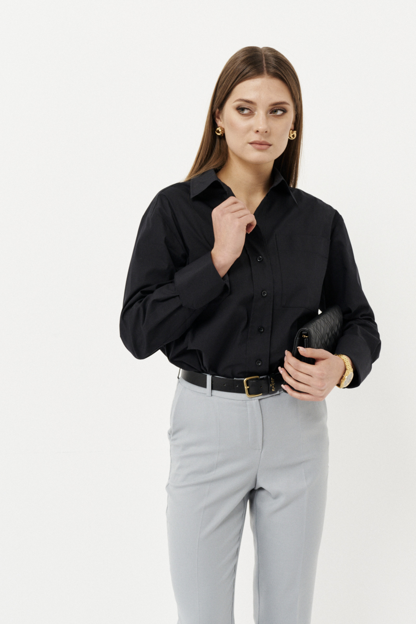 Стильная классическая рубашка от бренда Ketty с необычными модными рукавами. Рукав втачной со средним швом. По низу рукава оформлен высокий отложной манжет, который легко отрегулирует длину рукава. Воротник рубашечный, отложной, на стойке. Застёжка спереди центральная на планку с петлями и пуговицами. Спереди выполнен один нагрудный карман. Спинка длиннее переда, на спинке сделана встречная складка. Линия низа округлая. Прекрасный вариант рубашки для работы в офисе и на каждый день.