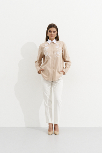 Блуза женская от бренда Ketty из улучшенной вискозы--модала. Блуза прямого силуэта, укороченная. По переду накладные карманы со встречной складкой с клапаном. Горловина оформлена воротником-стойкой. Линия плеча спущенная. Пройма оформлена отложной манжетой, которая по линии плеча крепиться патой, застёгивающаяся на петлю-пуговицу. По спинке двойная кокетка. Застёжка сквозная на петли-пуговицы. Горловина оформлена воротником-стойкой. По низу переда хвостики-завязки, которые при завязывании создают мягкие складки и добавляют свою изюминку. Все швы закрытые, что говорит о высоком качестве пошива. Прекрасный вариант рубашки для работы в офисе и на каждый день.