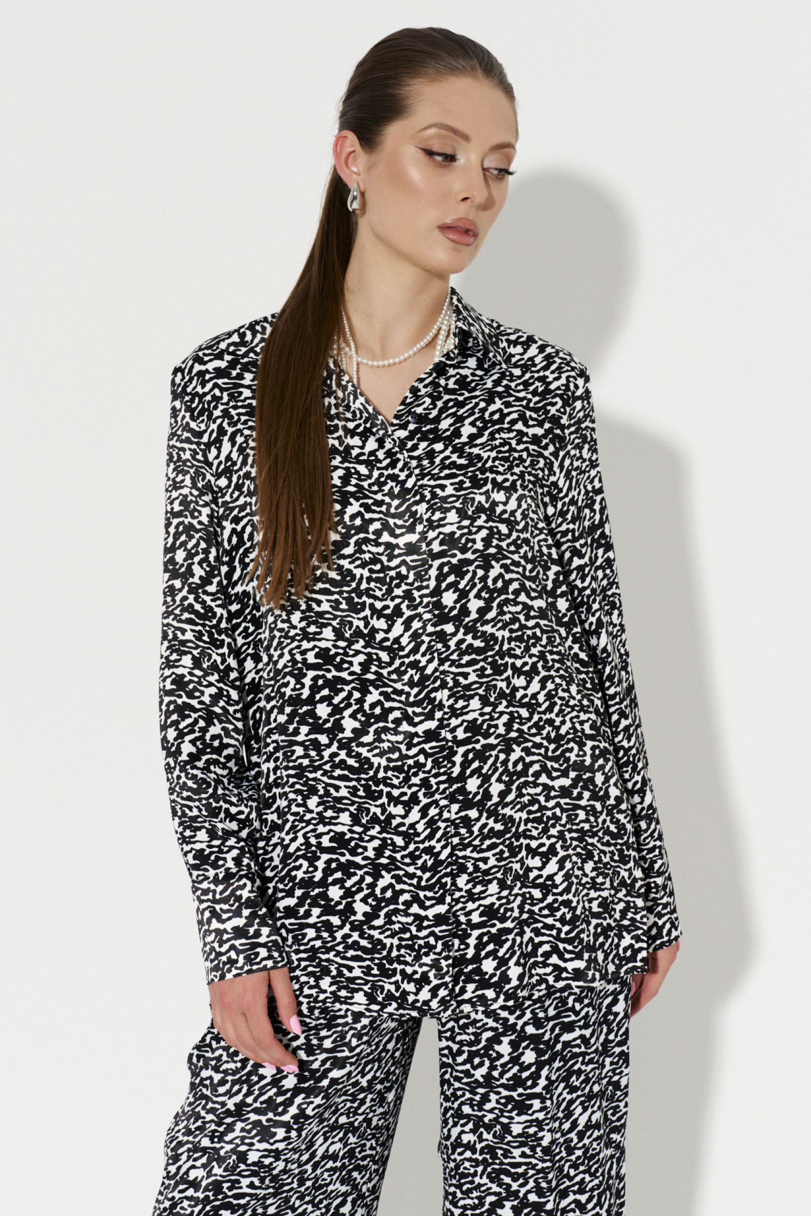 Блузка женская из вискозной ткани для повседневной носки прямого силуэта. Блузка имеет центральную ботовую застежку на петли пуговицы. Горловина обработана рубашечным воротником с отрезной стойкой. Рукава длинные, низ рукава обработан притачной манжетой с застежкой на петли пуговицы. Очень стильная и модная блузка, которая будет гармонично смотреться на вашей фигуре.