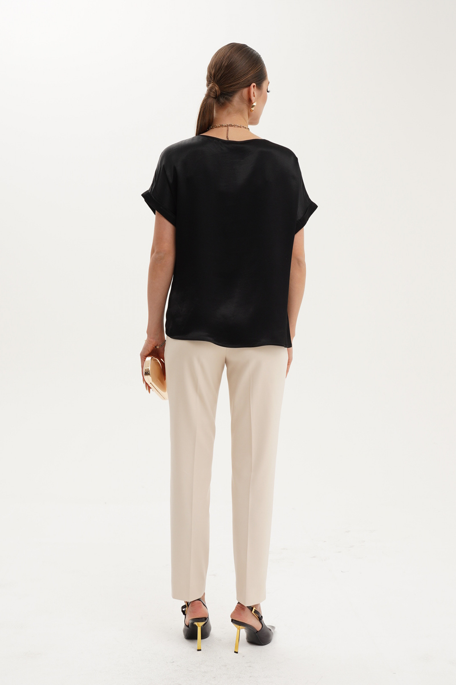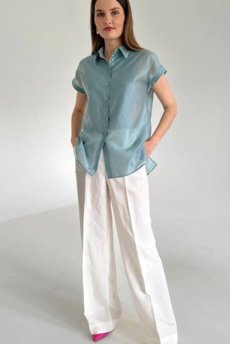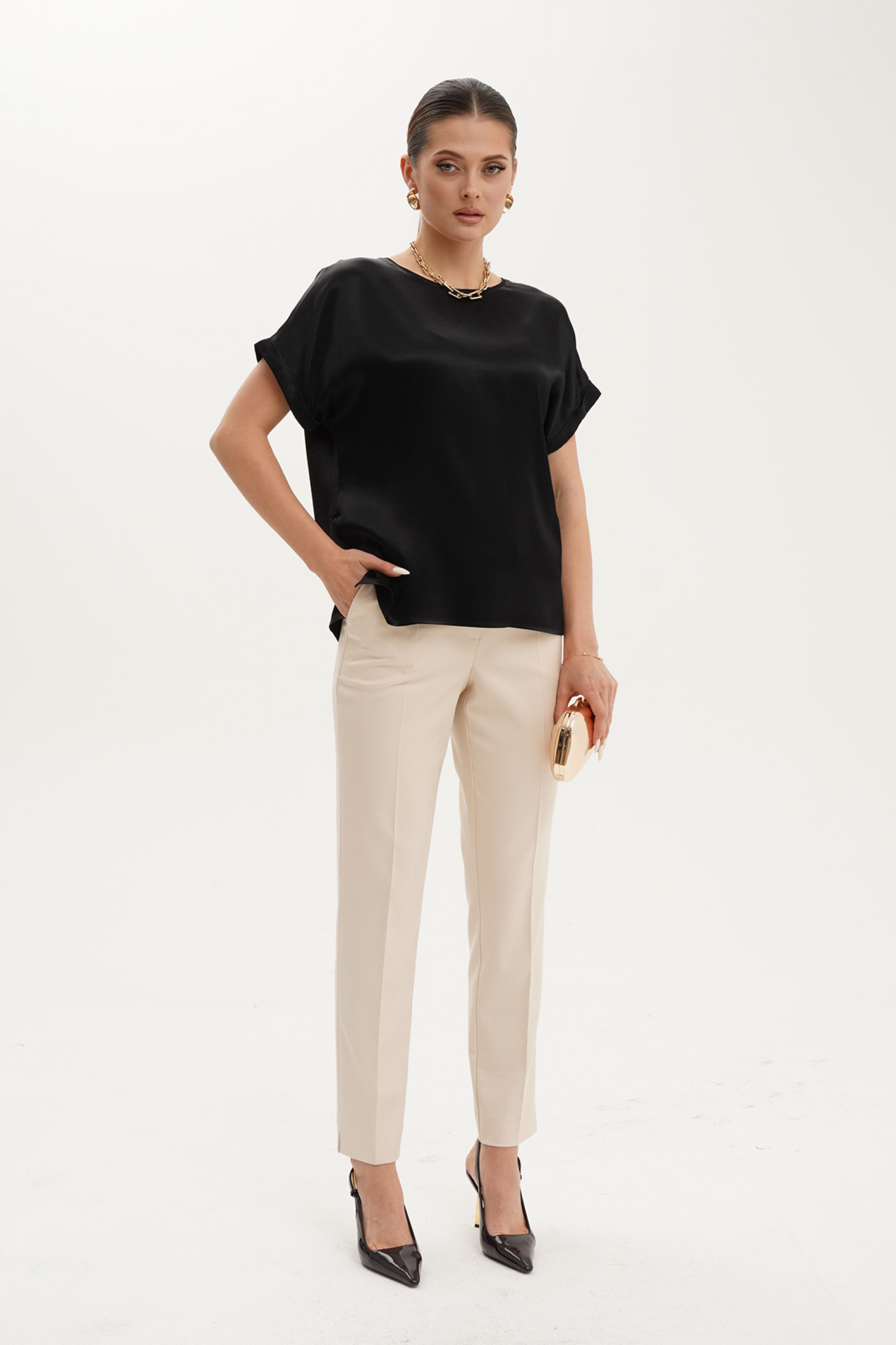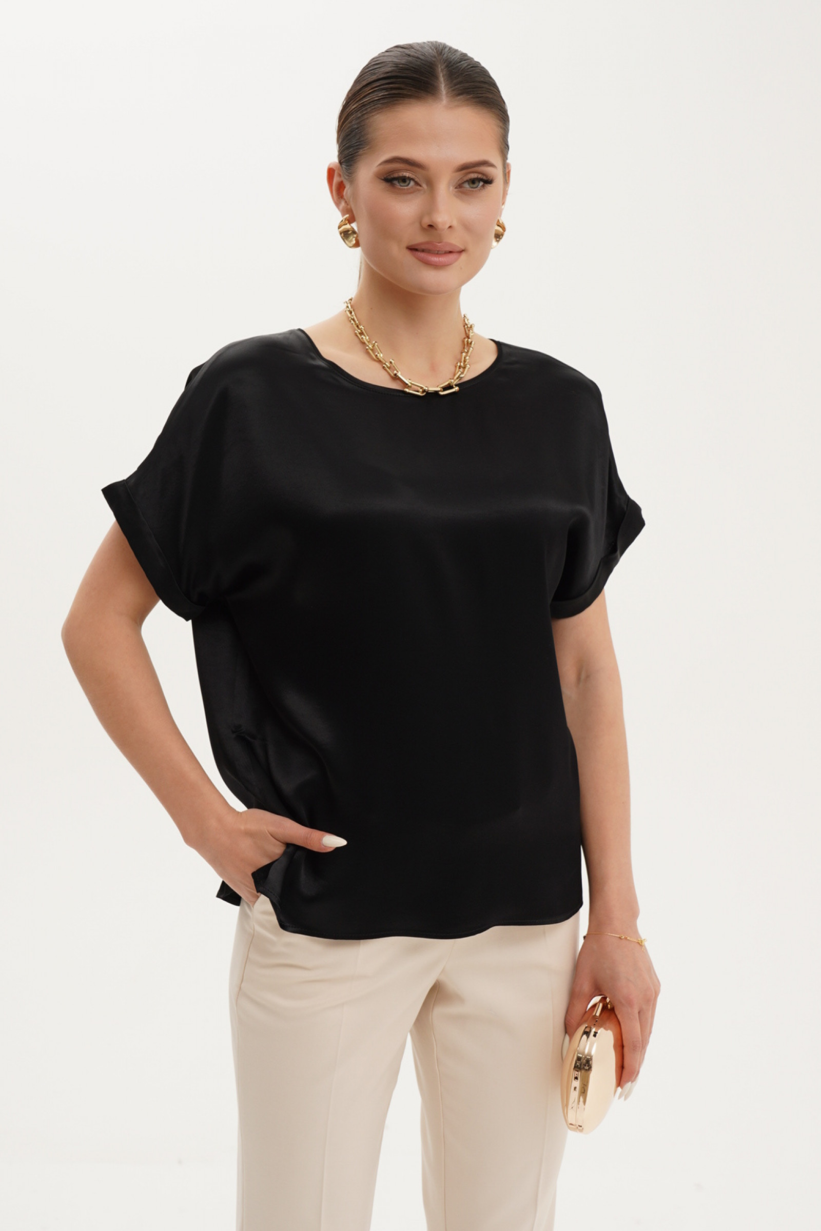 Блузка из вискозной ткани для повседневной носки. Блузка прямого силуэта. Горловина обработана притачной бейкой. Линия плеча слегка спущена. Пройма обработана притачной манжетой. По боковым швам имеются разрезы. Идеальная базовая блузка на любой выход.