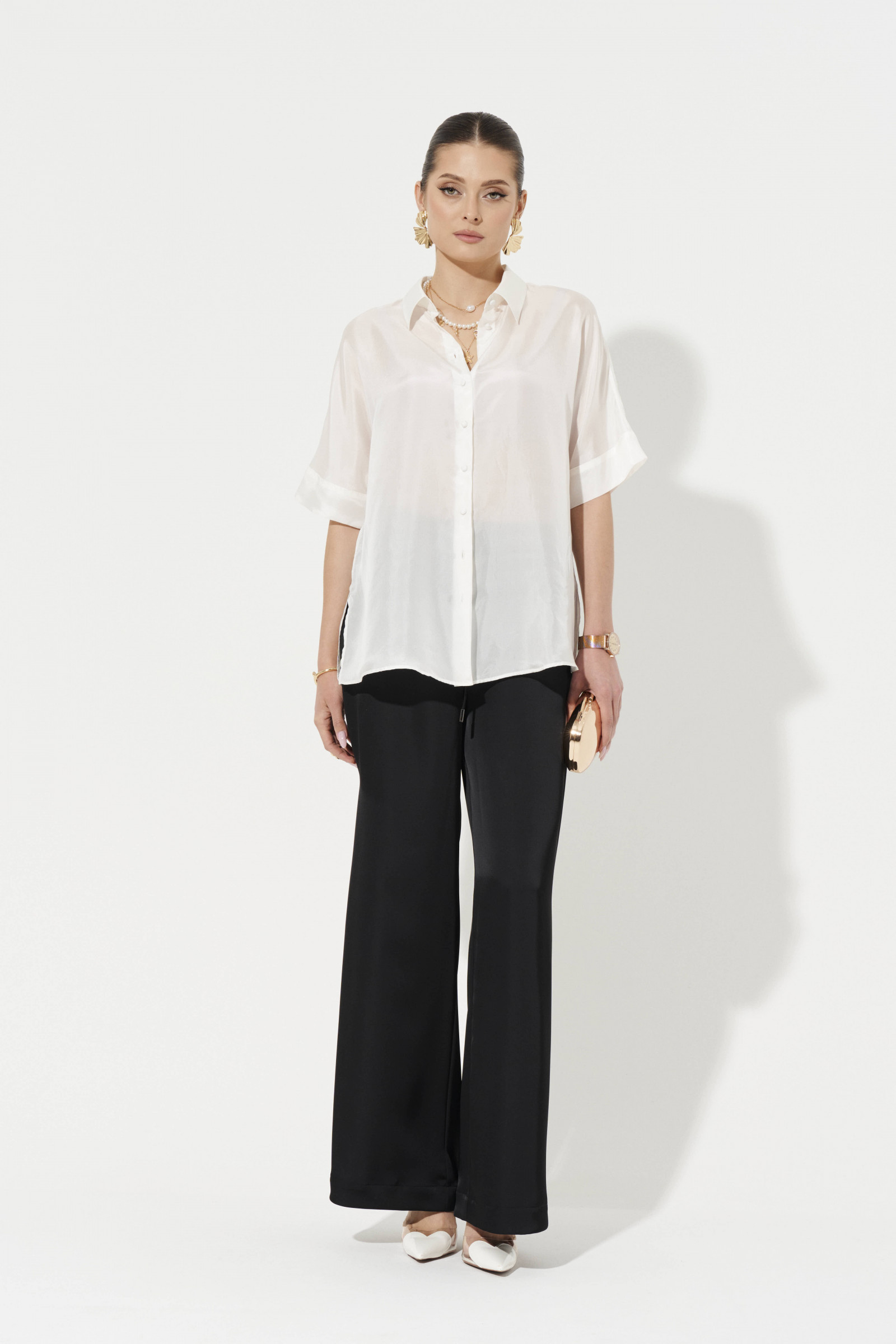 Блузка женская из хлопчатобумажной ткани с добавлением шелка для повседневной и торжественной носки. Застежка центральная бортовая на обметанные петли и пуговицы. В боковых швах имеются небольшие разрезы. Горловина обработана рубашечным воротником с отрезной стойкой. Рукава цельнокроеные, длина чуть ниже локтя, низ рукава обработан притачной манжетой. Красивая и легкая блузочка, в которой вам будет очень комфортно, а главное она станет не заменимой вещью в вашем гардеробе.
