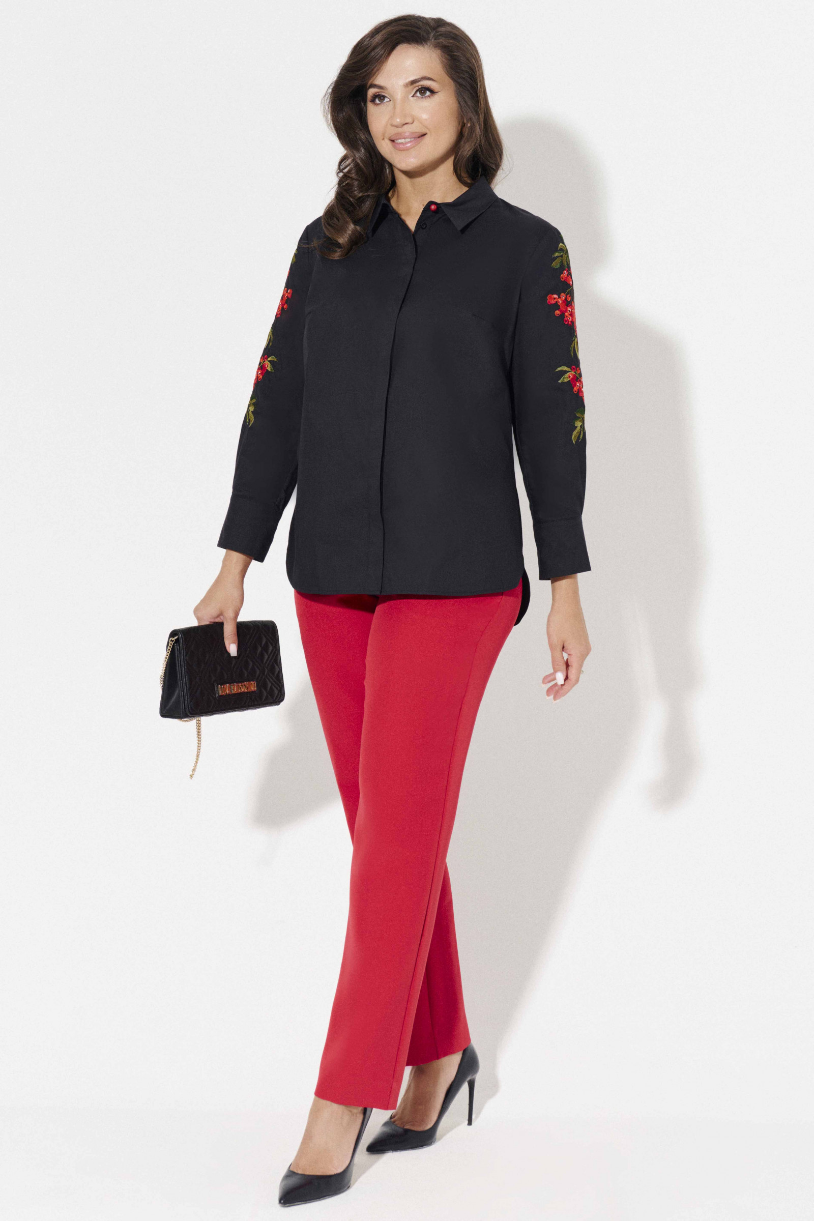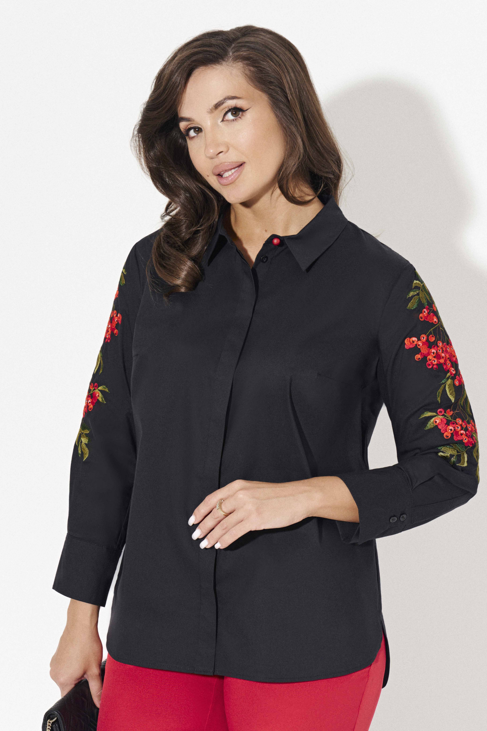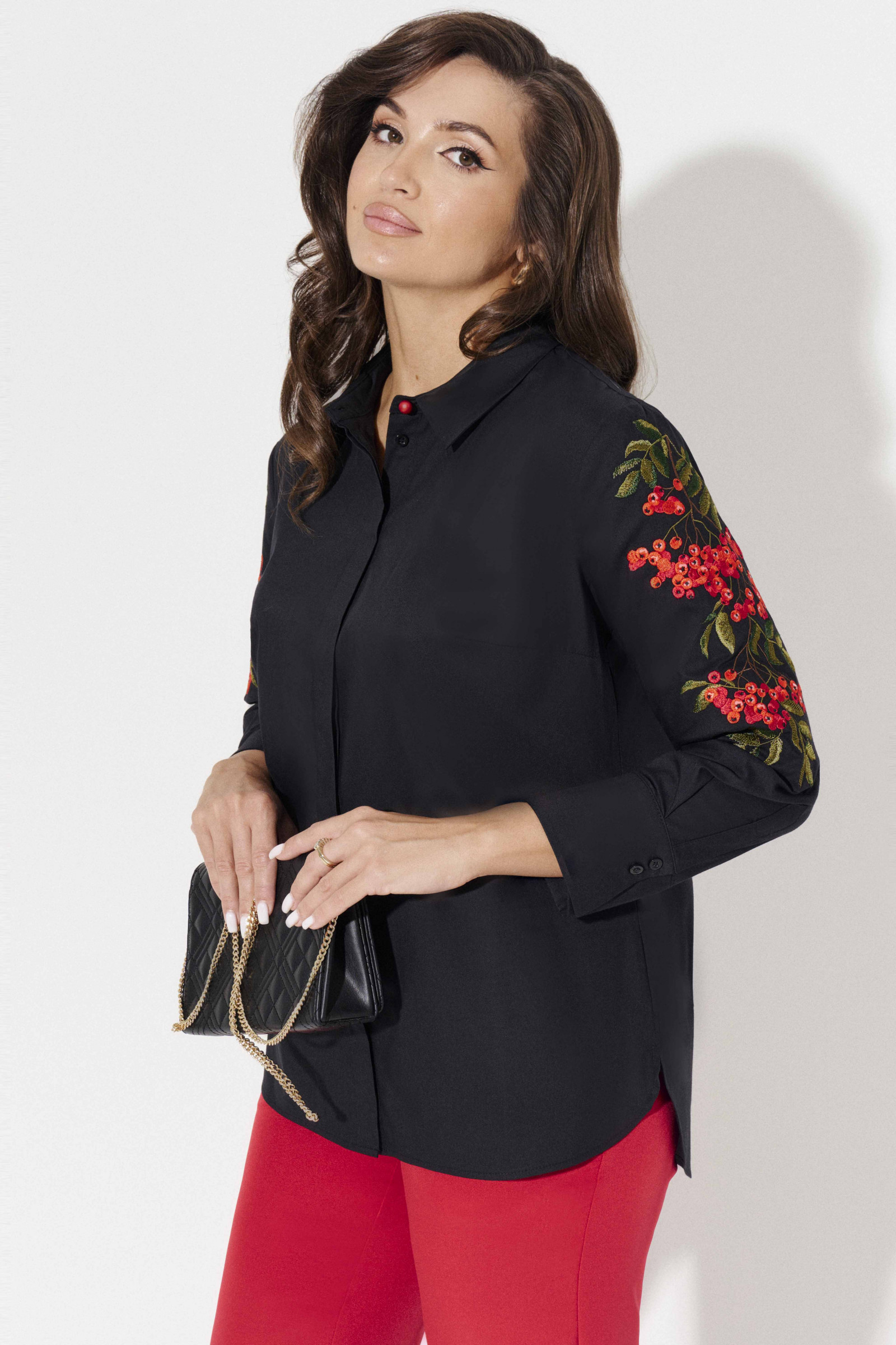 Блузка с вышивкой придаст вашему образу женственность и нежность. Даже в каждодневной суете в ней вы будете ощущать себя элегантной и романтичной натурой. Нарядная блузка подойдет даже под деловой образ со строгими классическими брюками или прямой юбкой. Наденьте ее с любимыми джинсами - и получите эффектный повседневный аутфит. Блузка полуприлегающего кроя визуально стройнит фигуру. Данная блузка украшена гроздьями рябины, вышитыми на длинных рукавах с манжетами. Декор не кажется навязчивым, а придает модели утонченность.Низ изделия - асимметричный, скругленный, с разрезами в боковых швах. Застежка скрыта в потайной центральной планке. Рубашечный воротник украшает пуговица красного цвета. Блузка с вышивкой женская изготовлена из хлопковой ткани с мягкой, гладкой поверхностью. Материал не сминается, не парит, за ним легко ухаживать - стирать и гладить.Вы можете купить рубашку с вышивкой женскую для своего базового осенне-весеннего гардероба.