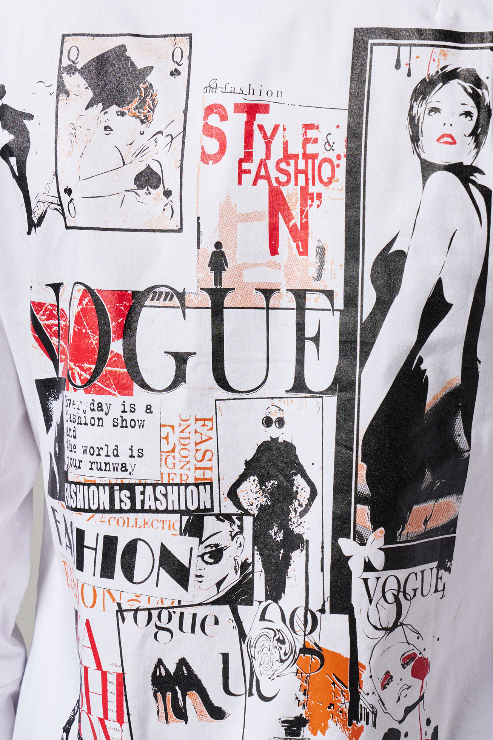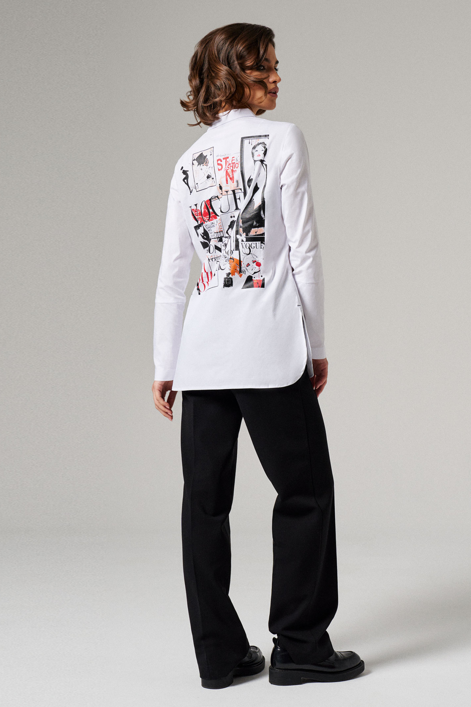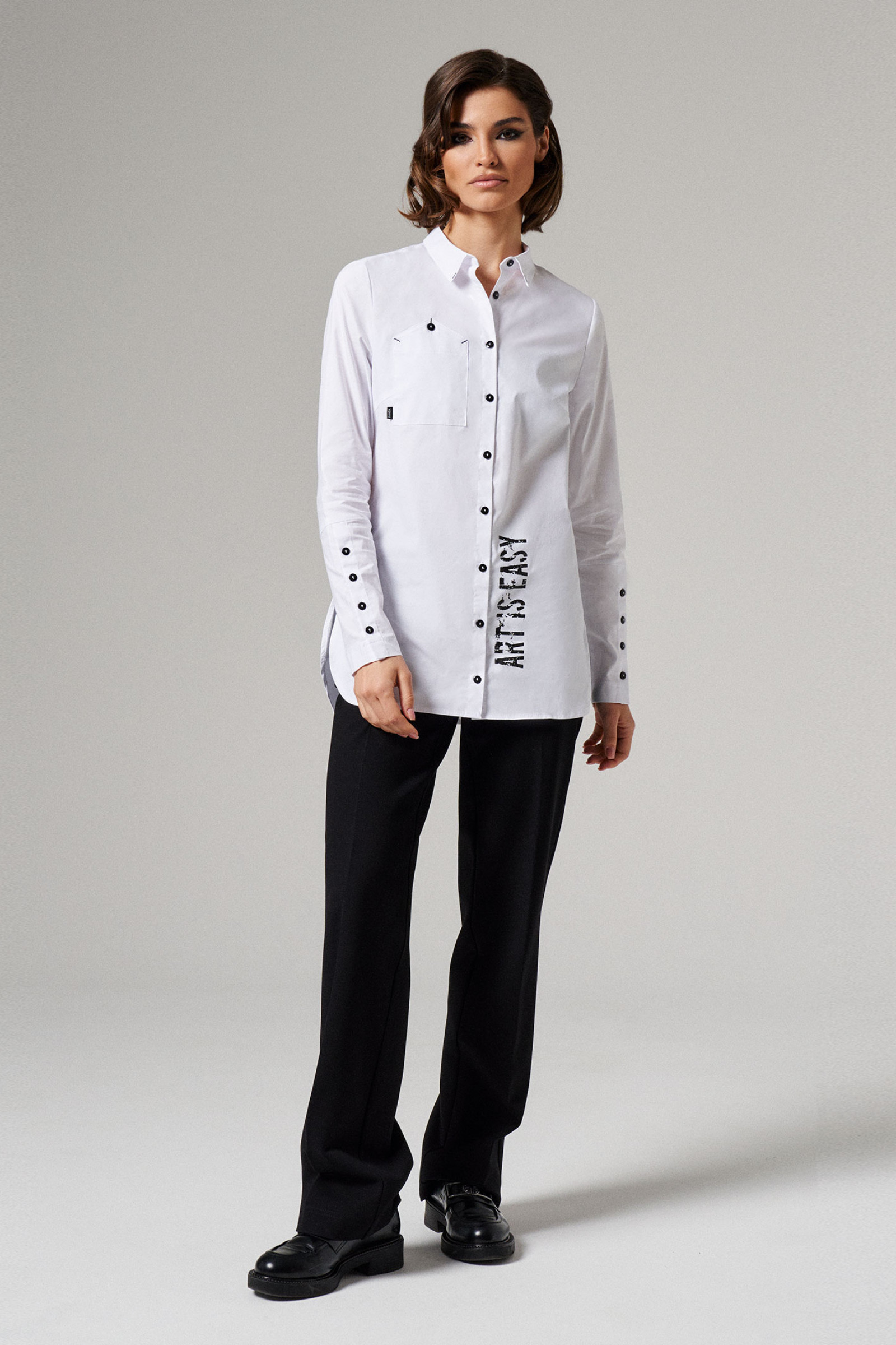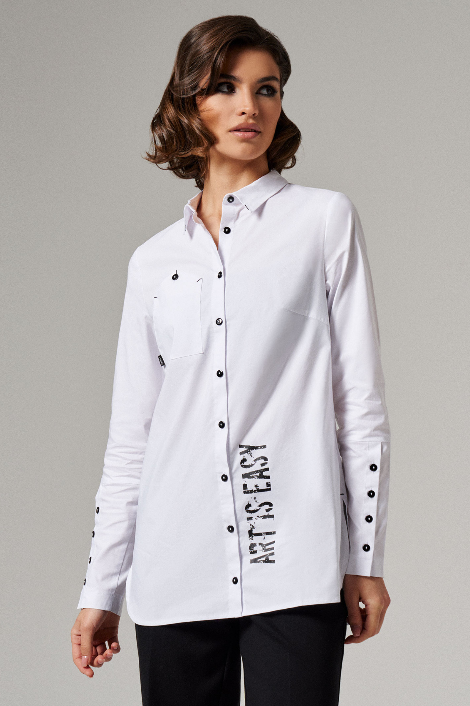 Стильная белая, хлопковая блузка, перестанет быть скучной, благодаря деталям отделки, которые дизайнеры подобрали наилучшим образом. Блузка полуприлегающего силуэта, с застежкой на петли пуговицы контрастного черного цвета, на деталях переда верхний карман, оригинальной формы, с закрепками контрастного черного цвета, на левой детали шрифтовая печать. Спинка прямая, с декоративной оригинальной печатью, придает блузки самодостаточность. В этой блузке, вы будите притягивать взгляды окружающих.