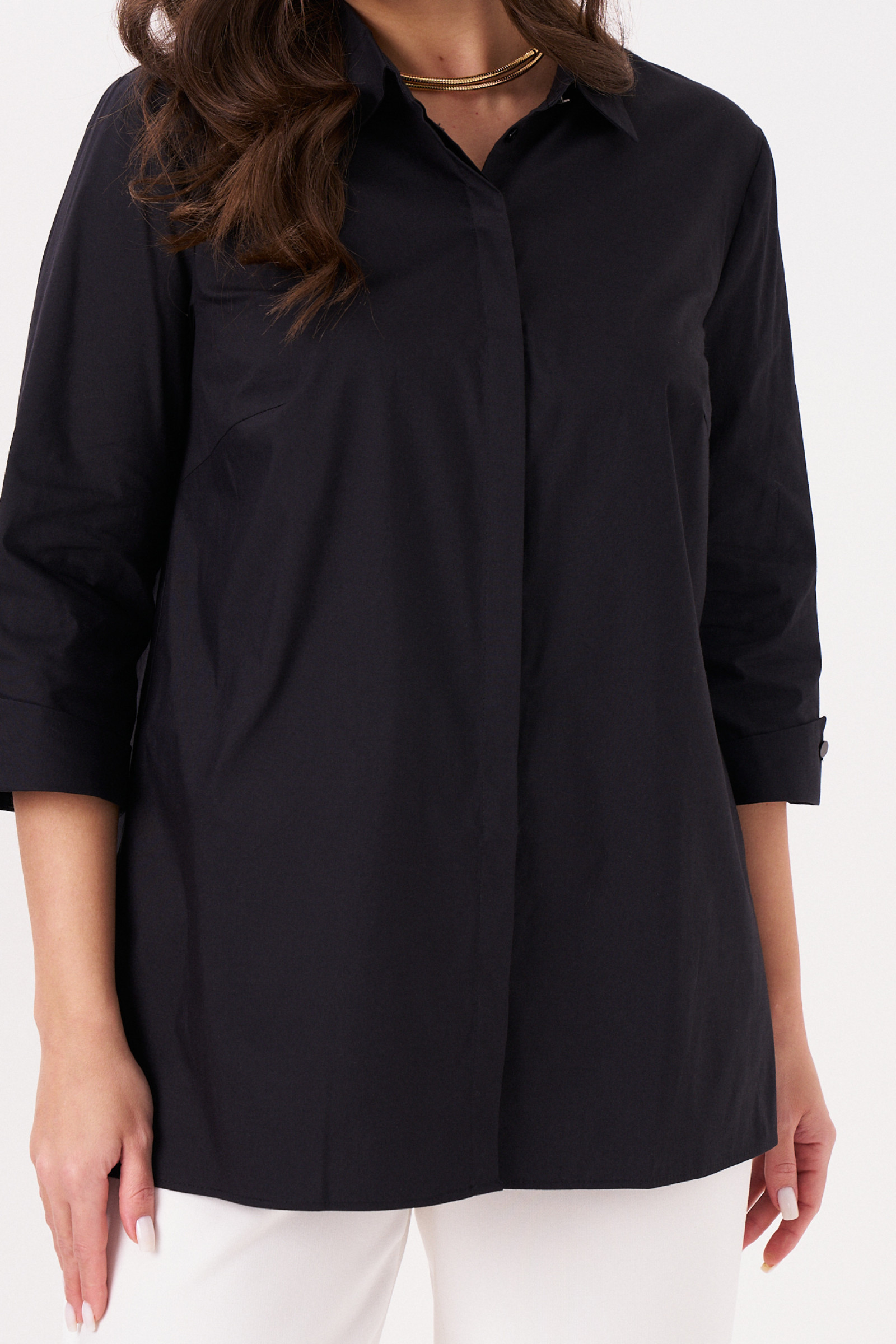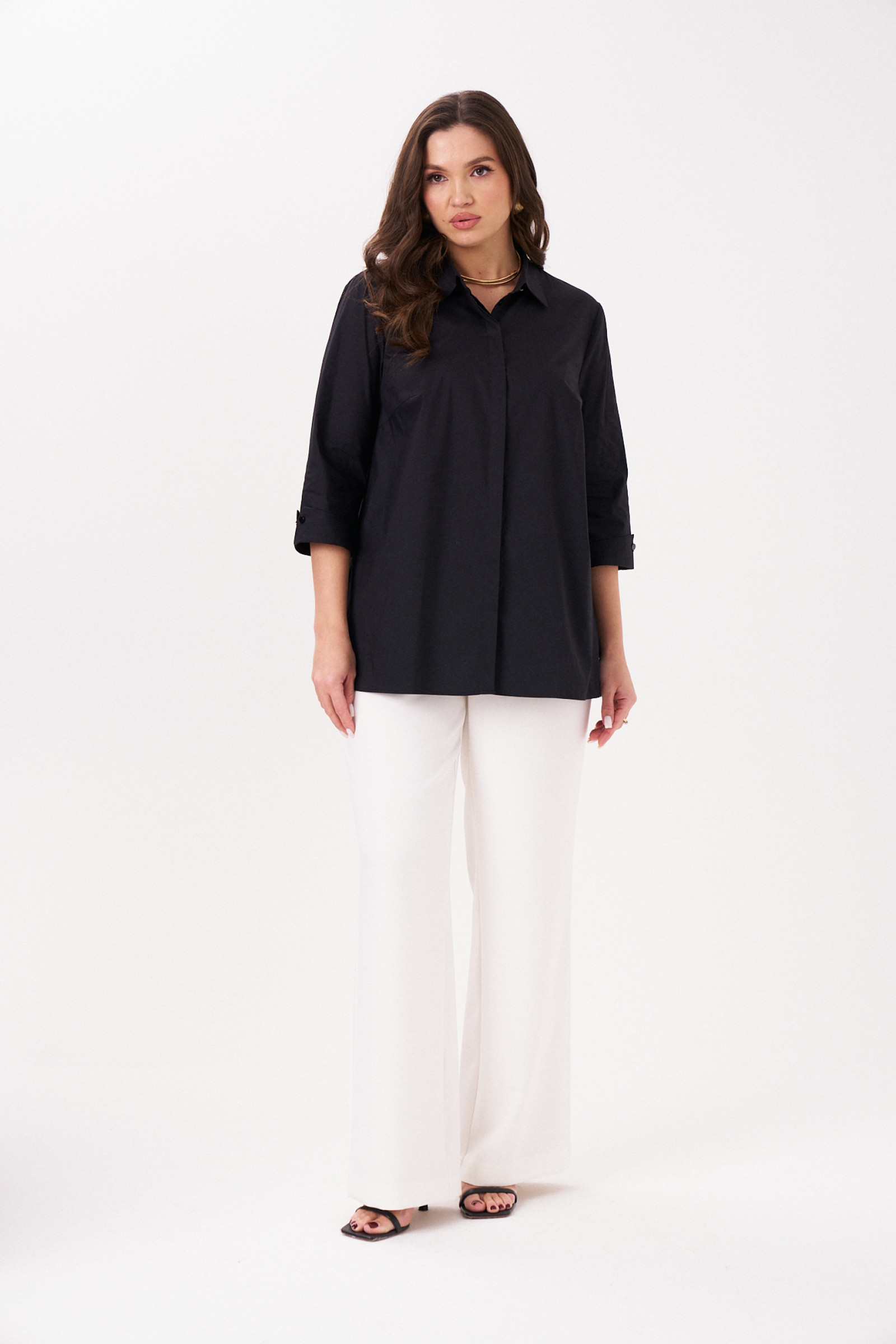 Блузка женская с длинным рукавом больших размеров изготовлена из хлопковой ткани с полиэстером и эластаном. Рукав 7/8 с отложными манжетами украшен декоративными пуговицами и петлями. Рубашка женская белая дополнена отложным воротником сорочечного типа. Застегивается на потайные пуговицы и петли, скрытые под центральной планкой.