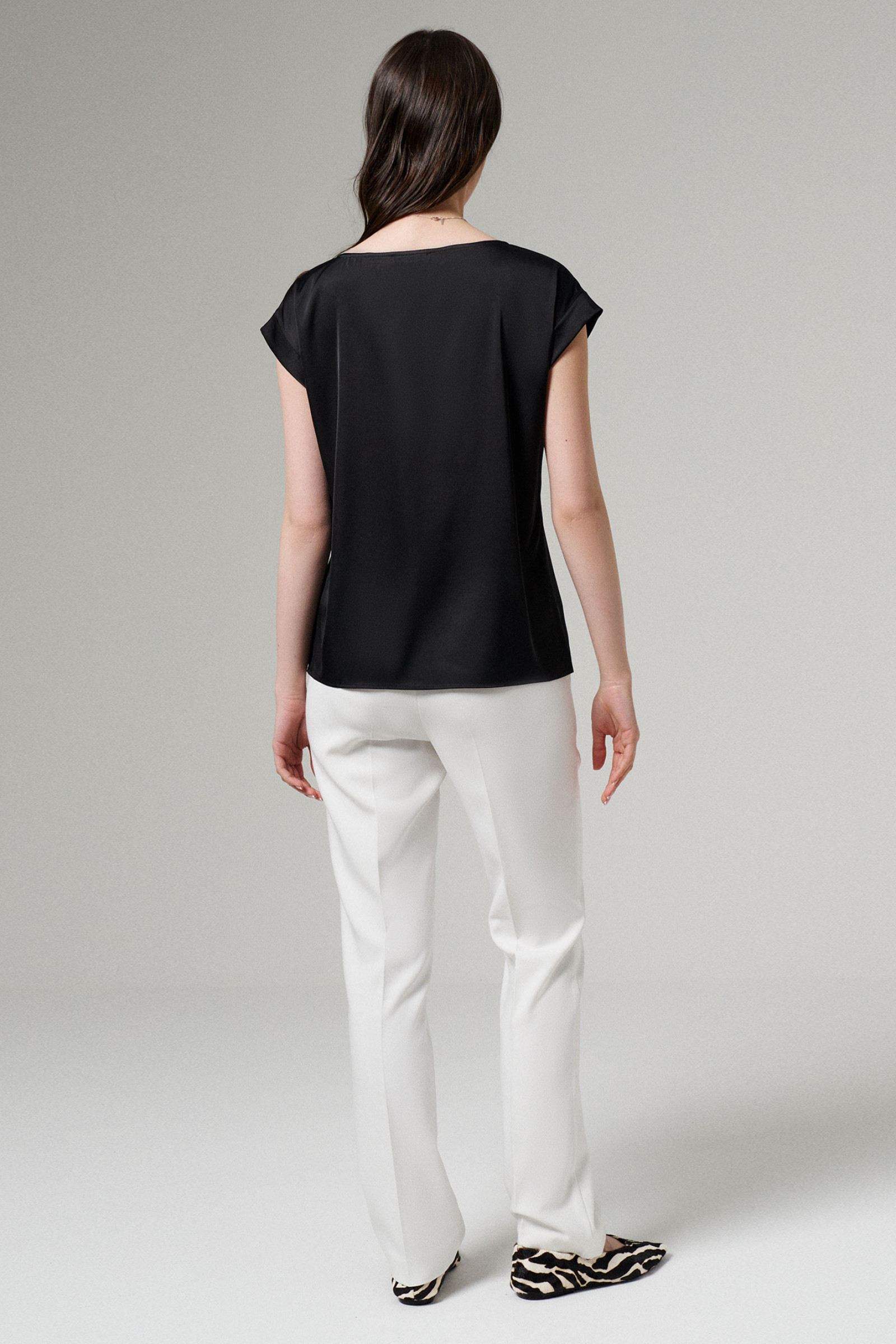 Блузка женская с коротким рукавом выглядит изящно благодаря мягкой ткани с характерным блеском. Она изготовлена из полиэстера и эластана - износоустойчивой и приятной на ощупь ткани, которая легко тянется и хорошо пропускает воздух. Блузка с коротким рукавом, вырезом горловины «лодочка» и аккуратно обработанным низом выполнена в прямом фасоне.