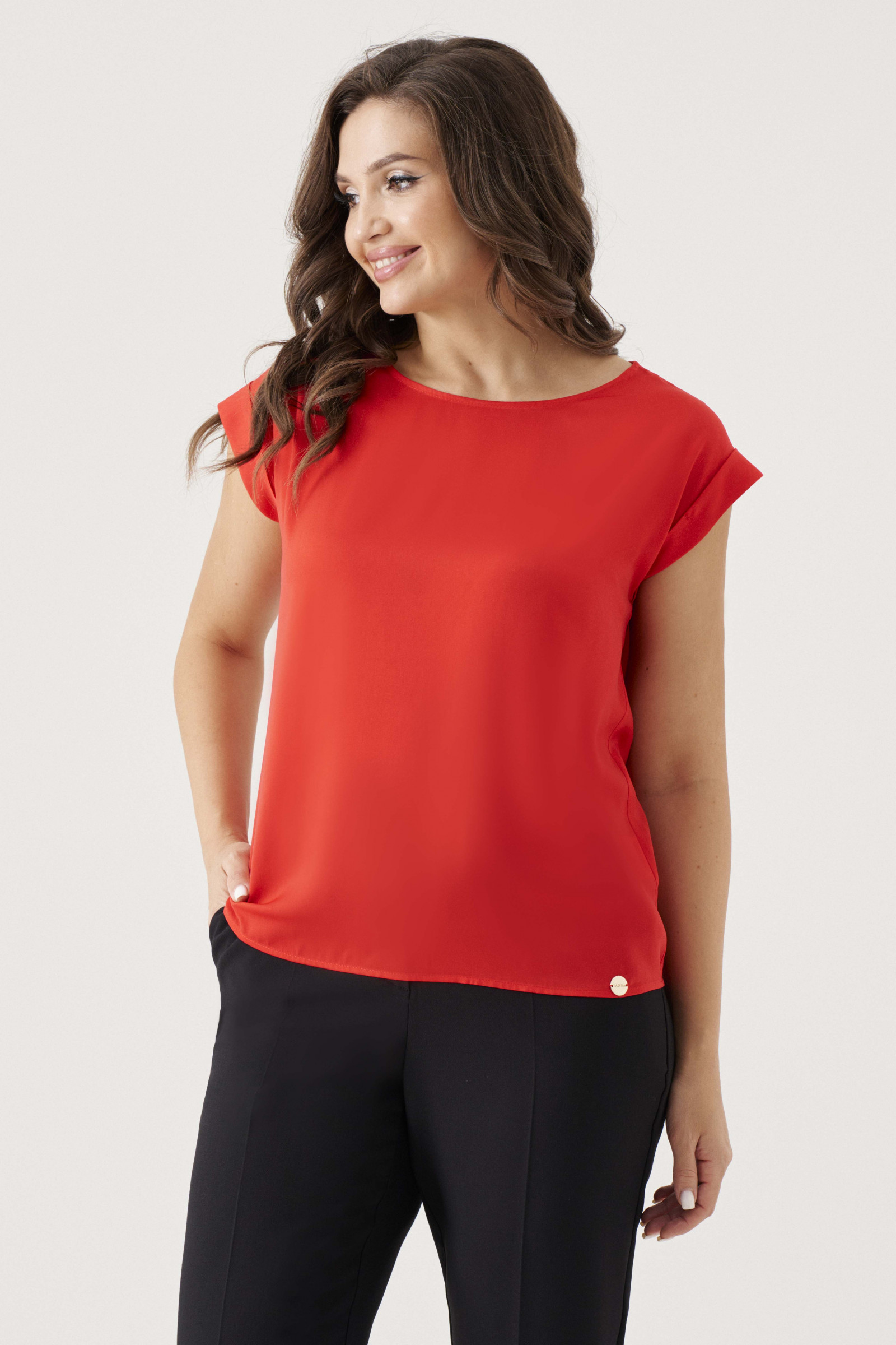 Блузка женская с коротким рукавом выглядит изящно благодаря мягкой ткани с характерным блеском. Она изготовлена из полиэстера и эластана - износоустойчивой и приятной на ощупь ткани, которая легко тянется и хорошо пропускает воздух. Блузка с коротким рукавом, вырезом горловины «лодочка» и аккуратно обработанным низом выполнена в прямом фасоне.