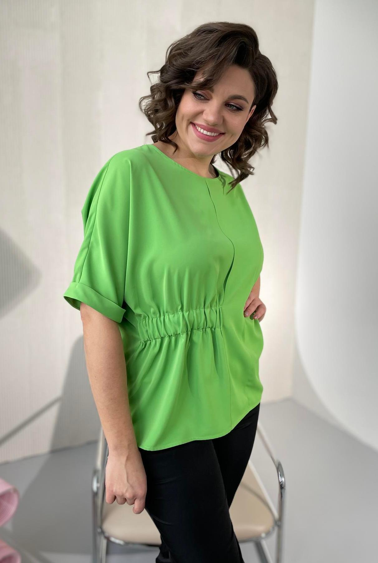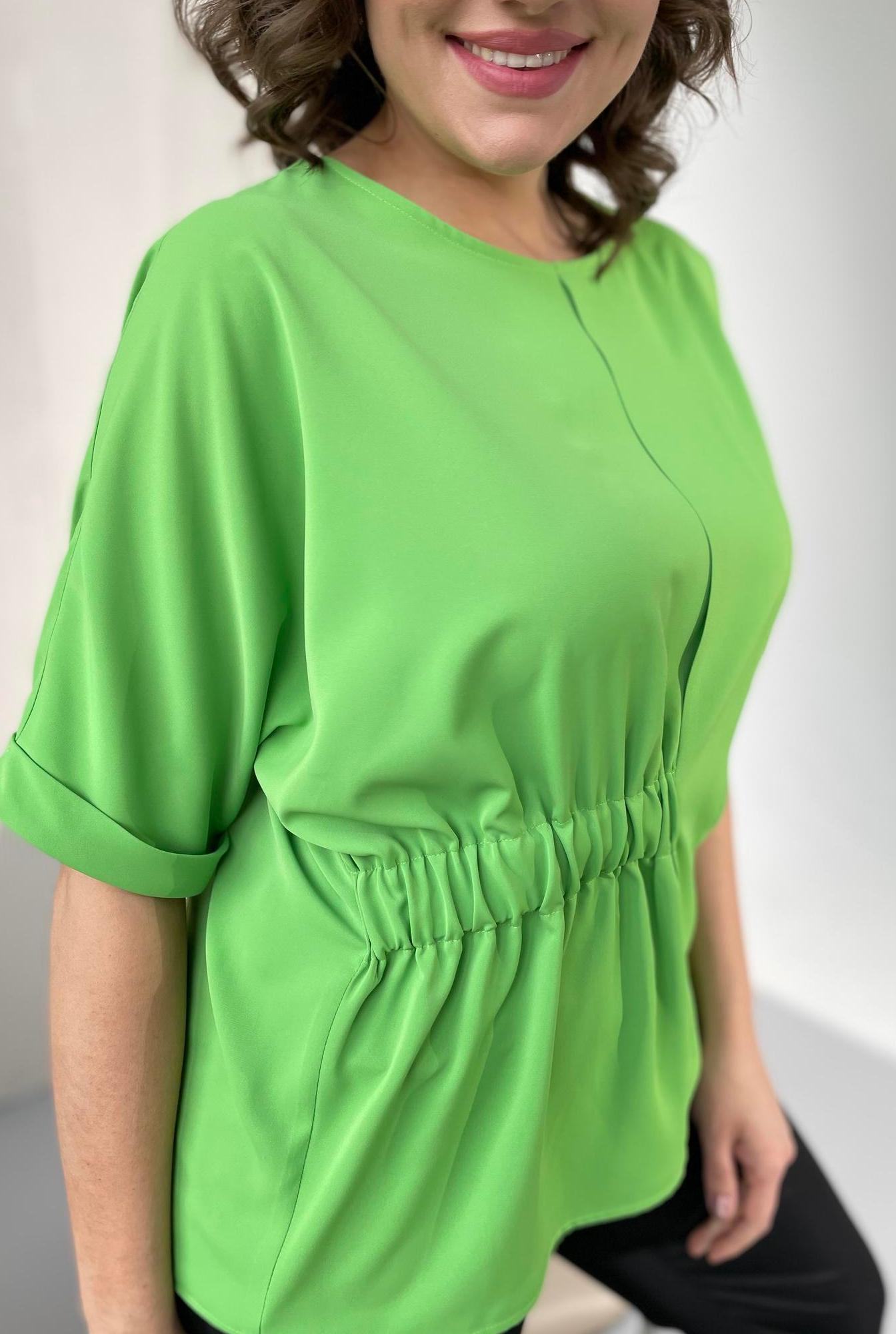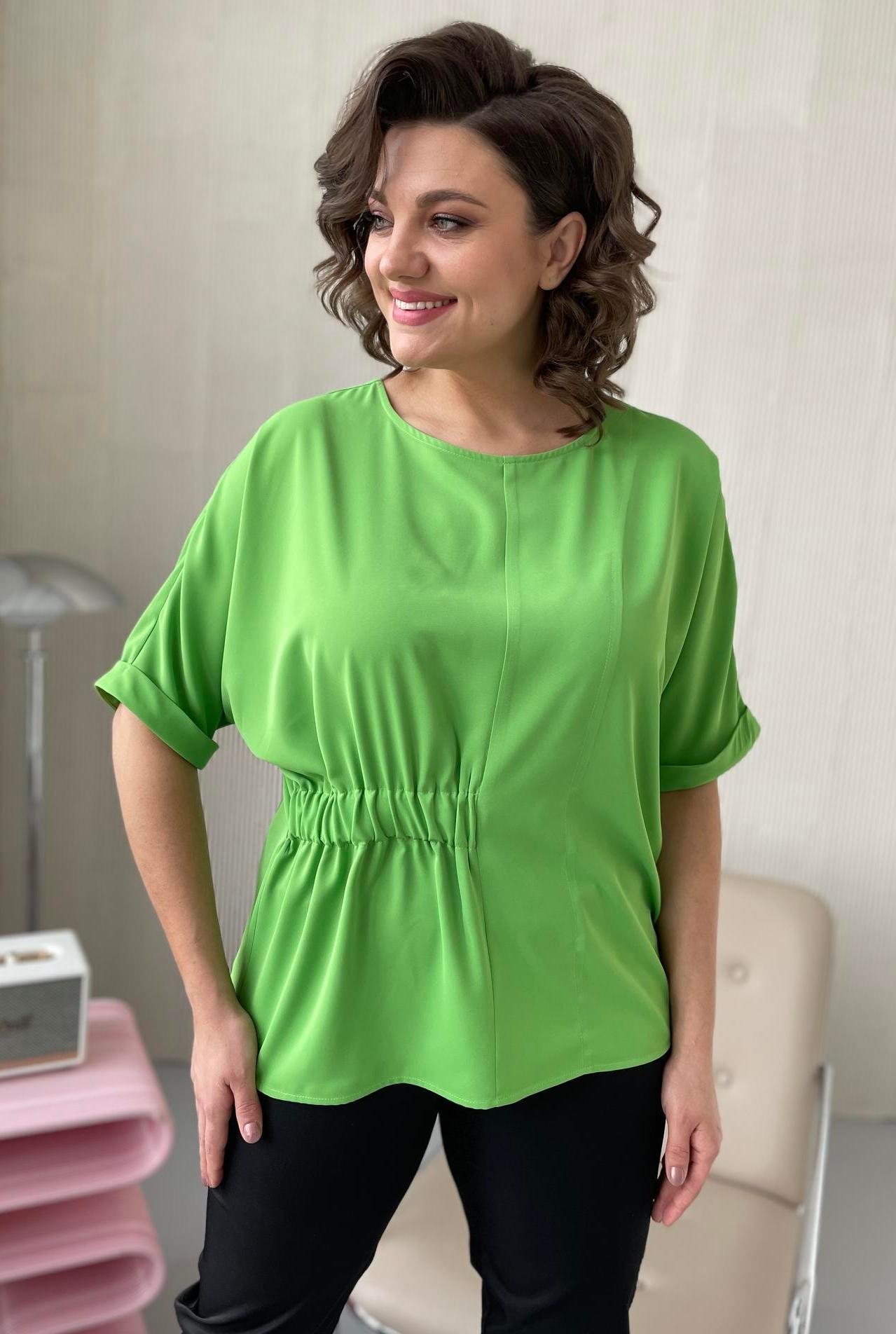 "Блузка женская из текстильной ткани ,свободного силуэта. Вырез горловины лодочка. Спущенный рукав оформлен притачной манжетой. Перед блузы оформлен декоротивными подрезами. По талии вставлена резинка. Спинка блузы со средним швом.