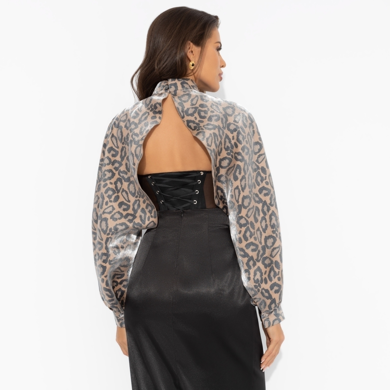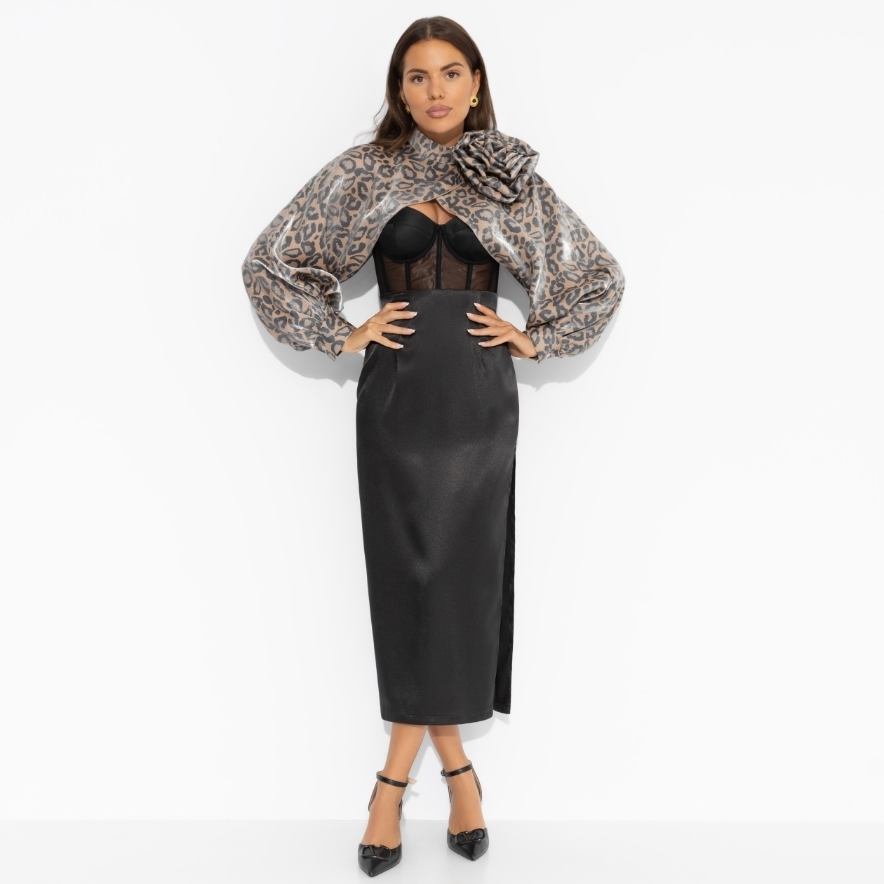 Для тех, кто избегает масштабного леопардового принта, дизайнеры ЧАРУТТИ создали болеро. Добавляйте дозированную порцию анималистичной расцветки в любые образы – с джинсами, вечерними платьями или деловыми юбками. Болеро из мерцающей органзы со свободными рукавами. Брошь-роза съемная. Деликатная пуговица в тон изделия сзади.
