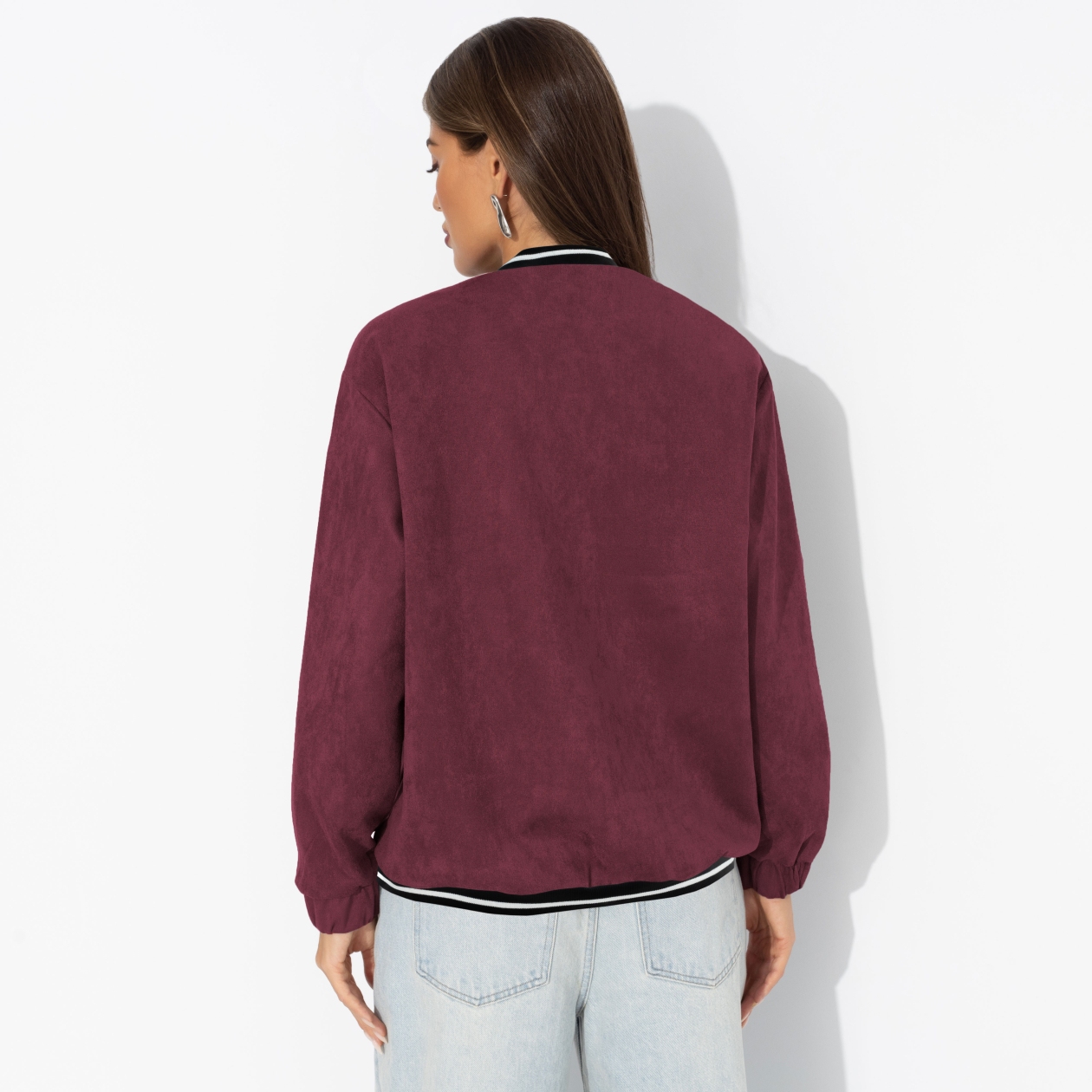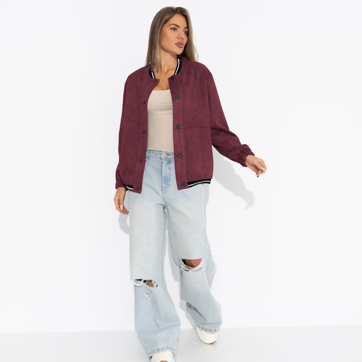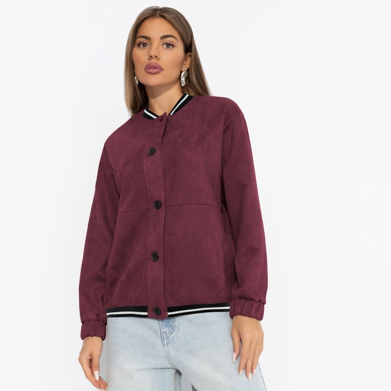 Бордовый бомбер из экозамши, как бокал терпкого вина в осенний вечер: мягкий, дерзкий, с намёком на страсть. Ты надеваешь его – и весь мир обязан любоваться. Бомбер свободного кроя. Изделие застегивается на пуговицы. Есть карманы.