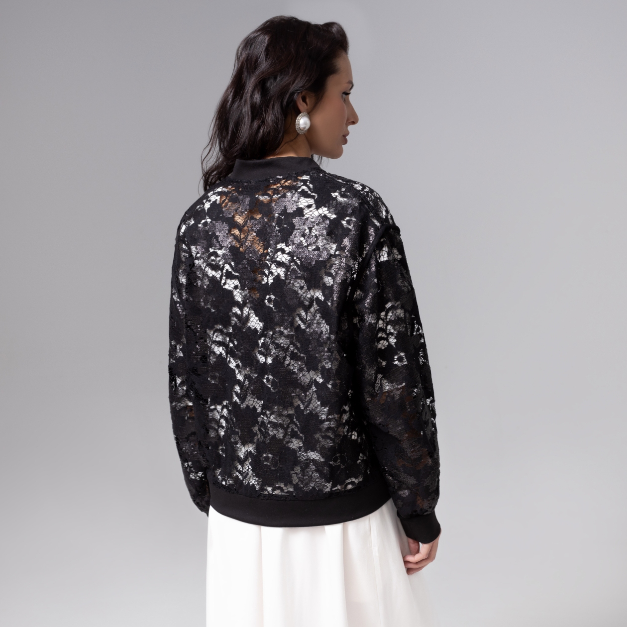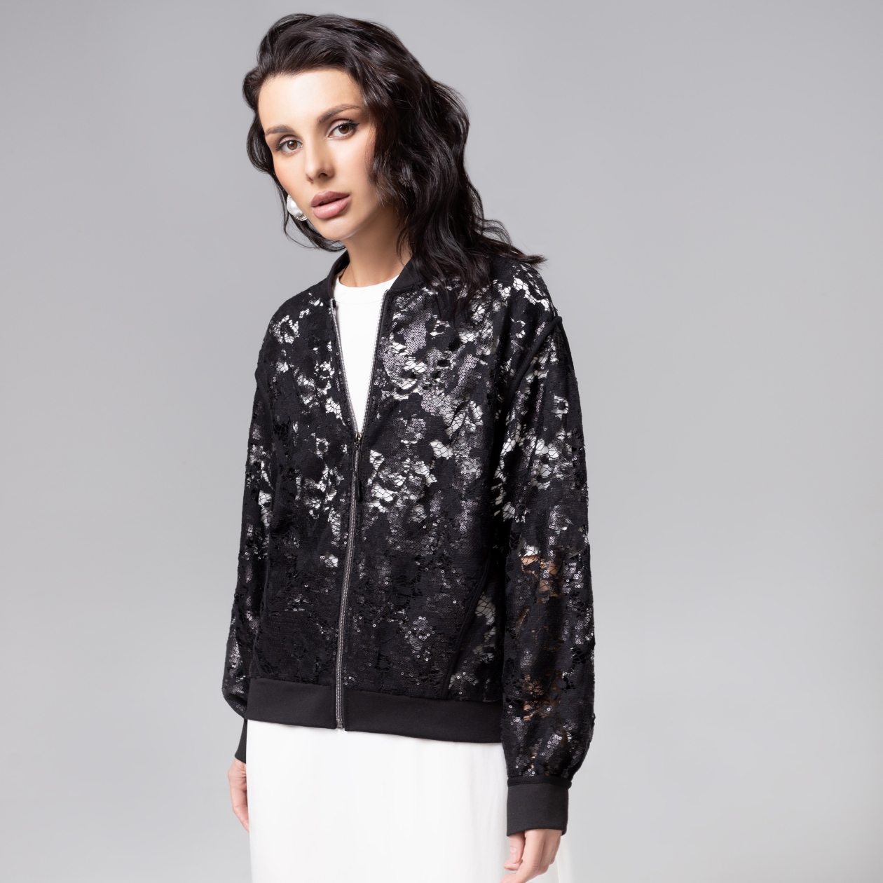 Ажурное кружево и мерцание пайеток превращают бомбер в откровение. Он шепчет о тайных встречах и ярких эмоциях, оставляя после вас лёгкий след блеска и мечтаний. Безупречный пошив демонстрирует ювелирная аккуратность обработки швов, а продуманный крой гарантируюет безупречную посадку по фигуре. Бомбер с карманами.