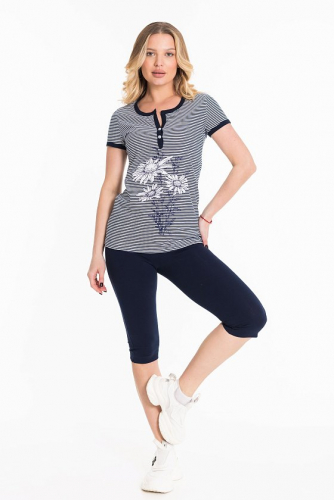 Бриджи женские, однотонные, выполнены из хлопкового полотна с добавлением лайкры. Пояс широкий со шнурком, низ на планке. С левой стороны нанесён принт. Удобные спортивные бриджи отлично смотрятся в сочетании с майкой 31708П, выполненной из такого же полотна.