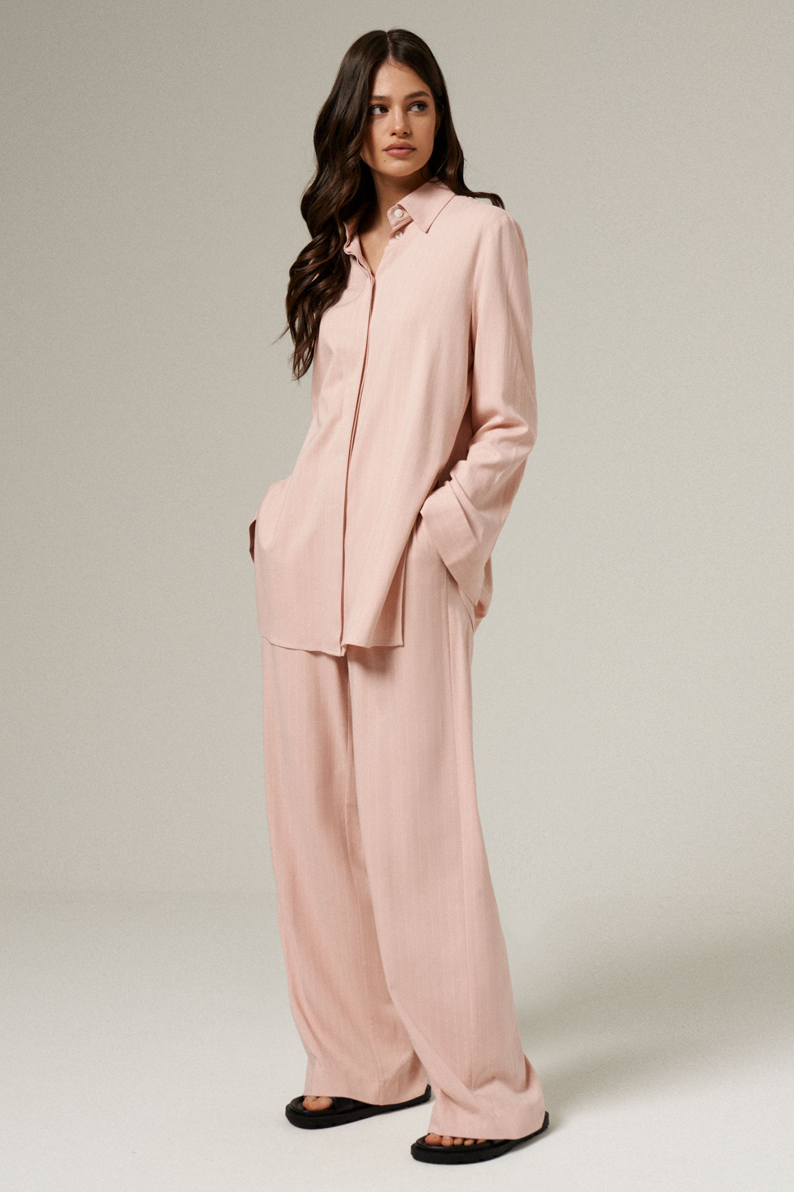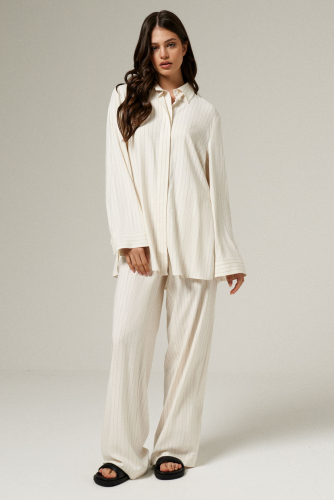 Комплект женский из вискозной ткани для повседневной носки. В комплект входят рубашка и брюки. Рубашка прямого силуэта с фронтальной потайной застежкой на пуговицы, воротником стойкой. В боковых швах разрезы от низа изделия. Длина рубашки классическая. Брюки прямого силуэта на поясе с прорезными карманами в боковых швах. Длина брюк классическая.
