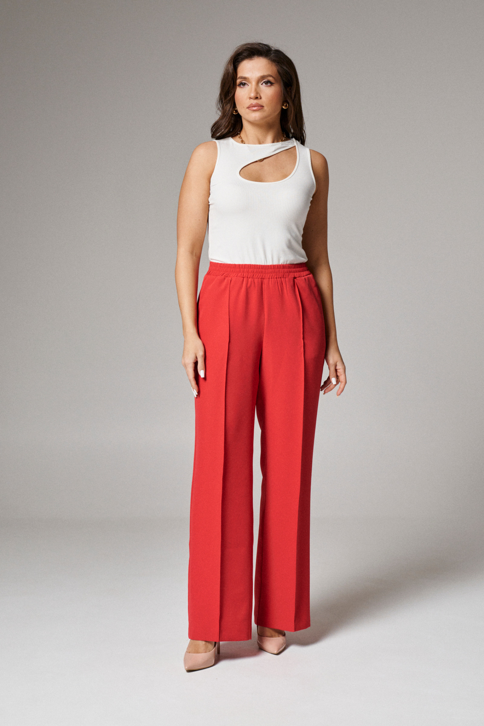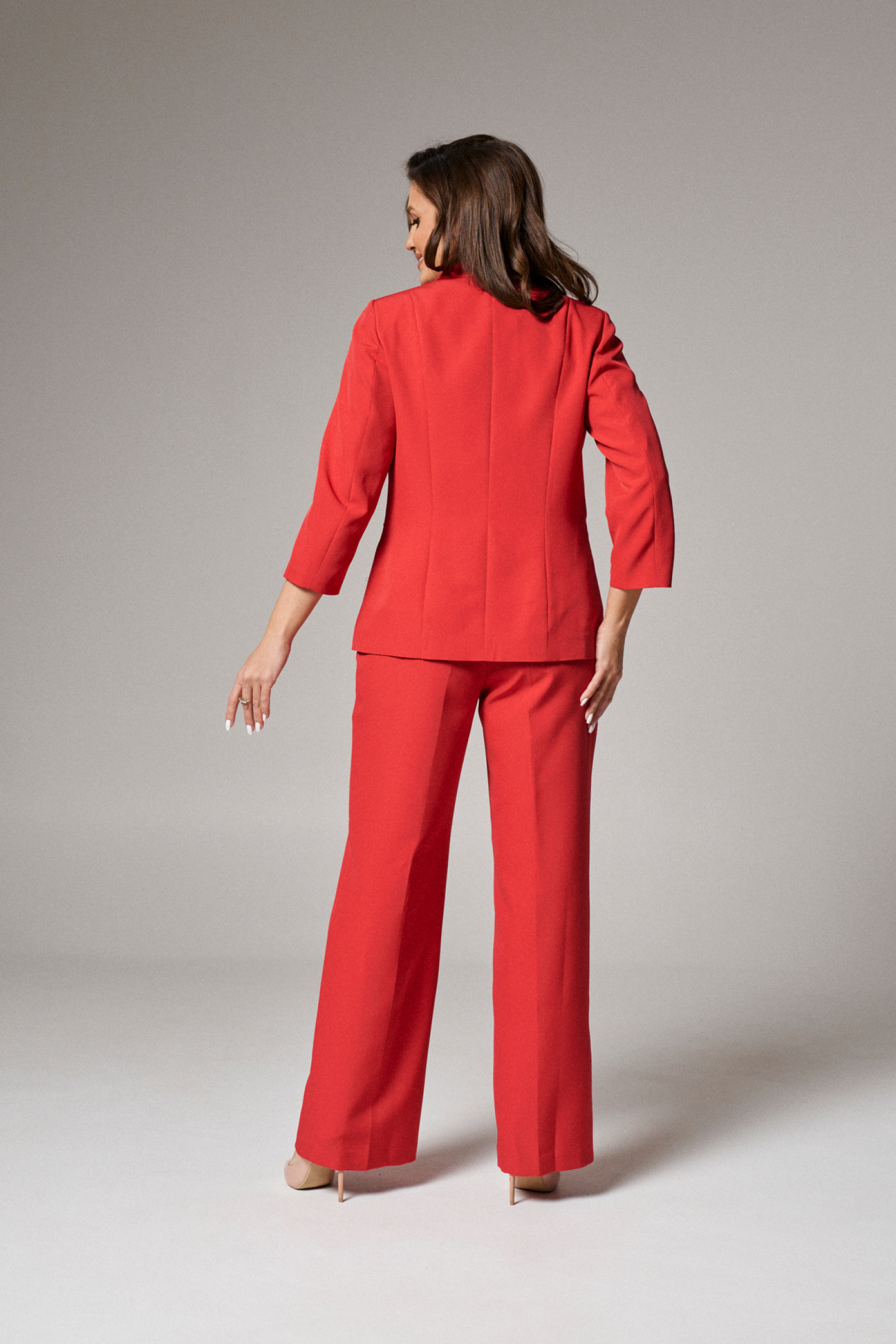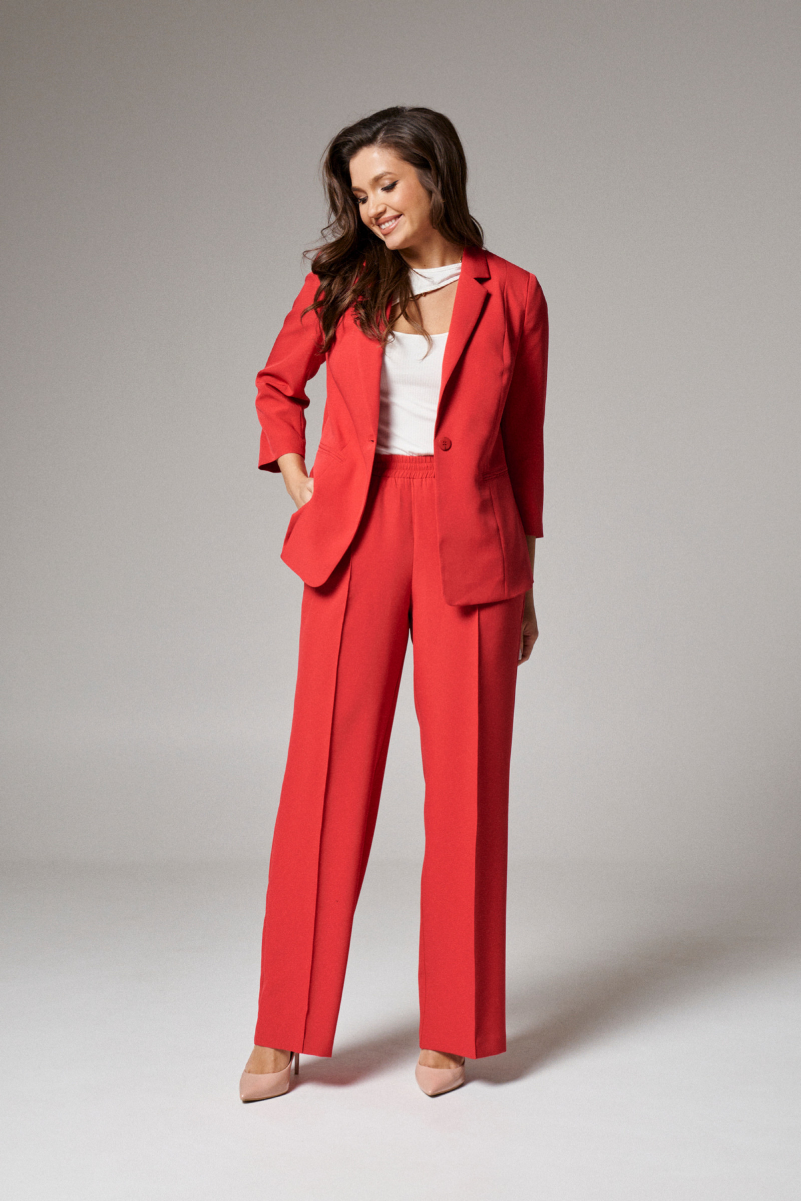 Костюм женский из костюмной, смесовой ткани для повседневной носки. Костюм состоит из жакета и брюк. Жакет однобортный, с центральной бортовой застежкой на одну петлю и одну пуговицу. Перед имеет рельефные швы, идущие от линии плеча до линии низа. По переду располагаются прорезные карманы в рамку с двумя обтачками. Спинка имеет вертикальные швы. Горловина обработана пиджачным воротником. Рукава двухшовные длинные. Брюки классической длины прямые с посадкой на талии. Верхний срез брюк обработан притачным поясом на резинке. Стильный и красивый костюм осчастливит вас своим изящным видом.