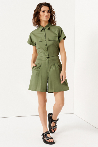 Брюки из кружевной ткани имеют притачной пояс с вставкой на резинке в задней части и украшены складками на передней части, что добавляет изящества и женственности образу.