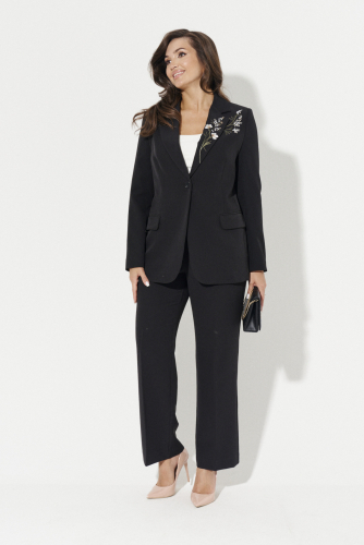 Женский брючный костюм выполнен из мягкой поливискозной ткани. Жакет украшен талиевыми вытачками, двумя карманами с листочкой и застежкой на пуговицы по центральной линии. Спинка оформлена со средним швом, горловина обработана пиджачным воротником, придающим образу элегантность. Длинные, двухшовные рукава делают модель универсальной. В области талии есть пояс из основной ткани, который можно продевать через шлевки для придания формы. Этот жакет сочетает комфорт и стиль, идеально подходит для различных случаев — от повседневных прогулок до торжественных мероприятий.