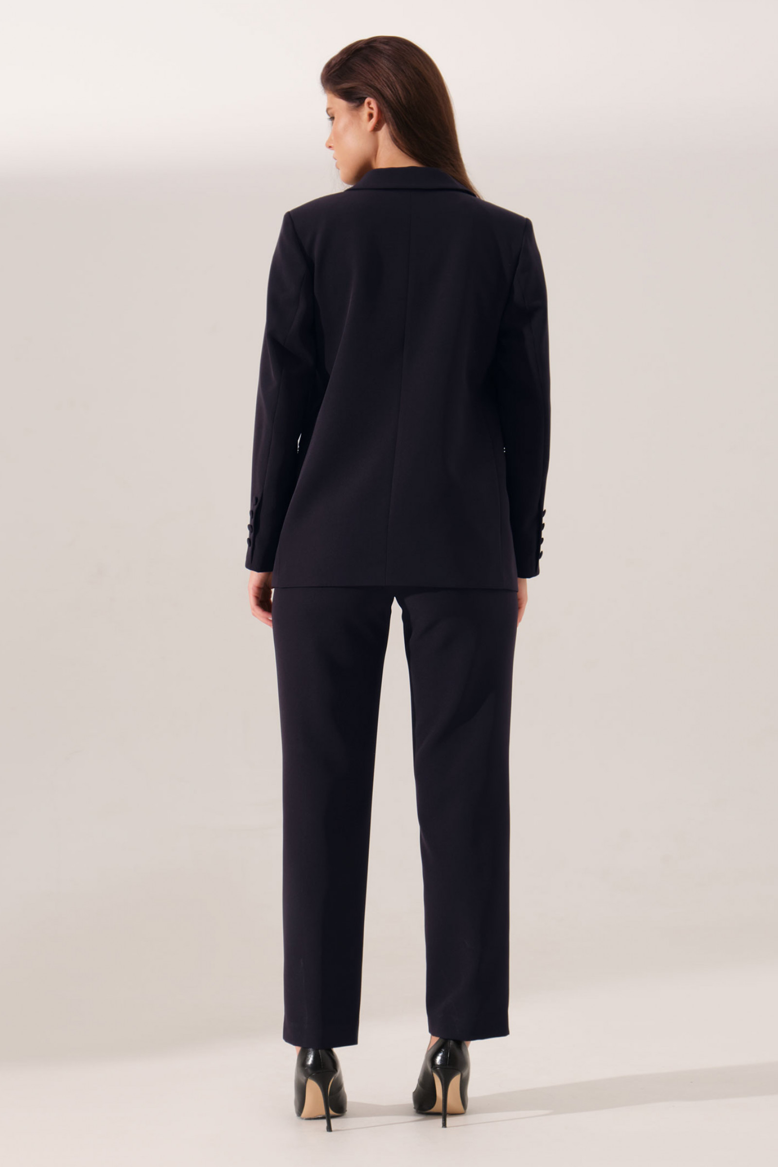 46 Жакет: Длина изделия - 68см, Длина рукава - 62см, Ширина плеча - 11.5см, Ширина по бедрам - 53см, Ширина по груди - 52см, Ширина рукава - 19см; Брюки: Высота посадки - 27.5см, Длина брюк без пояса - 104.5см, Длина по внутреннему шву - 82см, Ширина брючин сверху - 65см, Обхват брюк по низу - 39см, Ширина по бедрам - 51см, Ширина по талии - 37.5см;