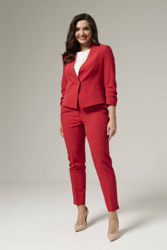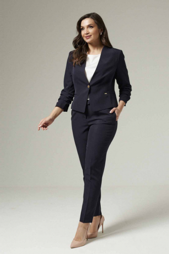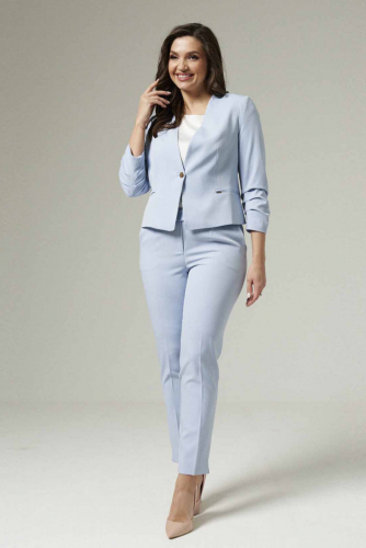 Стильный лаконичный брючный костюм. Жакет с застежкой на одну пуговицу. Жакет полуприлегающего силуэта, с V-образным вырезом горловины. По переду и по спинки имеются вытачки и рельефы, которые обеспечивают отличную посадку изделия по фигуре. Рукава втачные, длиной 3/4. Брюки классические на поясе, укороченые, с карманами по переду. Отличный вариант как для деловых встреч, так и для торжественных мероприятий.