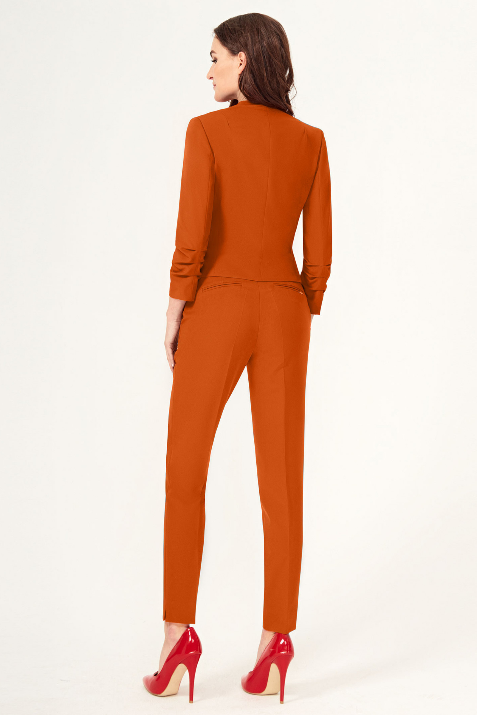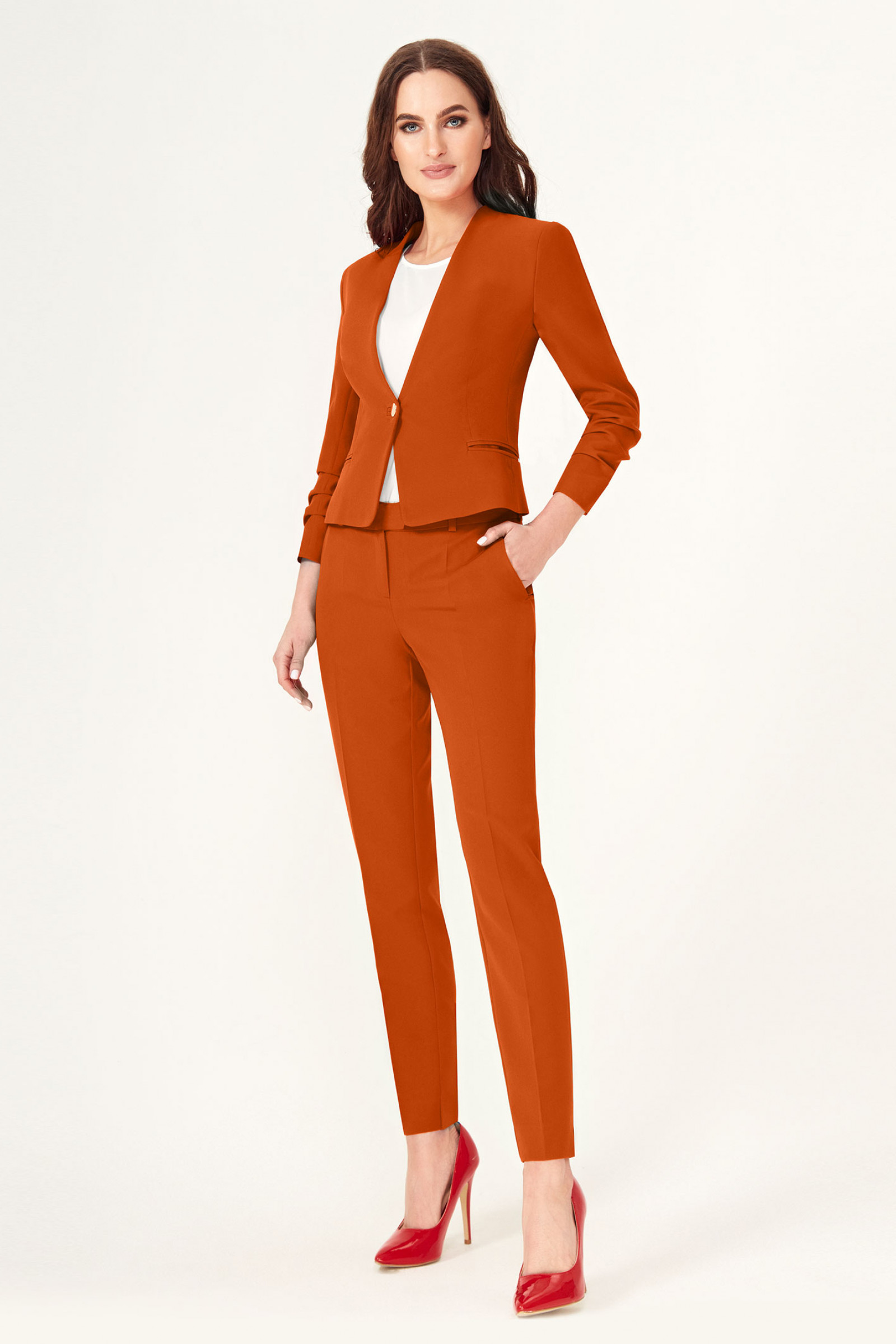 Стильный лаконичный брючный костюм. Жакет с застежкой на одну пуговицу. Жакет полуприлегающего силуэта, с V-образным вырезом горловины. По переду и по спинки имеются вытачки и рельефы, которые обеспечивают отличную посадку изделия по фигуре. Рукава втачные, длиной 3/4. Брюки классические на поясе, укороченые, с карманами по переду. Отличный вариант как для деловых встреч, так и для торжественных мероприятий.
