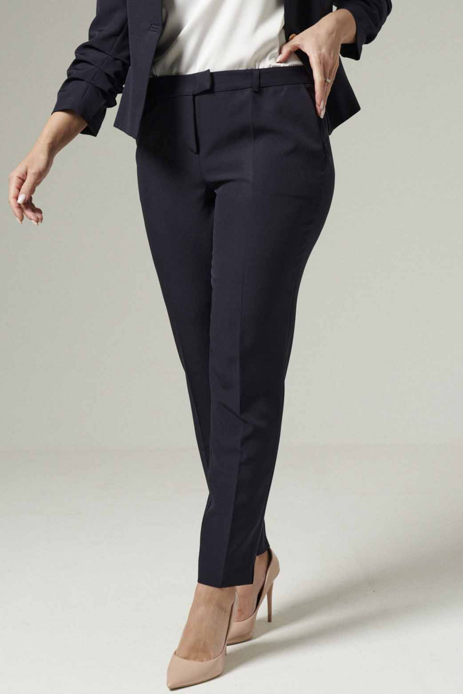 Классический женский костюм с лаконичным дизайном можно сочетать с блузками и рубашками. Укороченный однобортный пиджак без воротника дополнен присборенными рукавами3/4 и прорезными карманами в рамке на полочках. Пиджак приталенного силуэта образует V-образный вырез, когда застегнут на одну пуговицу. Прямые брюки с идеально отутюженными стрелками украшают наклонные карманы и широкий пояс.