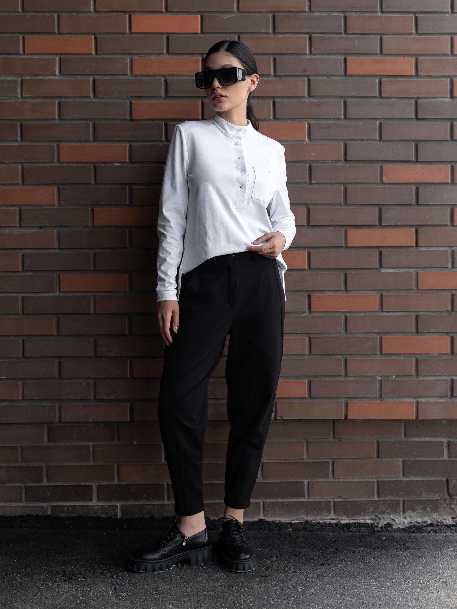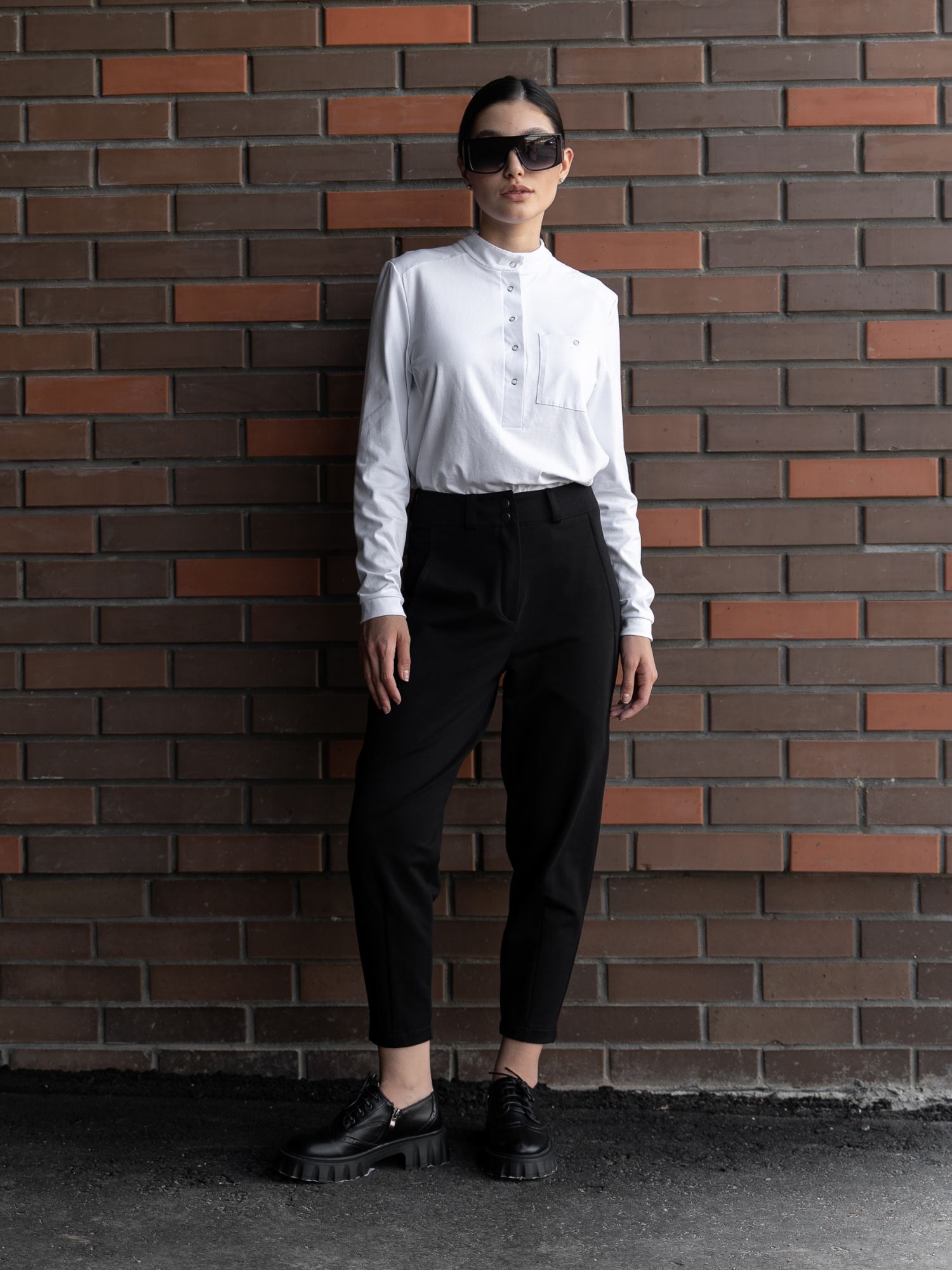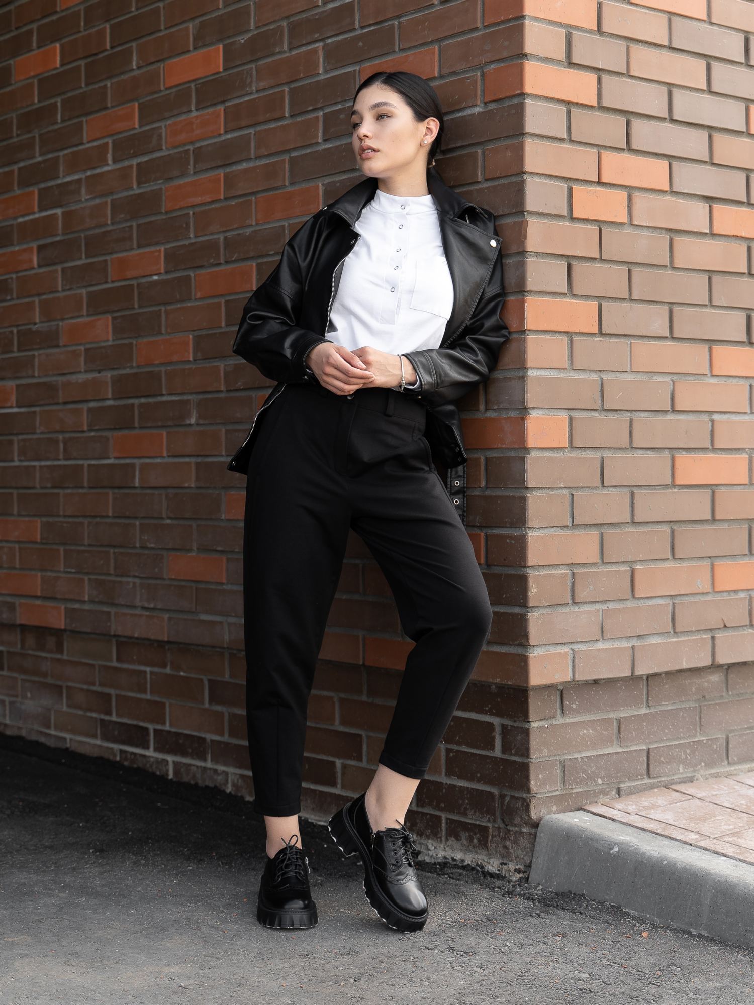 Женские брюки свободногог силуэта из футера черного цвета зауженные к низу, с боковыми карманами, с застежкой на молнию и кнопки. На задних половинках брюк имитация прорезных карманов с листочкой. Трикотажные бананы свободного силуэта - идеальная одежда для тех, кто ценит стиль и комфорт. Широкий диапазон размеров: подойдут от подростков до беременных и девушек в зрелом возрасте. Ткань мягкая и легкая, с высоким содержанием хлопка, поэтому брюки не сковывают движения и подойдут практически для любого случая: как для повседневного ношения, так и для работы в офисе или на праздник. Изделие выполнено из трикотажа премиального качества - ПЕНЬЕ, с содержанием хлопка более 92%