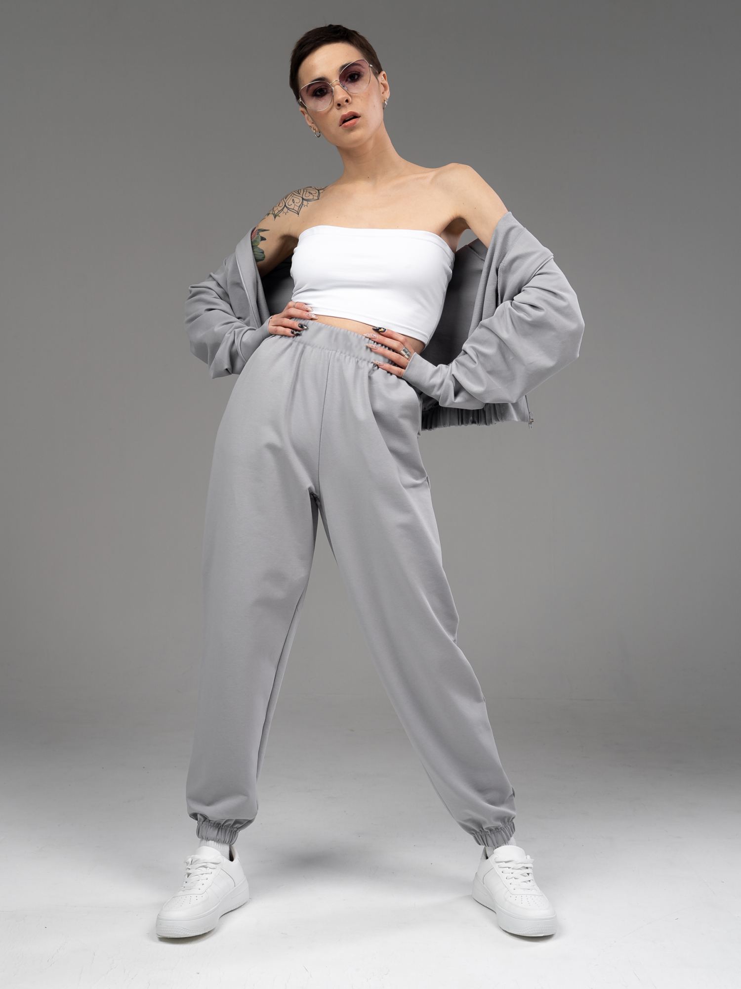 Женские брюки из футера серого цвета свободного силуэта с широким притачным поясом и боковыми карманами. По низу брюк - резинка. Изделие выполнено из трикотажа премиального качества - ПЕНЬЕ, с содержанием хлопка более 92%
