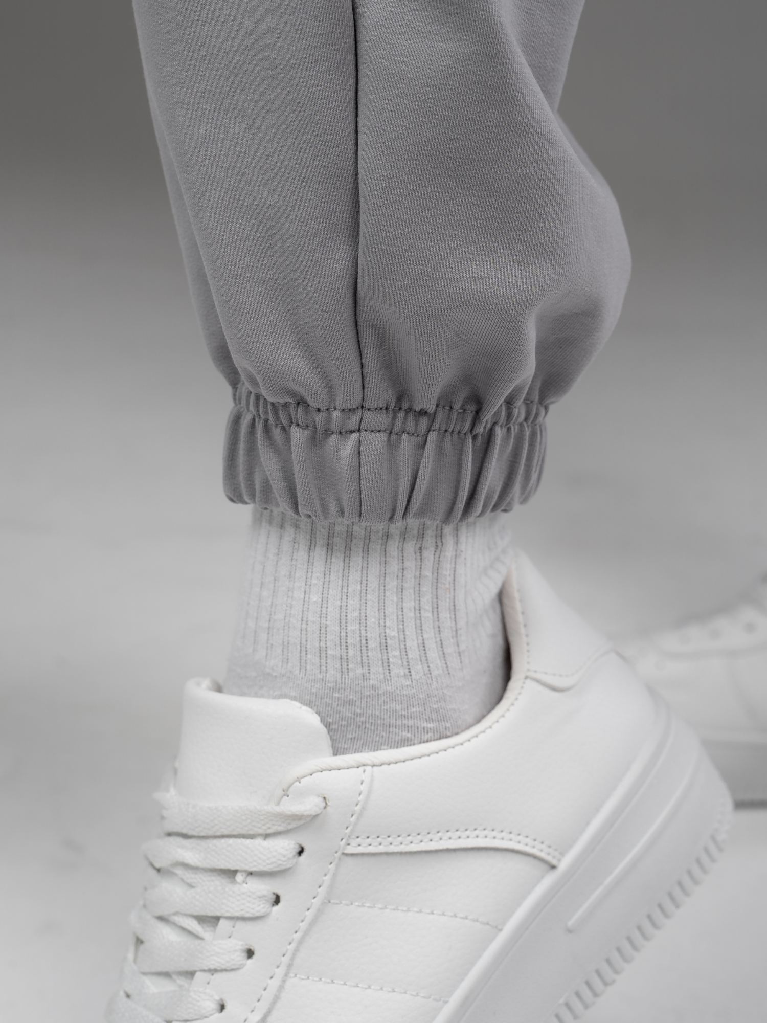 Женские брюки из футера серого цвета свободного силуэта с широким притачным поясом и боковыми карманами. По низу брюк - резинка. Изделие выполнено из трикотажа премиального качества - ПЕНЬЕ, с содержанием хлопка более 92%