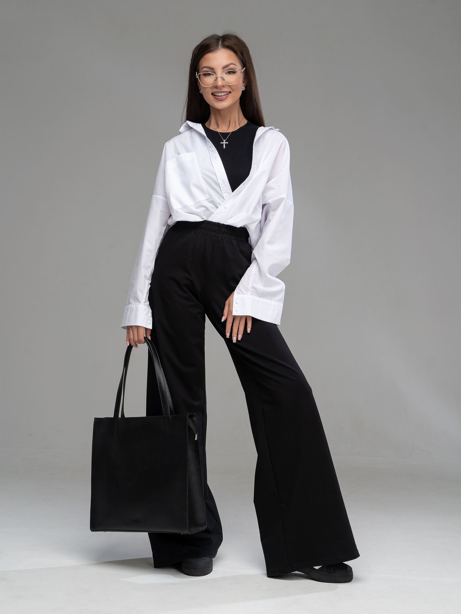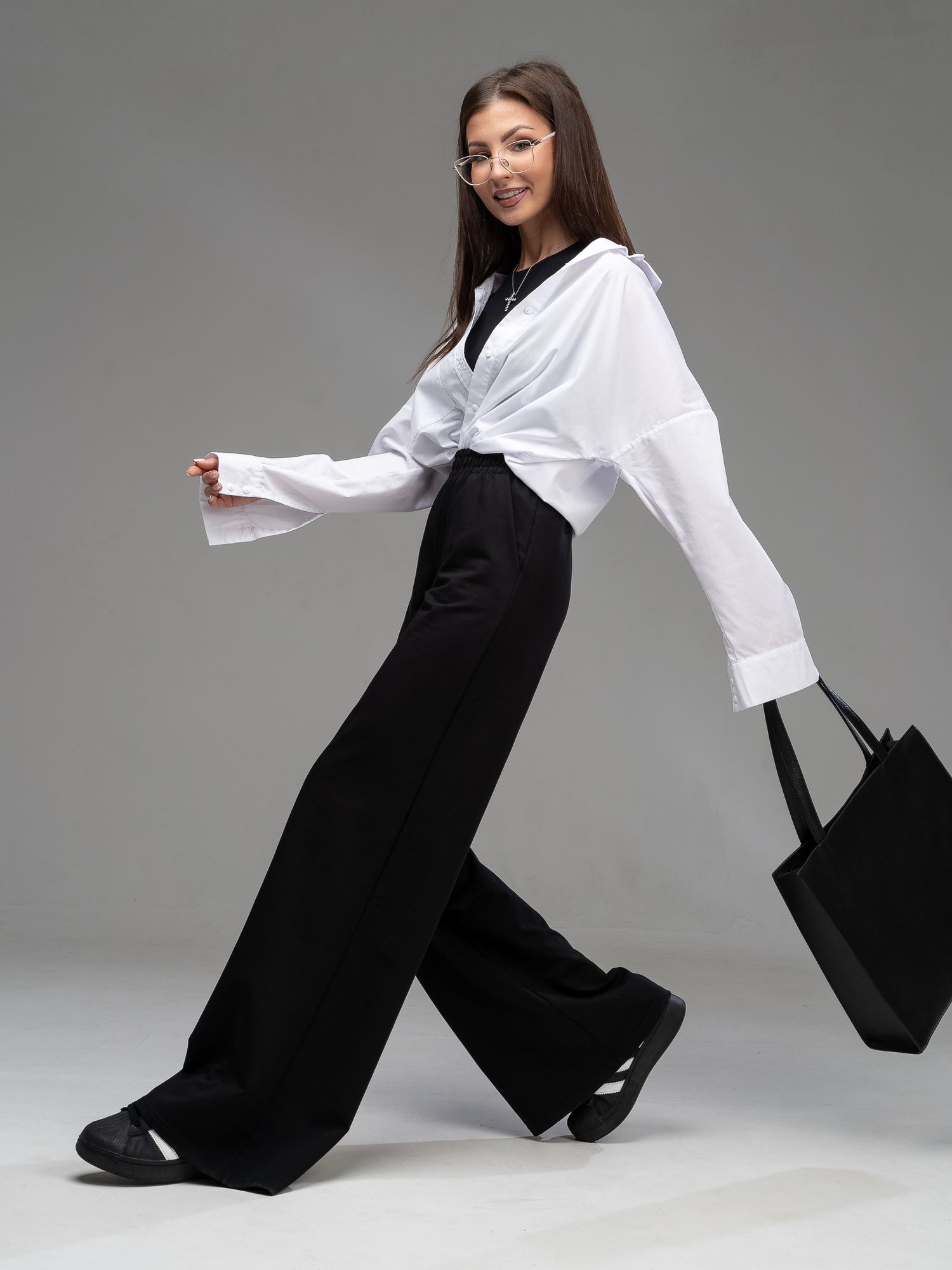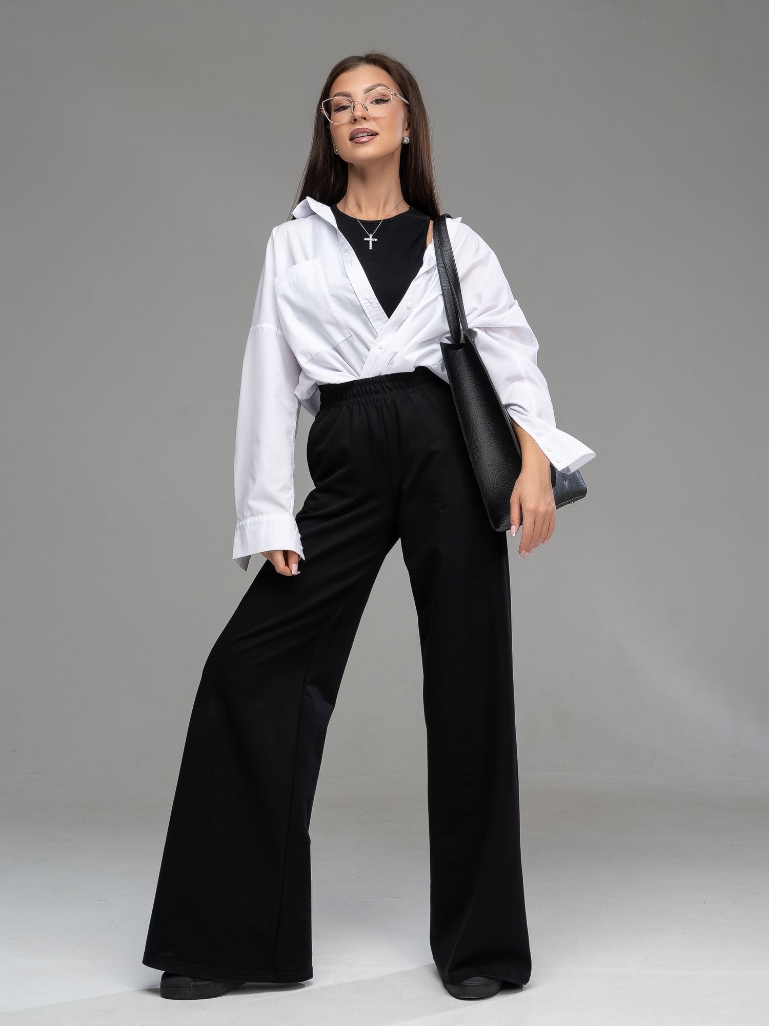 Женские широкие брюки-палаццо из футера черного цвета , с боковыми карманами. Завышенная линия талии, высокий пояс на эластичной резинке. Изделие выполнено из трикотажа премиального качества - ПЕНЬЕ, с содержанием хлопка более 92%