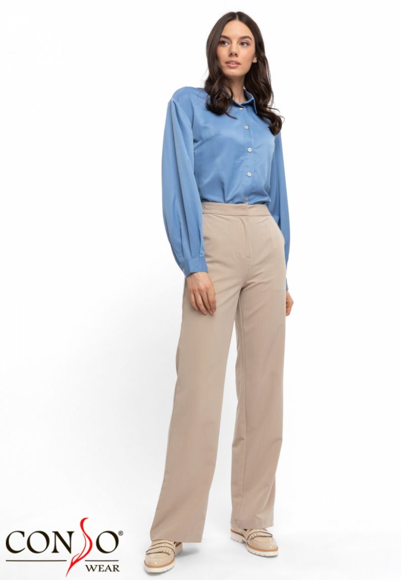 Расклешенные брюки высокой посадки. Модель с отрезным поясом, потайной молнией и застежкой-крючком. Брюки дополнены врезными карманами. Модель изготовлена из прочной ткани, приятной к телу. 75% полиэстер, 19% вискоза, 6% эластан