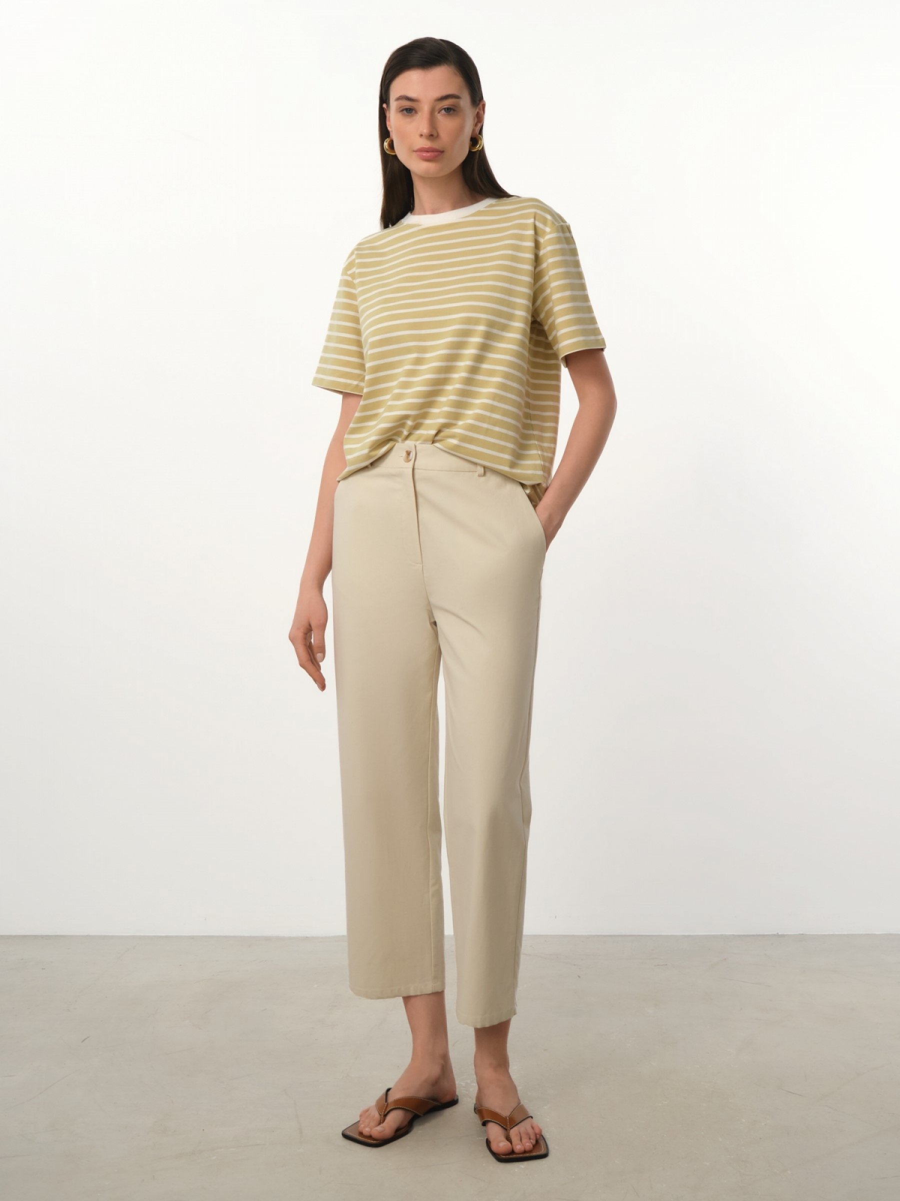 Элегантные укороченные брюки-бананы – универсальная модель, которая красиво смотрится на любой фигуре. Подчеркивает преимущества фигуры и гармонично вписывается во множество образов. Оформлена отрезным поясом со шлевками, боковыми прорезными карманами и одним задним карманом с листочкой на пуговице. Брюки застегиваются на пуговицу и потайную нейлоновую молнию в тон. Материал – плотная мягкая ткань на основе отборного хлопка с добавлением спандекса. Универсальный бежевый цвет – лаконичный и сочетается почти со всеми оттенками. 73% хлопок, 27% модал
