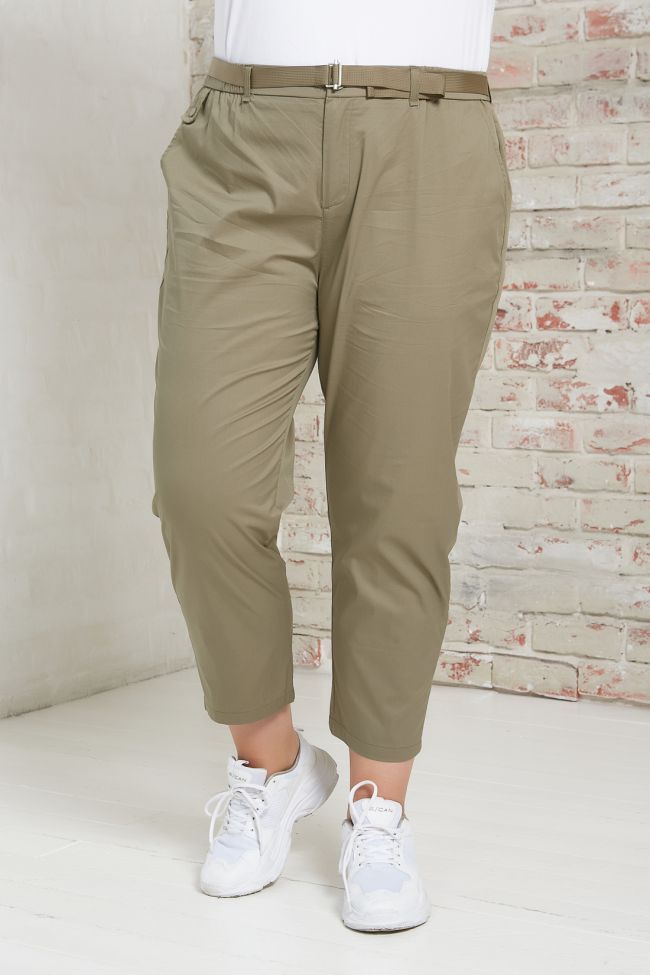 хаки Стильные укороченные брюки, с наклонными карманами по бокам и складками по талии. Выполнены из хлопковой брючной ткани. Модель с комфортной высокой посадкой и комбинированным поясом,  застежка - гульфик на молнию и пуговицу. На задних половинках прорезные карманы в рамку. Модель составит гармоничный комплект с однотонными и принтованными топами и блузами. Отличный вариант для стильного повседневного гардероба. В комплекте прилагается ремешок.Длина по внутреннему шву 63 см